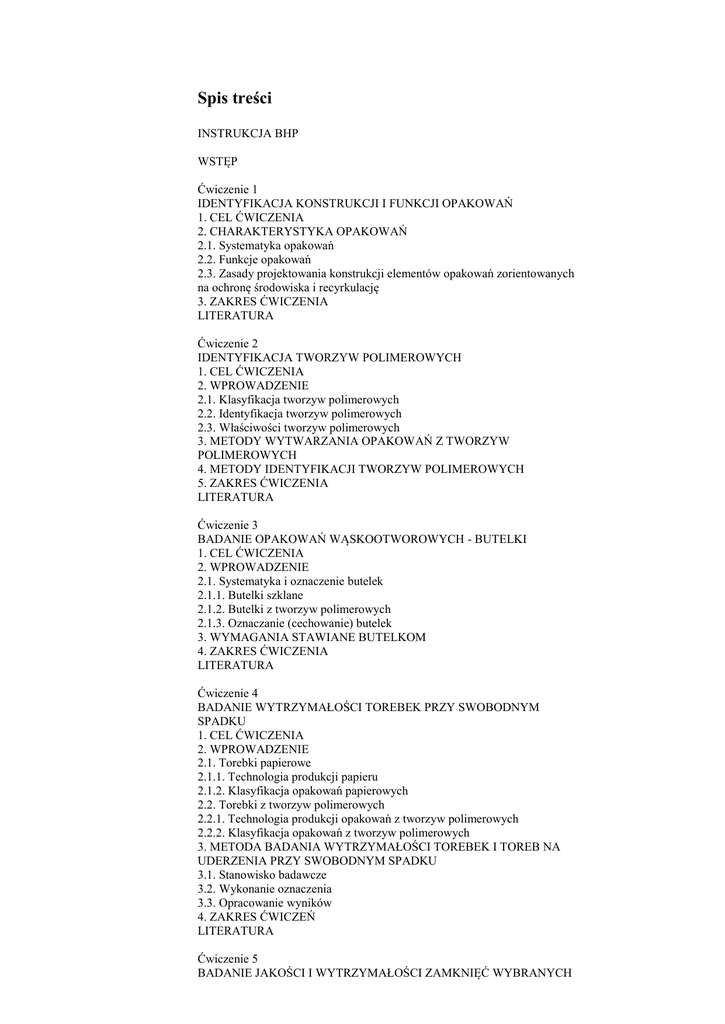 Spis treści INSTRUKCJA BHP WSTĘP Ćwiczenie 1 IDENTYFIKACJA KONSTRUKCJI I FUNKCJI OPAKOWAŃ 1. CEL ĆWICZENIA 2. CHARAKTERYSTYKA OPAKOWAŃ 2.1. Systematyka opakowań 2.2. Funkcje opakowań 2.3. Zasady projektowania konstrukcji elementów opakowań zorientowanych na ochronę środowiska i recyrkulację 3. ZAKRES ĆWICZENIA LITERATURA Ćwiczenie 2 IDENTYFIKACJA TWORZYW POLIMEROWYCH 1. CEL ĆWICZENIA 2. WPROWADZENIE 2.1. Klasyfikacja tworzyw polimerowych 2.2. Identyfikacja tworzyw polimerowych 2.3. Właściwości tworzyw polimerowych 3. METODY WYTWARZANIA OPAKOWAŃ Z TWORZYW POLIMEROWYCH 4. METODY IDENTYFIKACJI TWORZYW POLIMEROWYCH 5. ZAKRES ĆWICZENIA LITERATURA Ćwiczenie 3 BADANIE OPAKOWAŃ WĄSKOOTWOROWYCH - BUTELKI 1. CEL ĆWICZENIA 2. WPROWADZENIE 2.1. Systematyka i oznaczenie butelek 2.1.1. Butelki szklane 2.1.2. Butelki z tworzyw polimerowych 2.1.3. Oznaczanie (cechowanie) butelek 3. WYMAGANIA STAWIANE BUTELKOM 4. ZAKRES ĆWICZENIA LITERATURA Ćwiczenie 4 BADANIE WYTRZYMAŁOŚCI TOREBEK PRZY SWOBODNYM SPADKU 1. CEL ĆWICZENIA 2. WPROWADZENIE 2.1. Torebki papierowe 2.1.1. Technologia produkcji papieru 2.1.2. Klasyfikacja opakowań papierowych 2.2. Torebki z tworzyw polimerowych 2.2.1. Technologia produkcji opakowań z tworzyw polimerowych 2.2.2. Klasyfikacja opakowań z tworzyw polimerowych 3. METODA BADANIA WYTRZYMAŁOŚCI TOREBEK I TOREB NA UDERZENIA PRZY SWOBODNYM SPADKU 3.1. Stanowisko badawcze 3.2. Wykonanie oznaczenia 3.3. Opracowanie wyników 4. ZAKRES ĆWICZEŃ LITERATURA Ćwiczenie 5 BADANIE JAKOŚCI I WYTRZYMAŁOŚCI ZAMKNIĘĆ WYBRANYCH OPAKOWAŃ DO ŻYWNOŚCI 1. CEL ĆWICZENIA 2. WPROWADZENIE 2.1. Wybrane zamknięcia opakowań do żywności 3. METODA BADANIE WYTRZYMAŁOŚCI ZGRZEWÓW FOLII I MATERIAŁÓW WIELOWARSTWOWYCH 3.1. Wykonanie oznaczenia 3.2. Opracowanie wyników 4. ZAKRES ĆWICZEŃ 4.1. Badanie wytrzymałości zgrzewów materiałów wielowarstwowych 4.2. Badanie zamknięć wybranych typów opakowań do żywności LITERATURA Ćwiczenie 6 MIKRO- I MAKROSKOPOWA ANALIZA KONSTRUKCJI CHARAKTERYSTYCZNYCH ELEMENTÓW OPAKOWAŃ 1. CEL ĆWICZENIA 2. WPROWADZENIE 2.1. Budowa opakowań wielowarstwowych 3. BUDOWA I DOBÓR ZAMKNIĘĆ 4. ZGRZEWANIE I ZGRZEWY 5. ZAKRES ĆWICZENIA LITERATURA Ćwiczenie 7 BADANIE WYBRANYCH TECHNIK PAKOWANIA 1. CEL ĆWICZENIA 2. WPROWADZENIE 2.1.Podstawowe systemy pakowania 2.2. Nowoczesne techniki pakowania 2.2.1. Pakowanie próżniowe żywności (VAC) 2.2.2. Pakowanie w modyfikowanej atmosferze (MAP) 2.3. Materiały stosowane do pakowania próżniowego i modyfikowanej atmosfery 3. ZAKRES ĆWICZENIA 3.1. Pakowanie próżniowe wybranych produktów spożywczych 3.2. Analiza funkcjonalna urządzenia stosowanego w przemyśle spożywczym LITERATURA Ćwiczenie 8 BADANIE JAKOŚCI ZAMKNIĘCIA PUSZKI NA PODWÓJNĄ ZAKŁADKĘ 1. CEL ĆWICZENIA 2. WPROWADZENIE 2.1. Materiały do produkcji opakowań metalowych 2.2. Klasyfikacja puszek 2.3. Rodzaje zamknięć puszek 2.4. Lakiery stosowane do puszek 2.5. Produkcja puszek do napojów 2.6. Technologia zamykania puszek na podwójną zakładkę 2.6.1. Budowa zamykarki do puszek 2.6.2. Wady zamknięcia puszki 2.7. Metody kontroli i pomiarów jakości podwójnej zakładki 3. ZAKRES ĆWICZENIA LITERATURA Ćwiczenie 9 KOMPLEKSOWA OCENA JAKOŚCI OPAKOWAŃ 1. CEL ĆWICZENIA 2. WPROWADZENIE 2.1. Klasyfikacja opakowań 2.2. Ocena jakości opakowań 2.2.1. Ocena jakości opakowań papierowych 2.2.2. Ocena jakości opakowań szklanych 2.2.3. Ocena jakości opakowań metalowych 2.2.4. Ocena jakości opakowań z tworzyw polimerowych 2.3. Ocena opakowań w aspekcie marketingowo-promocyjnym 2.4. Ocena opakowań w aspekcie ekologicznym 3. ZAKRES ĆWICZENIA LITERATURA ISBN: 978-83-7365-310-8