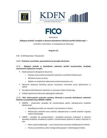 Seminarium „Najlepsze praktyki i narzędzia w obszarze dochodzenia należności portfela detalicznego” – 12.04.2011, hotel Hilton, ul. Grzybowska 63, Warszawa Program 1/2 9.30 - 10.00 Rejestracja / Poczęstunek 10.00 - Powitanie uczestników, wprowadzenie do porządku obrad dnia. 10:15 - Najlepsze praktyki w dochodzeniu należności portfeli konsumentów, przykłady zastosowania najlepszych narzędzi: • Wykorzystywanie dostępnych danych do: o Poprawy stanu przeterminowanych należności w portfelach detalicznych. o Obniżenia rezerw na straty. o Wpływu na zwiększenie spłaconych przeterminowanych sum. • Obniżenie ekspozycji bankowej poprzez stosowanie rachunków przed opóźnieniami w spłacie. • Zarządzanie dochodzeniem należności na wczesnym etapie monitoringu. • Praktyki ograniczania fałszerstw spłacających należności. 11.45 - Rola referencyjnych systemów wymiany informacji w procesie dochodzenia należności klientów na przykładzie bazy AMRON i SARFIN: • • AMRON - uniwersalne narzędzie do monitorowania jakości zabezpieczenia kredytów hipotecznych. o Weryfikacja trendów cen mieszkań i nieruchomości w Polsce. o Referencyjny wskaźnik oceny wartości zabezpieczenia w świetle ostatnich regulacji nadzoru bankowego. SARFIN - narzędzie do pozycjonowania i weryfikacji procesów rynkowych w obszarze sprzedaży kredytów, zarządzania ryzykiem i monitorowania opóźnień w spłacie należności w tym: o Miary ryzyka kredytowego - ocena skuteczności procesów windykacyjnych w Banku. o Pomoc przy określeniu celów strategii akwizycyjnych i marketingowych Banku. Seminarium „Najlepsze praktyki i narzędzia w obszarze dochodzenia należności portfela detalicznego” – 12.04.2011, hotel Hilton, ul. Grzybowska 63, Warszawa Program 2/2 12:30 Przerwa kawowa 12:45 - Studia przypadków bankowych klientów, w tym: • Praktyczne podejścia w dochodzeniu należności na poziomie klienta vs. Konta. • Wprowadzanie sprawdzonych rozwiązań dla niespłacanych kredytów hipotecznych (w tym w walutach obcych). • Zmniejszenie strat na niezabezpieczonym portfelu o np. 12%. • Skuteczność kontaktu przy użyciu kluczowych kanałów. 14:00 - Obiad 15:00 - Modelowanie systemu podejmowania decyzji i jego optymalizacja na poziomie każdego klienta: • Innowacje zapobiegające opóźnieniu w spłacie kredytów podczas ich monitoringu, we wczesnym stadium dochodzenia należności i restrukturyzacji kredytów. • Zmniejszenie strat na kredycie lub zwiększenie zysku netto to typowe cele optymalizacji. 16:00 – Zakończenie / pożegnanie
