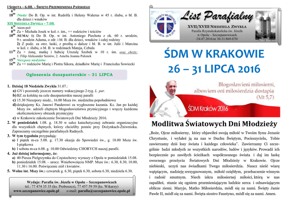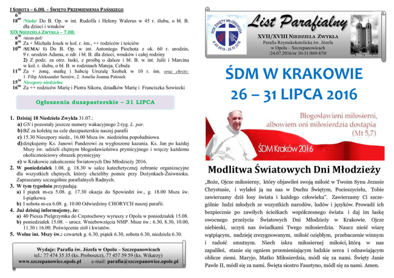 I SOBOTA – 6.08. – ŚWIĘTO PRZEMIENIENIA PAŃSKIEGO 630 1800 /Niedz/ Do B. Op. w int. Rudolfa i Heleny Walerus w 45 r. ślubu, o bł. B. dla dzieci i wnuków XIX NIEDZIELA ZWYKŁA – 7.08. 630 /niem-pol/ 830 Za + Michała Josek w kol. r. śm., ++ rodziców i teściów 1000 /SUMA/ 1) Do B. Op. w int. Antoniego Piechota z ok. 60 r. urodzin, 9 r. urodzin Adama, o zdr. i bł. B. dla dzieci, wnuków i całej rodziny 2) Z podz. za otrz. łaski, z prośbą o dalsze i bł. B. w int. Julii i Marcina w kol. r. ślubu, o bł. B. w rodzinach Mateja, Cebula 1130 Za + żonę, matkę i babcię Urszulę Szobek w 10 r. śm. oraz chrzty: 1. Filip Aleksander Seniów, 2. Amelia Joanna Palonek 1530 Nieszpory niedzielne 1600 Za ++ rodziców Marię i Piotra Sikora, dziadków Marię i Franciszka Sowiecki Ogłoszenia duszpasterskie – 31 LIPCA List Parafialny XVII/XVIII NIEDZIELA ZWYKŁA Parafia Rzymskokatolicka św. Józefa w Opolu – Szczepanowicach /24.07.2016/nr 30-31/869-870/ /nr 16/696 ŚDM W KRAKOWIE 26 – 31 LIPCA 2016 1. Dzisiaj 18 Niedziela Zwykła 31.07.: a) GN i pozostały jeszcze numery wakacyjnego 2-tyg. L. par. b) BZ za kolektę na cele duszpasterskie naszej parafii c) 15.30 Nieszpory niedz., 16.00 Msza św. niedzielna popołudniowa d) dziękujemy Ks. Janowi Panderowi za wygłoszone kazania. Ks. Jan po każdej 2. 3. 4. 5. Mszy św. udzieli chętnym błogosławieństwa prymicyjnego i wręczy każdemu okolicznościowy obrazek prymicyjny e) w Krakowie zakończenie Światowych Dni Młodzieży 2016. W poniedziałek 1.08. g. 18.30 w salce katechetycznej zebranie organizacyjne dla wszystkich chętnych, którzy chcieliby pomóc przy Dożynkach-Żniwnioku. Zapraszamy szczególnie parafialnych Radnych. W tym tygodniu przypadają: a) I piątek m-ca 5.08. g. 17.30 okazja do Spowiedzi św., g. 18.00 Msza św. I-piątkowa b) I sobota m-ca 6.08. g. 10.00 Odwiedziny CHORYCH naszej parafii. Już dzisiaj informujemy, że: a) 40 Piesza Pielgrzymka do Częstochowy wyruszy z Opola w poniedziałek 15.08. b) poniedziałek 15.08. – urocz. Wniebowzięcia NMP. Msze św.: 6.30, 8.30, 10.00, 11.30 i 16.00. Poświęcenie ziół i kwiatów. Wolne int. Mszy św.: czwartek g. 6.30, piątek 6.30, sobota 6.30, niedziela 6.30. Wydaje: Parafia św. Józefa w Opolu – Szczepanowicach tel.: 77 474 35 35 (ks. Proboszcz), 77 457 59 59 (ks. Wikarzy) www.szczepanowice.opole.pl e-mail: [email protected] Modlitwa Światowych Dni Młodzieży „Boże, Ojcze miłosierny, który objawiłeś swoją miłość w Twoim Synu Jezusie Chrystusie, i wylałeś ją na nas w Duchu Świętym, Pocieszycielu, Tobie zawierzamy dziś losy świata i każdego człowieka”. Zawierzamy Ci szczególnie ludzi młodych ze wszystkich narodów, ludów i języków. Prowadź ich bezpiecznie po zawiłych ścieżkach współczesnego świata i daj im łaskę owocnego przeżycia Światowych Dni Młodzieży w Krakowie. Ojcze niebieski, uczyń nas świadkami Twego miłosierdzia. Naucz nieść wiarę wątpiącym, nadzieję zrezygnowanym, miłość oziębłym, przebaczenie winnym i radość smutnym. Niech iskra miłosiernej miłości, którą w nas zapaliłeś, stanie się ogniem przemieniającym ludzkie serca i odnawiającym oblicze ziemi. Maryjo, Matko Miłosierdzia, módl się za nami. Święty Janie Pawle II, módl się za nami. Święta siostro Faustyno, módl się za nami. Amen. P ORZĄDEK M SZY Ś W . – N ABOŻEŃSTW 25 – 31 lipca PONIEDZIAŁEK – 25.07. – Święto Św. Jakuba, Apostoła, zakoń. ŚDM w Opolu 630 Za ++ dziadków Annę i Wacława Szydełko 900 Msza św. pożegnalna ŚDM w Opolu 1800 Za ++ rodziców Marię i Teodora Kansy, Marię i Alberta Moczko, rodzeństwo Annę, Edwarda i Marię WTOREK – 26.07. – UROCZYSTOŚĆ ŚW. ANNY, Światowe Dni Młodzieży w Krakowie 630 Za + męża Leona Lachnik, ++ rodziców, teściów, rodzeństwo obu stron, ++ szwagrów 1800 Za ++ Annę i Kazimierza Marciak, d.w.cz.c. ŚRODA – 27.07. – Św. Joachima, ojca NMP, Światowe Dni Młodzieży w Krakowie 630 1800 Za ++ rodziców Jana i Antoninę Mateja, pokr. Hajduk, Langosz, Zwettler CZWARTEK – 28.07. – Światowe Dni Młodzieży w Krakowie 630 Do MBNP z podz. za otrz. łaski, z prośbą o bł. B. w int. Gertrudy Kroll 1800 1) Za + męża, ojca i dziadka Wiktora Dudek, ++ pokr. Dudek, Walecko 2) Do B. Op. w int. Gerdy Wilczek, o zdr. i bł. B. dla dzieci i ich rodzin PIĄTEK – 29.07. – Św. Marty, Światowe Dni Młodzieży w Krakowie 630 Za ++ Witolda, rodziców obu stron, Marię i Andrzeja Schubert 1800 Z podz. za otrz. łaski z prośbą o bł. B. w int. Lucyny i Mariusza w kol. r. ślubu, o zdr. i bł. B. dla Maksymiliana i Kamila SOBOTA – 30.07. – Światowe Dni Młodzieży w Krakowie 630 Do B. Op. w int. Ireny Fischer w 80 r. urodzin 1800 /Niedz/ Za + Urszulę Gerc w 5 r. śm., ++ Adama, Władysława i Czesława Gerc XVIII NIEDZIELA ZWYKŁA – 31.07. – Zakoń. Światowych Dni Młodzieży w Krakowie 630 830 Do B. Op. z podz. za otrz. łaski, z prośbą o dalsze i bł. B. w int. Jerzego Sikora z ok. 85 r. urodzin 1000 /SUMA/ Do B. Op. w int. Ilony i Gerarda Malaka z ok. urodzin i bł. B. dla dzieci 1130 Do B. Op. w int. Krystyny i Marcina Kamińskich w 35 r. ślubu oraz roczki: 1530 Nieszpory niedzielne 1600 Do B. Op. w int. Klary Tanfal w 90 r. urodzin Ogłoszenia duszpasterskie – 24 LIPCA 1. Dzisiaj 17 Niedziela Zwykła 24.07.: a) GN i nowy nr wakacyjnego 2-tyg. L. par. b) BZ Ks. Prof. Dariuszowi Krokowi za wygłoszone kazania c) odpust w Chmielowicach i bł. Czesławie d) 15.30 niedz. naboż. ku czci św. Krzysztofa, 16.00 Msza św. popołudniowa. 2. DZISIAJ po wszystkich Mszach św. poświęcenie samochodów i błogosławieństwo kierowców. Chciejmy ponownie przyłączyć się do ogólnopolskiej CHARYTATYWNEJ Akcji „MIVA” wspierającej polskich Misjonarzy pracujących na różnych kontynentach, składając po poświęceniu samochodu 1 grosz za każdy bezwypadkowo przejechany kilometr! Właściciel pojazdu otrzyma wymowną pamią