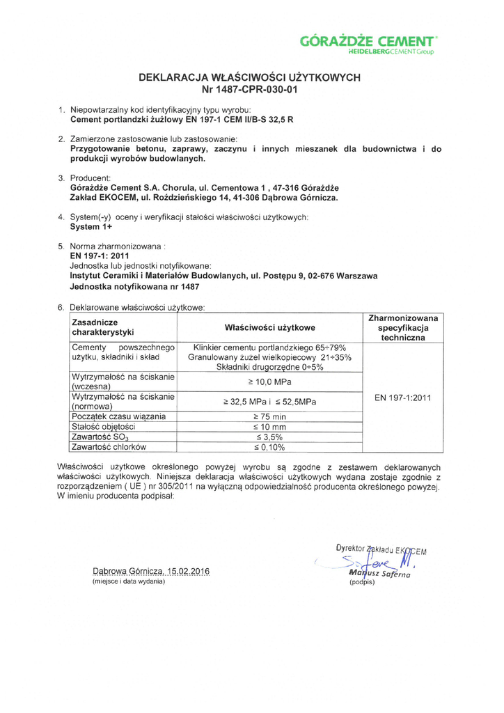 Deklaracja właściwości użytkowych dla cementu MULTI