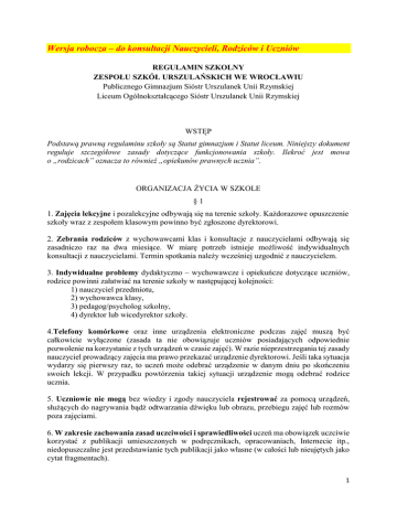 Wersja robocza – do konsultacji Nauczycieli, Rodziców i Uczniów REGULAMIN SZKOLNY ZESPOŁU SZKÓŁ URSZULAŃSKICH WE WROCŁAWIU Publicznego Gimnazjum Sióstr Urszulanek Unii Rzymskiej Liceum Ogólnokształcącego Sióstr Urszulanek Unii Rzymskiej WSTĘP Podstawą prawną regulaminu szkoły są Statut gimnazjum i Statut liceum. Niniejszy dokument reguluje szczegółowe zasady dotyczące funkcjonowania szkoły. Ilekroć jest mowa o „rodzicach” oznacza to również „opiekunów prawnych ucznia”. ORGANIZACJA ŻYCIA W SZKOLE §1 1. Zajęcia lekcyjne i pozalekcyjne odbywają się na terenie szkoły. Każdorazowe opuszczenie szkoły wraz z zespołem klasowym powinno być zgłoszone dyrektorowi. 2. Zebrania rodziców z wychowawcami klas i konsultacje z nauczycielami odbywają się zasadniczo raz na dwa miesiące. W miarę potrzeb istnieje możliwość indywidualnych konsultacji z nauczycielami. Termin spotkania należy wcześniej uzgodnić z nauczycielem. 3. Indywidualne problemy dydaktyczno – wychowawcze i opiekuńcze dotyczące uczniów, rodzice powinni załatwiać na terenie szkoły w następującej kolejności: 1) nauczyciel przedmiotu, 2) wychowawca klasy, 3) pedagog/psycholog szkolny, 4) dyrektor lub wicedyrektor szkoły. 4.Telefony komórkowe oraz inne urządzenia elektroniczne podczas zajęć muszą być całkowicie wyłączone (zasada ta nie obowiązuje uczniów posiadających odpowiednie pozwolenie na korzystanie z tych urządzeń w czasie zajęć). W razie nieprzestrzegania tej zasady nauczyciel prowadzący zajęcia ma prawo przekazać urządzenie dyrektorowi. Jeśli taka sytuacja wydarzy się pierwszy raz, to uczeń może odebrać urządzenie w danym dniu po skończeniu swoich lekcji. W przypadku powtórzenia takiej sytuacji urządzenie mogą odebrać rodzice ucznia. 5. Uczniowie nie mogą bez wiedzy i zgody nauczyciela rejestrować za pomocą urządzeń, służących do nagrywania bądź odtwarzania dźwięku lub obrazu, przebiegu zajęć lub rozmów poza zajęciami. 6. W zakresie zachowania zasad uczciwości i sprawiedliwości uczeń ma obowiązek uczciwie korzystać z publikacji umieszczonych w podręcznikach, opracowaniach, Internecie itp., niedopuszczalne jest przedstawianie tych publikacji jako własne (w całości lub nieujętych jako cytat fragmentach). 1 PRAWA I PRZYWILEJE UCZNIA §2 Uczeń ma prawo: 1. Być zwolnionym z zajęć lekcyjnych bezpośrednio przed konkursami i olimpiadami: 1) Wojewódzki Konkurs Przedmiotowy a) przed etapem rejonowym – 1 dzień, b) przed etapem wojewódzkim – 2 dni. 2) Ogólnopolska Olimpiada Przedmiotowa a) przed etapem okręgowym – 2 dni, b) przed etapem centralnym – 3 dni, c) czas na przygotowanie do etapu centralnego, po uzgodnieniu z nauczycielem prowadzącym i dyrektorem szkoły może ulec wydłużeniu. 2. Być zwolnionym z odpowiedzi ustnych i niezapowiedzianych kartkówek, gdy w danym dniu na apelu szkolnym zostanie wylosowany numer ucznia w dzienniku szkolnym, tzw. „SZCZĘŚLIWY NUMEREK”. Zwolnienie to nie obejmuje zapowiedzianych wcześniej prac pisemnych i zadań domowych. 1) Uczniowie mający „szczęśliwy numerek” w danym dniu powinni mieć identyfikatory z napisem „SZCZĘŚCIARZ” lub „SZCZĘŚCIARA”, które po skończonych lekcjach oddają do sekretariatu. Jeśli indentyfikator nie zostanie oddany, to dana klasa zostaje zawieszona w korzystaniu z tego przywileju, do momentu zwrotu identyfikatora. 2) Jeżeli osoba, której numer został wylosowany nie jest obecna na apelu lub nie ma regulaminowego stroju nie może korzystać z przywileju „szczęśliwego numerka”. 3. Mieć 3 dni robocze na nadrobienie zaległości po usprawiedliwionej nieobecności co najmniej tydzień. Przed lekcją należy ten fakt zgłosić nauczycielowi. 4. Być zwolnionym z weryfikacji wiadomości w następujące dni: 6 XII (św. Mikołaja), 21 III (pierwszy dzień wiosny), 1VI (Dzień Dziecka), 2 XI (Dzień Zaduszny). 5. Odpocząć od nauki, bez zadanej jakiejkolwiek pracy domowej, w czasie przerwy z racji świąt Bożego Narodzenia i Wielkanocy oraz w czasie ferii zimowych i letnich. 6. Uczniom klas pierwszych nie wpisuje się do dziennika ocen niedostatecznych z odpowiedzi ustnych i sprawdzianów przeprowadzonych w pierwszych dwóch tygodniach września. §3 STRÓJ SZKOLNY I WYGLĄD ZEWNĘTRZNY 1. Uczeń ma obowiązek przebywać na terenie szkoły w regulaminowym stroju szkolnym. 1) STRÓJ CODZIENNY a) UCZENNICE - biała bluzka polo z krótkim rękawem z logo szkoły (nie należy nosić pod bluzkami z krótkim rękawem innych bluzek z długim rękawem), - granatowy sweter z długim rękawem z logo szkoły (na czas chłodniejszy), - spódnica w kratę, - rajstopy czarne lub cieliste, - lekkie obuwie zmienne (nie klapki). 2 b) UCZNIOWIE - niebieska bluzka polo z krótkim rękawem z logo szkoły (nie należy nosić pod bluzkami z krótkim rękawem innych bluzek z długim rękawem), - granatowa bluza z logo szkoły z długim rękawem (na czas chłodniejszy), - spodnie dżinsy standardowe (w czasie letnim spodnie powinny zakrywać kolana), - lekkie obuwie zmienne (nie klapki). 2) STRÓJ GALOWY a) UCZENNICE - granatowa bluza z białym kołnierzem marynarskim, na którym są dwa paski (w gimnazjum), trzy paski (w liceum), - granatowa spódnica, - beżowe rajstopy, - czarne półbuty. b) UCZNIOWIE - garnitur w ciemnym kolorze, - biała koszula, - ciemnoszary krawat z logo szkoły, - ciemne buty wizytowe. 2. Strój galowy obowiązuje podczas ważnych świąt szkolnych, w szczególności: 1) w dniu rozpoczęcia i zakończenia roku szkolnego, 2) w święto patronalne szkoły św. Urszuli, 3) w Dniu Edukacji Narodowej, 4) w dniu świętowania imienin wychowawcy klasy, 5) w dniu wigilii klasowych i życzeń świątecznych przed Wielkanocą, 6) podczas egzaminów gimnazjalnych, maturalnych i poprawkowych, 7) w dni obchodów świąt państwowych i innych, określonych w terminarzu szkolnym, 8) podczas konkursów i olimpiad poza terene