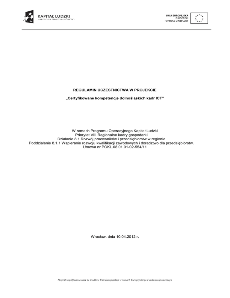REGULAMIN UCZESTNICTWA W PROJEKCIE „Certyfikowane kompetencje dolnośląskich kadr ICT” W ramach Programu Operacyjnego Kapitał Ludzki Priorytet VIII Regionalne kadry gospodarki Działanie 8.1 Rozwój pracowników i przedsiębiorstw w regionie Poddziałanie 8.1.1 Wspieranie rozwoju kwalifikacji zawodowych i doradztwo dla przedsiębiorstw. Umowa nr POKL.08.01.01-02-554/11 Wrocław, dnia 10.04.2012 r. Projekt współfinansowany ze środków Unii Europejskiej w ramach Europejskiego Funduszu Społecznego § 1 PRZEPISY OGÓLNE 1. Regulamin określa warunki uczestnictwa Beneficjentów Ostatecznych w ramach projektu „Certyfikowane kompetencje dolnośląskich kadr ICT” realizowanego w ramach Programu Operacyjnego Kapitał Ludzki, Priorytet VIII Regionalne kadry gospodarki, Działanie 8.1 Rozwój pracowników i przedsiębiorstw w regionie, Poddziałanie 8.1.1 Wspieranie rozwoju kwalifikacji zawodowych i doradztwo dla przedsiębiorstw. 2. Projekt jest współfinansowany przez Unię Europejską w ramach Europejskiego Funduszu Społecznego. 3. Wszystkie decyzje podejmowane w oparciu o regulamin są zgodne z umową nr WND-POKL. 08.01.0102-544/11 o dofinansowanie projektu „Certyfikowane kompetencje dolnośląskich kadr ICT” z dnia 30.03.2012 roku, zawartą pomiędzy Topas Sp. z o.o., a Dolnośląskim Wojewódzkim Urzędem Pracy w Wałbrzychu. 4. Okres realizacji projektu: 02.04.2012-30.09.2013 5. Obszar realizacji projektu: województwo dolnośląskie. § 2 SŁOWNIK POJĘĆ Użyte w niniejszym Regulaminie pojęcia, oznaczają: 1. Beneficjent/Wnioskodawca – Topas Sp. z o. o. 2. Instytucja Pośrednicząca – Dolnośląski Wojewódzki Urząd Pracy w Wałbrzychu 3. Beneficjent Ostateczny(BO)/Uczestnik Projektu (UP) – osoba zakwalifikowana zgodnie z zasadami określonymi w niniejszym regulaminie do udziału w Projekcie, bezpośrednio korzystająca z wdrażanych szkoleń 4. Projekt –Projekt „Certyfikowane kompetencje dolnośląskich kadr ICT” 5. PO KL – Program Operacyjny Kapitał Ludzki 6. Biuro Projektu: ul. Domaniewska 47/10, 02-672 Warszawa 7. Topas – Topas Sp. z o.o. § 3 CEL PROJEKTU Celem głównym projektu jest nabycie kompetencji zawodowych 210 osób w zakresie zaawansowanych umiejętności IT (analityków, architektów, programistów), pożądanych w ICT, w czasie wolnym od pracy. Cele szczegółowe projektu to: Wzrost kompetencji IT u 210 osób z max. średnim wykształceniem (42K/168M) Poszerzenie wiedzy i umiejętności IT u 210 osób z max. średnim wykształceniem (42K/168M) Zdobycie certyfikatów kompetencji zawodowych u 168 osób z max. średnim wykształceniem (34K/134M) Wzrost aktywności edukacyjnej u 158 osób z max. średnim wykształceniem (32K/126M) Podniesienie samooceny i wzrost motywacji zawodowej u 158 osób z max. średnim wykształceniem (32K/126M) Szkolenia będą trwały 8 godzin dziennie (sesje weekendowe) lub 4 godziny dziennie (pon.-pt.) poza godzinami pracy Uczestników. § 4 GRUPA DOCELOWA Projekt przewiduje przeprowadzenie szkoleń otwartych skierowanych do 210 osób (42K/168M), maksymalnie ze średnim wykształceniem, pracujących i/lub mieszkających na terenie województwa Projekt współfinansowany ze środków Unii Europejskiej w ramach Europejskiego Funduszu Społecznego dolnośląskiego. Szkolenia skierowane są do osób, które chcą podnieść swoje kompetencje zawodowe w zakresie zaawansowanych umiejętności IT (analityków, architektów, programistów). § 5 REKRUTACJA Proces rekrutacji przebiegać będzie zgodnie z zasadą równego traktowania płci odnosząca się do równości szans, praw, korzyści. 1. W Projekcie uczestniczy maksymalnie 210 osób. 2. Zasięg Projektu obejmuje obszar województwa dolnośląskiego. Rekrutację Uczestników przeprowadzi Specjalista ds. kontaktów i promocji, Karty zgłoszenia można przesyłać na adres mailowy: [email protected]. Informacje o projekcie można uzyskać pod numerem telefonu: 022 417 01 85 O przyjęciu Uczestnika do udziału w Projekcie decyduje spełnienie kryteriów formalnych określonych w dokumentach programowych POKL i wniosku o dofinasowanie Projektu. Do wzięcia udziału w Projekcie wymagane jest spełnienie następujących kryteriów: a. wykształcenie max. średnie b. zatrudnienie na podstawie um. o pracę/cywilno-prawnej (na podstawie zaświadczenia o zatrudnieniu) c. pozytywny wynik testu kompetencji ICT bazowych w odniesieniu do zakresu merytorycznego szkoleń ujętych w projekcie d. priorytet udziału w szkoleniach mają Uczestnicy nie mieszkający w aglomeracji wrocławskiej Do wzięcia udziału w projekcie wymagane jest wypełnienie następujących dokumentów: a. Umowa szkoleniowa b. Oświadczenie o zgodzie na przetwarzanie danych bez podpisania tej zgody uczestnictwo w Projekcie jest niemożliwe), c. oświadczenie Uczestnika Szkolenia o prawdziwości danych d. udokumentowanie statusu pracownika (zaświadczenie o zatrudnieniu), e. deklarację uczestnictwa w Projekcie, Wzory dokumentów do wypełnienia dostępne są na stronie internetowej Projektu: www.topas.com.pl Dodatkowo przed Szkoleniem Uczestnik będzie zobowiązany wypełnić ankietę ex-ante a po szkoleniu ankietę ewaluacyjną. Przeprowadzone zostaną również testy pomiaru wiedzy przed i po szkoleniu (test kompetencji). Każdy Uczestnik, po ukończeniu wybranej ścieżki szkoleniowej, będzie miał możliwość przystąpienia do egzaminu. Obecność Uczestnika Projektu i nabycie wiedzy/umiejętności z danego zakresu, będą poświadczone certyfikatem potwierdzającym zdanie egzaminu (na blankiecie producenta/twórcy technologii). W przypadku wyczerpania limitu miejsc na Szkolenie zostanie sporządzona rezerwowa lista osób, które będą przyjmowane priorytetowo na kolejną edycję. § 6 SZKOLENIA 1. Planowana wielkość grupy szkoleniowej: 10 osób. Szkolenia będą prowadzone poza godzinami pracy Uczestników. 2. W ramach projektu przeprowadzone zostaną następujące ścieżki szkoleniowe: Ścieżka 