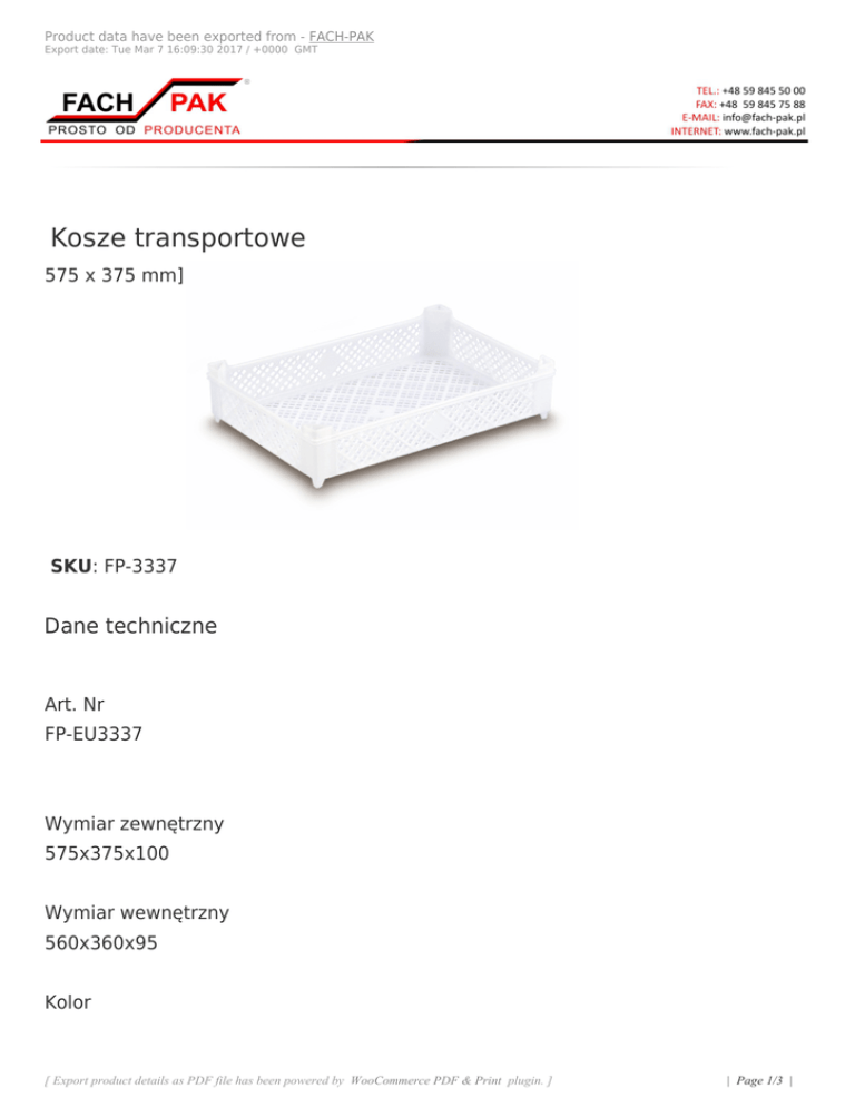 Product data have been exported from - FACH-PAK Export date: Tue Mar 7 16:09:30 2017 / +0000 GMT Kosze transportowe 575 x 375 mm] SKU: FP-3337 Dane techniczne Art. Nr FP-EU3337 Wymiar zewnętrzny 575x375x100 Wymiar wewnętrzny 560x360x95 Kolor [ Export product details as PDF file has been powered by WooCommerce PDF & Print plugin. ] | Page 1/3 | Product data have been exported from - FACH-PAK Export date: Tue Mar 7 16:09:30 2017 / +0000 GMT natur (biały) Pojemność w l 20 Ciężar w kg 1.2 Dno i ściany ażurowe Materiał HDPE Uchwyty brak Cena za sztukę w jednostce paletowej: 60,00 zł Jednostka opakowaniowa/paletowa: 60 Cena detaliczna (od 1-59 sztuk) 69,00 zł Opis produktu Kosze transportowe FACH-PAK nadają się szczególnie do transportu produktów przemysłu ciastkarskiego. Specjalne narożniki zapewniają bezpieczne sztaplowanie. [ Export product details as PDF file has been powered by WooCommerce PDF & Print plugin. ] | Page 2/3 | Product data have been exported from - FACH-PAK Export date: Tue Mar 7 16:09:30 2017 / +0000 GMT Dobre krążenie powietrza umożliwia optymalne chłodzenie lub podgrzewanie zawartości. Kolor standardowy: biały matowy Materiał: HDPE Zakres temperatur: -30°C do +60°C [ Export product details as PDF file has been powered by WooCommerce PDF & Print plugin. ] | Page 3/3 |