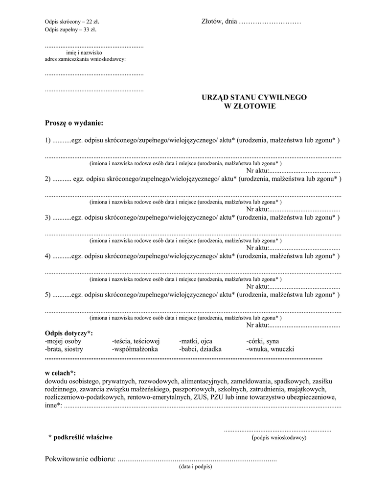Odpis skrócony – 22 zł. Odpis zupełny – 33 zł. Złotów, dnia ……………………… ......................................................... imię i nazwisko adres zamieszkania wnioskodawcy: ......................................................... ......................................................... URZĄD STANU CYWILNEGO W ZŁOTOWIE Proszę o wydanie: 1) ...........egz. odpisu skróconego/zupełnego/wielojęzycznego/ aktu* (urodzenia, małżeństwa lub zgonu* ) ........................................................................................................................................................................... (imiona i nazwiska rodowe osób data i miejsce (urodzenia, małżeństwa lub zgonu* ) Nr aktu:......................................... 2) ........... egz. odpisu skróconego/zupełnego/wielojęzycznego/ aktu* (urodzenia, małżeństwa lub zgonu* ) ........................................................................................................................................................................... (imiona i nazwiska rodowe osób data i miejsce (urodzenia, małżeństwa lub zgonu* ) Nr aktu:......................................... 3) ...........egz. odpisu skróconego/zupełnego/wielojęzycznego/ aktu* (urodzenia, małżeństwa lub zgonu* ) ........................................................................................................................................................................... (imiona i nazwiska rodowe osób data i miejsce (urodzenia, małżeństwa lub zgonu* ) Nr aktu:......................................... 4) ...........egz. odpisu skróconego/zupełnego/wielojęzycznego/ aktu* (urodzenia, małżeństwa lub zgonu* ) ........................................................................................................................................................................... (imiona i nazwiska rodowe osób data i miejsce (urodzenia, małżeństwa lub zgonu* ) Nr aktu:......................................... 5) ...........egz. odpisu skróconego/zupełnego/wielojęzycznego/ aktu* (urodzenia, małżeństwa lub zgonu* ) ........................................................................................................................................................................... (imiona i nazwiska rodowe osób data i miejsce (urodzenia, małżeństwa lub zgonu* ) Nr aktu:......................................... Odpis dotyczy*: -mojej osoby -teścia, teściowej -matki, ojca -córki, syna -brata, siostry -współmałżonka -babci, dziadka -wnuka, wnuczki ................................................................................................................................................................ w celach*: dowodu osobistego, prywatnych, rozwodowych, alimentacyjnych, zameldowania, spadkowych, zasiłku rodzinnego, zawarcia związku małżeńskiego, paszportowych, szkolnych, zatrudnienia, majątkowych, rozliczeniowo-podatkowych, rentowo-emerytalnych, ZUS, PZU lub inne towarzystwo ubezpieczeniowe, inne*: ................................................................................................................................................................ .............................................................. (podpis wnioskodawcy) * podkreślić właściwe Pokwitowanie odbioru: .................................................................................... (data i podpis)