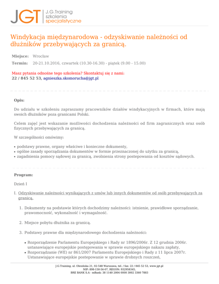 Windykacja międzynarodowa - odzyskiwanie należności od dłużników przebywających za granicą. Miejsce: Wrocław Termin: 20-21.10.2016, czwartek (10.30-16.30) - piątek (9.00 - 15.00) Masz pytania odnośne tego szkolenia? Skontaktuj się z nami: 22 / 845 52 53, [email protected] Opis: Do udziału w szkoleniu zapraszamy pracowników działów windykacyjnych w firmach, które mają swoich dłużników poza granicami Polski. Celem zajęć jest wskazanie możliwości dochodzenia należności od firm zagranicznych oraz osób fizycznych przebywających za granicą. W szczególności omówimy: ● ● ● podstawy prawne, organy właściwe i konieczne dokumenty, ogólne zasady sporządzania dokumentów w formie przeznaczonej do użytku za granicą, zagadnienia pomocy sądowej za granicą, zwolnienia strony postepowania od kosztów sądowych. Program: Dzień I I. Odzyskiwanie należności wynikających z umów lub innych dokumentów od osób przebywających za granicą. 1. Dokumenty na podstawie których dochodzimy należności: istnienie, prawidłowe sporządzanie, prawomocność, wykonalność i wymagalność. 2. Miejsce pobytu dłużnika za granicą. 3. Podstawy prawne dla międzynarodowego dochodzenia należności: ■ ■ Rozporządzenie Parlamentu Europejskiego i Rady nr 1896/2006r. Z 12 grudnia 2006r. ustanawiające europejskie postępowania w sprawie europejskiego nakazu zapłaty, Rozporządzanie (WE) nr 861/2007 Parlamentu Europejskiego i Rady z 11 lipca 2007r. Ustanawiające europejskie postepowanie w sprawie drobnych roszczeń, J.G.Training, ul. Olesińska 21, 02-548 Warszawa, tel. / fax: 22 / 845 52 53, www.jgt.pl NIP: 898-150-56-07, REGON: 932958345, BRE BANK S.A - mBank: 38 1140 2004 0000 3002 3360 7883 ■ ■ ■ ■ ■ Rozporządzenie Parlamentu Europejskiego i Rady nr 805/2004 z 21 kwietnia 2004r. W sprawie utworzenia Europejskiego Tytułu Egzekucyjnego dla roszczeń bezspornych, Rozporządzenie Rady (WE) nr 1215/2012 z dnia z dnia 12 grudnia 2012 r. w sprawie jurysdykcji i uznawania orzeczeń sądowych oraz ich wykonywania w sprawach cywilnych i handlowych, Konwencja o jurysdykcji i wykonywaniu orzeczeń sądowych w sprawach cywilnych i handlowych, Lugano 16 września 1988r., Europejska Sieć Sądownicza ds. cywilnych i handlowych, utworzona na podstawie Decyzji Rady Unii Europejskiej z 28 maja 2001(201/470/CE), Europejski Atlas Sądowniczy. 4. Wszczęcie procedury, gdy dłużnik przebywa za granicą: ■ ■ Wybór podstawy prawnej, Organy właściwe i dokumenty konieczne do rozpoczęcia procesu egzekucji należności. 5. Przebieg postępowania w różnych państwach na terenie UE. 6. Przebieg postepowania w różnych państwach poza UE. Dzień II I. Sporządzanie dokumentów międzynarodowych. 1. Ogólne zasady sporządzania dokumentów w formie przeznaczonej do użytku za granicą. 2. Wymagania formalne dla poszczególnych podstaw prawnych zgodnie z którymi dochodzimy należności. II. Pomoc sądowa za granicą, zagadnienia zwolnienia strony postepowania od kosztów sądowych: 1. Dyrektywa rady nr 2003/8/WE z 27 stycznia 2003r. w celu usprawnienia dostępu do wymiaru sprawiedliwości w sporach transgranicznych poprzez ustanowienie minimalnych wspólnych zasad odnoszących się do pomocy prawnej w sporach o tym charakterze. 2. Konwencja haska dotycząca procedury cywilnej z 1 marca 1954r. 3. Konwencja o ułatwianiu dostępu do wymiaru sprawiedliwości w stosunkach międzynarodowych, Haga 25 październik 1980 r. 4. Umowy dwustronne. III. Pytania, dyskusja, wyjaśnianie wątpliwości. Wykładowca: Pracownik sądu okręgowego, gdzie kieruje sekcją obrotu prawnego z zagranicą. Prowadzi szkolenia m.in. dla pracowników sądów, kancelarii prawnych, radców prawnych. Posiada doświadczenie w J.G.Training, ul. Olesińska 21, 02-548 Warszawa, tel. / fax: 22 / 845 52 53, www.jgt.pl NIP: 898-150-56-07, REGON: 932958345, BRE BANK S.A - mBank: 38 1140 2004 0000 3002 3360 7883 obsłudze prawnej podmiotów gospodarczych przy odzyskiwaniu należności od partnerów biznesowych zza granicy. Miejsce: Sala szkoleniowa w centrum Wrocławia, dogodny dojazd z Dworca Głównego, liczne hotele w bliskiej odległości od miejsca szkolenia. Na 4 dni robocze przed planowanym terminem szkolenia skontaktujemy się z Państwem i przekażemy szczegółowe informacje na temat miejsca szkolenia. Cena: 1190,00 zł + 23% VAT = 1463,70 zł brutto 1190,00 zł + VAT zw = 1190,00 zł brutto - w przypadku, gdy udział w szkoleniu jest finansowany co najmniej w 70% ze środków publicznych. Cena obejmuje: wykłady, materiały szkoleniowe, serwis kawowy, lunch, certyfikat ukończenia szkolenia, możliwość konsultacji poszkoleniowych. Cena nie obejmuje noclegu. Jest możliwość doliczenia kosztów noclegu do ceny szkolenia. W przypadku zainteresowania rezerwacją hotelu prosimy o kontakt. Informacje o hotelach znajdujących się w pobliżu miejsca szkolenia podajemy również w zakładce "miejsce". J.G.Training, ul. Olesińska 21, 02-548 Warszawa, tel. / fax: 22 / 845 52 53, www.jgt.pl NIP: 898-150-56-07, REGON: 932958345, BRE BANK S.A - mBank: 38 1140 2004 0000 3002 3360 7883