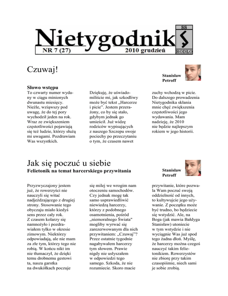 Czuwaj! Stanisław Petroff Słowo wstępu To czwarty numer wydany w ciągu minionych dwunastu miesięcy. Nieźle, wziąwszy pod uwagę, że do tej pory wychodził jeden na rok. Wraz ze zwiększeniem częstotliwości pojawiają się też ludzie, którzy służą mi uwagami. Pozdrawiam Was wszystkich. Dziękuję, że uświadomiliście mi, jak szkodliwy może być tekst „Harcerze i picie”. Jestem przerażony, co by się stało, gdybym jednak go umieścił. Już widzę rodziców wypisujących z naszego Szczepu swoje pociechy po przeczytaniu o tym, że czasem nawet zuchy wchodzą w picie. Do dalszego prowadzenia Nietygodnika skłania mnie chęć zwiększenia częstotliwości jego wydawania. Mam nadzieję, że 2010 nie będzie najlepszym rokiem w jego historii. Jak się poczuć u siebie Felietonik na temat harcerskiego przywitania Przyzwyczajony jestem już, że rowerzyści nie nauczyli się witać nadjeżdzającego z drugiej strony. Stosowanie tego obyczaju miało kiedyś sens przez cały rok. Z czasem kolarzy się namnożyło i pozdrawiałem tylko w okresie zimowym. Niektórzy odpowiadają, ale nie mam za złe tym, którzy tego nie robią. W końcu nikt im nie tłumaczył, że dzięki temu drobnemu gestowi ta, nasza garstka na dwukółkach poczuje się milej we wrogim nam otoczeniu samochodów. Czy jednak mogę tak samo usprawiedliwić niewiedzą harcerzy, którzy z podobnego osamotnienia, pośród „niemoralnego Świata" mogliby wyrwać się zarezerwowanym dla nich przywitaniem: „Czuwaj”? Przez ostatnie tygodnie nagabywałem harcerzy tym słowem. Prawie nigdy nie usłyszałem w odpowiedzi tego samego. Szkoda, że nie rozumiecie. Skoro macie Stanisław Petroff przywitanie, które pozwala Wam poczuć swoją oddzielność od innych, to kultywujcie jego używanie. Z początku może być trudno, bo będziecie się wstydzić. Ale, na Boga (jak mawia Bałdyga Stanisław) utoniecie w tym wstydzie i nie wyciągnie Was już spod tego żadna dłoń. Myślę, że harcerzy można czegoś nauczyć takim felietonikiem. Rowerzystów nie zbiorę przy takim czasopiśmie, niech sami je sobie zrobią. Liczyłem na Konora Marcin Delura o tworzeniu nowej jednostki, po 3ech latach dowodzenia 88WDH-y. Oddałeś drużynę. Czemu? Mój czas minął Przewidywałem taką odpowiedź. To może inaczej. Napracowałem się przez te 3 lata. Zrobiłem to, co chciałem. Dalej robienie tego byłoby siedzeniem na urzędzie Nie uważasz, jak mówił Paweł Rączka w wywiadzie z czerwca, że już dawno się wypaliliście. Nie myślę tak. Więc ile siły Ci zostało i na co? Nie ma co robić kampanii reklamowej. Może właśnie potraktuj ten wywiad, jako dobre miejsce na to. Mówiłem już przy różnych okazjach, że jak ktoś chce, to zapraszam do współpracy. Nie ma mnóstwa starych, byłych harcerzy, którzy by się zgłosili. Jest grupa widząca tu swoją możliwość. Chcą robić coś nie tylko jako uczestnicy, ale też twórcy. Zbieram tych ludzi. Jaką metoda? Istnieją potencjalni wędrownicy. Nie chodzi o zrobienie ich z ludzi na siłę. Nie jest tak, jak w przypadku naboru młodszych drużyn, że szuka się ludzi. Tu potrzeba kogoś, kto już jest chętny. Czyli kto? Starsi z Rodła: Mańki, Kwiatek, Maurycy, też Świstak, Hochla. Hochla na razie nie może. A jaki jest cel tego zgarniania? Robienie razem rzeczy, które bardziej lub mniej jarają, wyjazd do jakiegoś miasta, na bunkry, wycieczka kajakami, czy rowerami. Zimą na rowerach! Nie, raczej nie na rowerach. Jak byłem uczony, żeby jako wędrownik stawiać sobie duże wyzwanie. Możesz też wyjść nago na dwór. Będzie to jakieś wyzwanie? To kiedy wsiądziecie na rowery? Rozumiem, że się uczepiłeś rowerów, bo sam w tym siedzisz, ale wymieniłem parę rzeczy, które możemy robić. Nie jesteśmy jakimiś fakin maniakami rowerzystami. Kto jest dla Ciebie najważniejszy we współpracy? Liczyłem na Konora, ale starsze osoby są dość zajęte. Młodsze mniej. Wiadomo. Odeszli przyboczni. Żałujesz? Ta pustka jest nie do zastąpienia. (Śmiech). Żałuję, bo chciałem robić to z nimi, ale nie mam przecież do nich żalu. Na kim się teraz opierasz? Merytorycznie na Krzyśku Mańku. Ale wiadomo, że nie będę go nudniejszymi rzeczami obarczał. Organizacyjnymi, jak telefony związane z przygotowaniem planu pracy. paki już sobie radzą sami. Przekazanie nastąpi przed zimowiskiem, w styczniu Wracając do wywiadu czerwcowego z Pawłem. Nie czujesz, że jednak miał on rację i lepiej dać spokój w pewnym momencie. Robisz coś, co jak mówił Pol w Nietygodniku z listopada, nie udało się na razie nikomu. Tamtego numeru nie czytałem, tylko przeglądałem. Więc nie wiem o czym Pol mówił konkretnie. Możesz sprawdzić tamten numer Po obozie oddałeś drużynę. To tej pory nie zrobiliście jednak formalnego przekazania. Dzięki temu nie było takiej sytuacji, że chłopaki wracają z obozu i wskakują w nowe role, jeśli dopiero co zajmowali się prowadzeniem zastępów. Przekazanie nastąpi przed zimowiskiem, w styczniu. I chyba często tak się robi. Na przykład jak ja przejąłem drużynę. Choć wtedy byłem jedyny w kadrze i Rączka trochę mi pomagał. A teraz chło- na stronie: nietygodnik.pl Wspominał o Michale Rączce i jego nieudanym eksperymencie. Wcale nie uważam, żeby Michałowi nie udało się prowadzenie pionu starszego. Działaliśm rok. Zorganizowaliśmy rowerowy wyjazd letni, Rajd Dreszczyk i zimowisko narciarskie na Słowacji. ry wniósł własną wizję 88y. Odejście od formy militarno-lotniczej na rzecz fantazy-rpg. Brak kartonówek i wyjazdów do Góraszki, za to gry w Aliena i klimaty postapokaliptyczne, które też kontynuują teraz chłopaki. W zawodach kartonówek mieliśmy raz wziąć udział udział. A pierwszy klimamaty w stylu LARP (gry fabularnej na żywo- przyp red.) wprowadził tak naprawdę Wieloryb, kiedy był moim zastępowym. Myślę, że każdy zastępowy, czy drużynowy, który ma inwencję robi