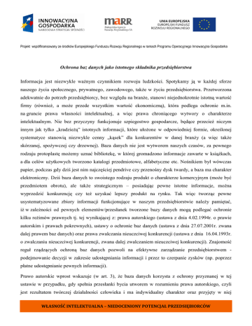 Projekt współfinansowany ze środków Europejskiego Funduszu Rozwoju Regionalnego w ramach Programu Operacyjnego Innowacyjna Gospodarka Ochrona baz danych jako istotnego składnika przedsiębiorstwa Informacja jest niezwykle ważnym czynnikiem rozwoju ludzkości. Spotykamy ją w każdej sferze naszego życia społecznego, prywatnego, zawodowego, także w życiu przedsiębiorstwa. Przetworzona adekwatnie do potrzeb przedsiębiorcy, bez względu na branże, stanowi niejednokrotnie istotną wartość firmy (również, a może przede wszystkim wartość ekonomiczną), która podlega ochronie m.in. na gruncie prawa własności intelektualnej, a więc prawa chroniącego wytwory o charakterze intelektualnym. Nie bez przyczyny funkcjonuje szpiegostwo gospodarcze, będące przecież niczym innym jak tylko „kradzieżą” istotnych informacji, które ułożone w odpowiedniej formie, określonej systematyce stanowią niezwykle cenny „kąsek” dla konkurentów w danej branży (a więc także skórzanej, spożywczej czy drzewnej). Baza danych nie jest wytworem naszych czasów, za pewnego rodzaju protoplastę możemy uznać bibliotekę, w której gromadzono informacje zawarte w książkach, a dla celów użytkowych tworzono katalogi przedmiotowe, alfabetyczne etc. Nośnikiem był wówczas papier, podczas gdy dziś jest nim najczęściej pendrive czy przenośny dysk twardy, a baza ma charakter elektroniczny. Dziś baza danych to swoistego rodzaju produkt o charakterze komercyjnym (może być przedmiotem obrotu), ale także strategicznym – posiadając pewne istotne informacje, można wyprzedzić konkurencję czy też uzyskać lepszy produkt na rynku. Tak więc tworząc pewne usystematyzowane zbiory informacji funkcjonujące w naszym przedsiębiorstwie należy pamiętać, iż w zależności od pewnych elementów/przesłanek tworzone bazy danych mogą podlegać ochronie kilku reżimów prawnych tj. tej wynikającej z: prawa autorskiego (ustawa z dnia 4.02.1994r. o prawie autorskim i prawach pokrewnych), ustawy o ochronie baz danych (ustawa z dnia 27.07.2001r. zwana dalej prawem baz danych) oraz prawa zwalczania nieuczciwej konkurencji (ustawa z dnia 16.04.1993r. o zwalczaniu nieuczciwej konkurencji, zwana dalej zwalczaniem nieuczciwej konkurencji). Znajomość reguł rządzących ochroną baz danych pozwoli na efektywne zarządzanie przedsiębiorstwem podejmowanie decyzji w zakresie udostępniania informacji i przez to czerpanie zysków (np. poprzez płatne udostępnianie pewnych informacji). Prawo autorskie wprost wskazuje (w art. 3), że baza danych korzysta z ochrony przyznanej w tej ustawie w przypadku, gdy spełnia przesłanki bycia utworem w rozumieniu prawa autorskiego, czyli jest rezultatem twórczej działalności człowieka i ma indywidualny charakter oraz przyjęty w niej WŁASNOŚĆ INTELEKTUALNA – NIEDOCENIONY POTENCJAŁ PRZEDSIĘBIORCÓW Projekt współfinansowany ze środków Europejskiego Funduszu Rozwoju Regionalnego w ramach Programu Operacyjnego Innowacyjna Gospodarka dobór, układ, zestawienie ma charakter twórczy, czyli struktura bazy, a nie dane w niej zawarte podlegają ochronie. Prawa autorskie przysługują twórcy, czyli osobie, która bazę stworzyła (z wyjątkiem utworów pracowniczych, wówczas przynależą one pracodawcy). Prawa majątkowe do bazy danych to głównie: korzystanie z bazy, rozporządzanie bazą oraz uzyskiwanie wynagrodzenia na wszystkich polach eksploatacji (np. utrwalania techniką cyfrową czy zwielokrotnianie techniką cyfrową). Autorskie prawa majątkowe do bazy danych chronione są przez okres życia twórcy oraz 70 lat po jego śmierci. Wśród zalet tej prawno autorskiej ochrony niewątpliwym mankamentem jest to, że nie daje ochrony tym cennym bazom, które nie spełniają w/w przesłanek, a także takim, które co prawda były twórcze w zakresie zestawienia, ale już nie w zakresie wyboru elementów bazy. W tej drugiej sytuacji konkurent może przejąć bazę danych (jej zawartość), a następnie mając niejako „gotowca” dokonać jego nowego układu/zestawienia. Natomiast ochrona wynikająca z prawa baz danych definiuje pojęcie bazy danych (art. 2 ust. 1 pkt 1) jako: „zbiór danych lub jakichkolwiek innych materiałów i elementów zgromadzonych według określonej systematyki lub metody, indywidualnie dostępnych w jakikolwiek sposób, w tym środkami elektronicznymi, wymagającymi istotnego, co do jakości lub ilości, nakładu inwestycyjnego w celu sporządzenia, weryfikacji lub prezentacji jego zawartości.”. Głównym warunkiem ochrony jest poniesienie istotnego (co do ilości lub jakości) nakładu inwestycyjnego. Istotność nakładu inwestycyjnego to zarówno wydatki na sporządzenie bazy (kompletność – czyli pozyskanie informacji do bazy jak i ich zamieszczenie w niej), jak i ich weryfikacja (np. aktualizacja) oraz prezentacja (rodzaj układu, szybkość wyszukiwania etc.). Przykładem bazy danych mogłaby być baza obejmująca producentów drewna, wraz z ich danymi teleadresowymi, rodzajem i opisem drewna przez nich oferowanego, cenami, fotografiami etc, a wyszukiwanie odbywałoby się za pomocą różnych kluczy. Ochrona powstaje na rzecz producenta bazy danych tj. podmiotu, który poniósł ryzyko nakładu inwestycyjnego przy tworzeniu tejże bazy danych. To on uzyskuje wyłączne i zbywalne prawo do pobierania danych z bazy, jak i ich wtórnego wykorzystywania. Poza zakresem prawa producenta bazy danych pozostają nieistotne części bazy danych. Prawa producenta baz danych teoretycznie trwają 15 lat od sporządzenia bazy lub udostępnienia po raz pierwszy w jakikolwiek sposób, ale jeżeli baza zostanie istotnie zmieniona (będzie to zmiana wymagająca istotnego nakładu) to okres takiej ochrony biegnie od nowa – od sporządzenia nowej wersji. Prawo producenta baz danych może być WŁASNOŚĆ INTELEKTUALNA – NIEDOCENIONY POTENCJAŁ PRZEDSIĘBIORCÓW Projekt współfinansowany ze środków Europejskiego