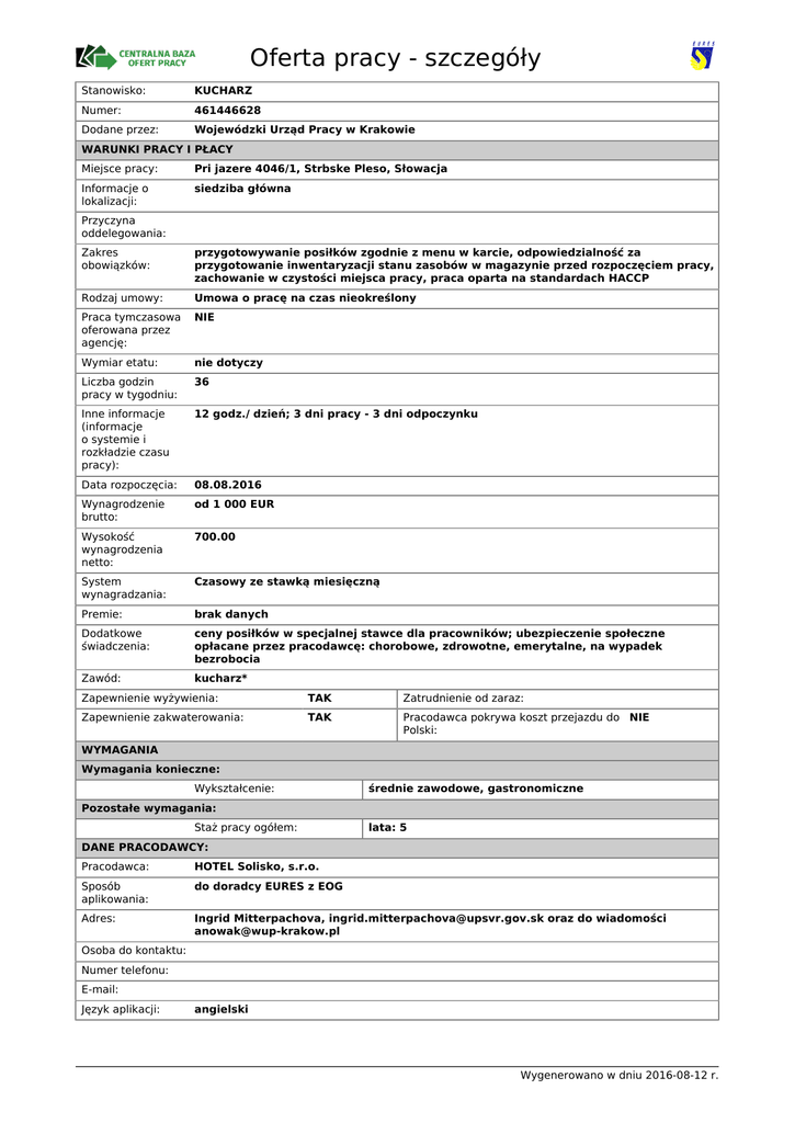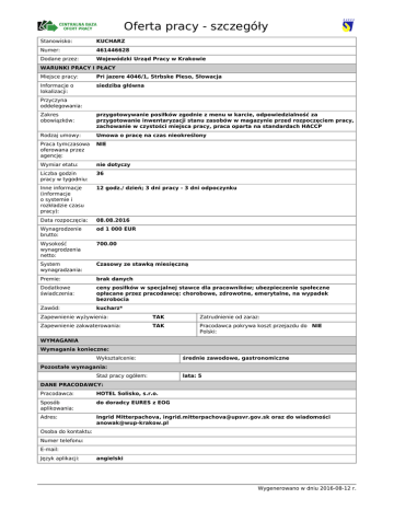 Oferta pracy - szczegóły Stanowisko: KUCHARZ Numer: 461446628 Dodane przez: Wojewódzki Urząd Pracy w Krakowie WARUNKI PRACY I PŁACY Miejsce pracy: Pri jazere 4046/1, Strbske Pleso, Słowacja Informacje o lokalizacji: siedziba główna Przyczyna oddelegowania: Zakres obowiązków: przygotowywanie posiłków zgodnie z menu w karcie, odpowiedzialność za przygotowanie inwentaryzacji stanu zasobów w magazynie przed rozpoczęciem pracy, zachowanie w czystości miejsca pracy, praca oparta na standardach HACCP Rodzaj umowy: Umowa o pracę na czas nieokreślony Praca tymczasowa oferowana przez agencję: NIE Wymiar etatu: nie dotyczy Liczba godzin pracy w tygodniu: 36 Inne informacje (informacje o systemie i rozkładzie czasu pracy): 12 godz./ dzień; 3 dni pracy - 3 dni odpoczynku Data rozpoczęcia: 08.08.2016 Wynagrodzenie brutto: od 1 000 EUR Wysokość wynagrodzenia netto: 700.00 System wynagradzania: Czasowy ze stawką miesięczną Premie: brak danych Dodatkowe świadczenia: ceny posiłków w specjalnej stawce dla pracowników; ubezpieczenie społeczne opłacane przez pracodawcę: chorobowe, zdrowotne, emerytalne, na wypadek bezrobocia Zawód: kucharz* Zapewnienie wyżywienia: TAK Zatrudnienie od zaraz: Zapewnienie zakwaterowania: TAK Pracodawca pokrywa koszt przejazdu do NIE Polski: WYMAGANIA Wymagania konieczne: Wykształcenie: średnie zawodowe, gastronomiczne Pozostałe wymagania: Staż pracy ogółem: lata: 5 DANE PRACODAWCY: Pracodawca: HOTEL Solisko, s.r.o. Sposób aplikowania: do doradcy EURES z EOG Adres: Ingrid Mitterpachova, [email protected] oraz do wiadomości [email protected] Osoba do kontaktu: Numer telefonu: E-mail: Język aplikacji: angielski Wygenerowano w dniu 2016-08-12 r. Wymagane dokumenty: CV oraz list motywacyjny w języku angielskim Sposób kontaktu / przekazania dokum.: poczta elektroniczna Dodatkowe informacje dotyczące aplikowania: POZOSTAŁE DANE: Liczba miejsc pracy: 2 Przeznaczone wyłącznie dla osób zarejestrowanych w urzędzie pracy: NIE w tym dla niepełnosprawnych: 0 Przeznaczone dla osób niepełnosprawnych (finansowanie z PFRON): NIE Data dodania: 19.07.2016 Możliwe przekazanie do realizacji przez inny PUP: NIE Data aktualizacji: 12.08.2016 Data udostępnienia na portalu Europejskich Służb Zatrudnienia: Data ważności: 31.08.2016 W przypadku zagranicznych ofert pracy umowa z zagranicznym pracodawcą jest, co do zasady, zawierana zgodnie z prawem obowiązującym w kraju zatrudnienia. Wszystkie roszczenia odnośnie warunków wynikających z umowy można kierować do odpowiedniego sądu w kraju zatrudnienia. Ministerstwo Pracy i Polityki Społecznej, wojewódzkie i powiatowe urzędy pracy, Ochotnicze Hufce Pracy oraz podmioty akredytowane do prowadzenia pośrednictwa pracy w ramach sieci EURES w Polsce, nie mogą pośredniczyć ani reprezentować poszkodowanego w sądzie kraju zatrudnienia, w przypadku zaistnienia sporu z pracodawcą zagranicznym. Wygenerowano w dniu 2016-08-12 r.
