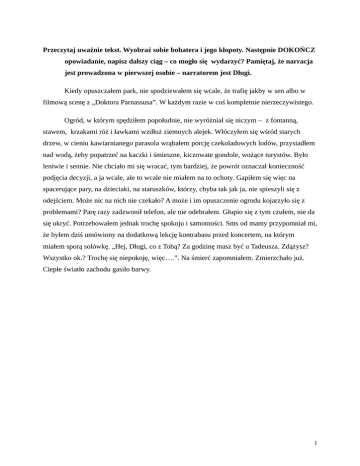 Przeczytaj uważnie tekst. Wyobraź sobie bohatera i jego kłopoty. Następnie DOKOŃCZ opowiadanie, napisz dalszy ciąg – co mogło się wydarzyć? Pamiętaj, że narracja jest prowadzona w pierwszej osobie – narratorem jest Długi. Kiedy opuszczałem park, nie spodziewałem się wcale, że trafię jakby w sen albo w filmową scenę z „Doktora Parnassusa”. W każdym razie w coś kompletnie nierzeczywistego. Ogród, w którym spędziłem popołudnie, nie wyróżniał się niczym – z fontanną, stawem, krzakami róż i ławkami wzdłuż ziemnych alejek. Włóczyłem się wśród starych drzew, w cieniu kawiarnianego parasola wrąbałem porcję czekoladowych lodów, przysiadłem nad wodą, żeby popatrzeć na kaczki i śmieszne, kiczowate gondole, wożące turystów. Było leniwie i sennie. Nie chciało mi się wracać, tym bardziej, że powrót oznaczał konieczność podjęcia decyzji, a ja wcale, ale to wcale nie miałem na to ochoty. Gapiłem się więc na spacerujące pary, na dzieciaki, na staruszków, którzy, chyba tak jak ja, nie spieszyli się z odejściem. Może nic na nich nie czekało? A może i im opuszczenie ogrodu kojarzyło się z problemami? Parę razy zadzwonił telefon, ale nie odebrałem. Głupio się z tym czułem, nie da się ukryć. Potrzebowałem jednak trochę spokoju i samotności. Sms od mamy przypomniał mi, że byłem dziś umówiony na dodatkową lekcję kontrabasu przed koncertem, na którym miałem sporą solówkę. „Hej, Długi, co z Tobą? Za godzinę masz być u Tadeusza. Zdążysz? Wszystko ok.? Trochę się niepokoję, więc….”. Na śmierć zapomniałem. Zmierzchało już. Ciepłe światło zachodu gasiło barwy. 1 Ruszyłem ku bramie. Tenisówki przemokły od wieczornej rosy, czułem chłód. „Nic się nie martw, zdążę. Nie było dwóch ostatnich lekcji, więc wracałem przez park. Trochę się to przeciągnęło . Dzięki, że mi przypomniałaś” – odpisałem nie do końca zgodnie z prawdą. Owszem, nie było dwóch lekcji, owszem, wracałem przez park, ale o spotkaniu z profesorem zapomniałem zupełnie i wcale nie miałem pewności, czy zdążę. Myśli skakały w oszalałym tańcu i nawet nie mogłem się im dobrze przyjrzeć. Koncert był przepustką do liceum, choć kończyłem dopiero drugą klasę, za rok już nie musiałbym zdawać żadnych egzaminów. Czy jednak nie powinienem zrezygnować? Żuraw wcale nie jest ode mnie gorszy. Gorszy? Jest lepszy. Przypadek, że ja przeszedłem eliminacje. W dodatku ta jego kwaśna sytuacja. Chyba zwaliło mu się na łeb całe sklepienie niebieskie, wszystko na raz. I pewnie bym mu to moje miejsce odstąpił, gdyby nie rozmowa pod tablicą ogłoszeń, kiedy czytaliśmy wyniki – „No, ładnie się ustawiłeś, Długi. Mamusia czy tatulek, no? Kto ci to załatwił?” – syknął w moją stronę, spojrzał z lekceważeniem i odszedł. Nie odzywa się do mnie od dwóch miesięcy. Myślałem o tym mijając bramę i idąc spiesznie uliczką ku górze, gdzie miałem nadzieję złapać autobus, żeby jednak zdążyć na lekcję kontrabasu. Światło gazowych latarni rozpraszało mrok. Pachniało, czym się da – nie znam się na tym, ale można by rzec, że pachniało wszystkim na raz: bzami, macierzanką, jaśminem, czeremchą i czym kto chce. Jeszcze odezwał się jakiś spóźniony ptak – wcale zresztą nie słowik. „Sześć komarów nadziewanych w konwaliowym sosie, tort z wietrzyka w księżycowym blasku, biedna pani słowikowa nie ma ciebie w nosie, mój ty słodki ananasku” – tłukło mi się jak uparty refren. Na ogrodzeniu dostrzegłem spore ogłoszenie, którego, dałbym głowę, po południu jeszcze nie było. „Uczę milczenia We wszystkich językach Metodą wpatrywania się W gwieździste niebo, W skok pasikonika, W płatek śniegu.” 2 Dziwne, pomyślałem. Może to jakaś artystyczna instalacja? „Uczę milczenia.” Ciekawe. Ruszyłem dalej, ale stanąłem oniemiały. Ogłoszeń było mnóstwo – wisiały na zdobionym metalowym płocie, na latarniach, na drzewach. W miękkiej mgle kołysały się zawieszone nad brukowaną uliczką. Snułem się w tym gąszczu jak zaczarowany. Próbowałem odczytywać, nie zawsze były wyraźne, niektóre zamazane, na innych rozmył się atrament, a inne jeszcze uciekały przed moim wzrokiem, nikły. „Szukam recept na….”, „Oddam w dobre ręce pogodę ducha….”, „…………………….. tylko zatroskanym”. „Ktokolwiek wie, gdzie się podziewa Współczucie (wyobraźnia serca) - niech daje znać! Niech daje znać!”…. Wyobraźnia serca? Znużony usiadłem na krawężniku, oparty o latarnię. Niebo pociemniało zupełnie. Była noc. Chciałem nie zapomnieć, zatrzymać ten sen-nie-sen. Zapamiętać chociaż niektóre z ogłoszeń kołyszących się w najdziwniejszej na świecie rubryce. I zrozumieć to, co wydało się specjalnie dla mnie: gdzie się podziewa wyobraźnia serca…. 3