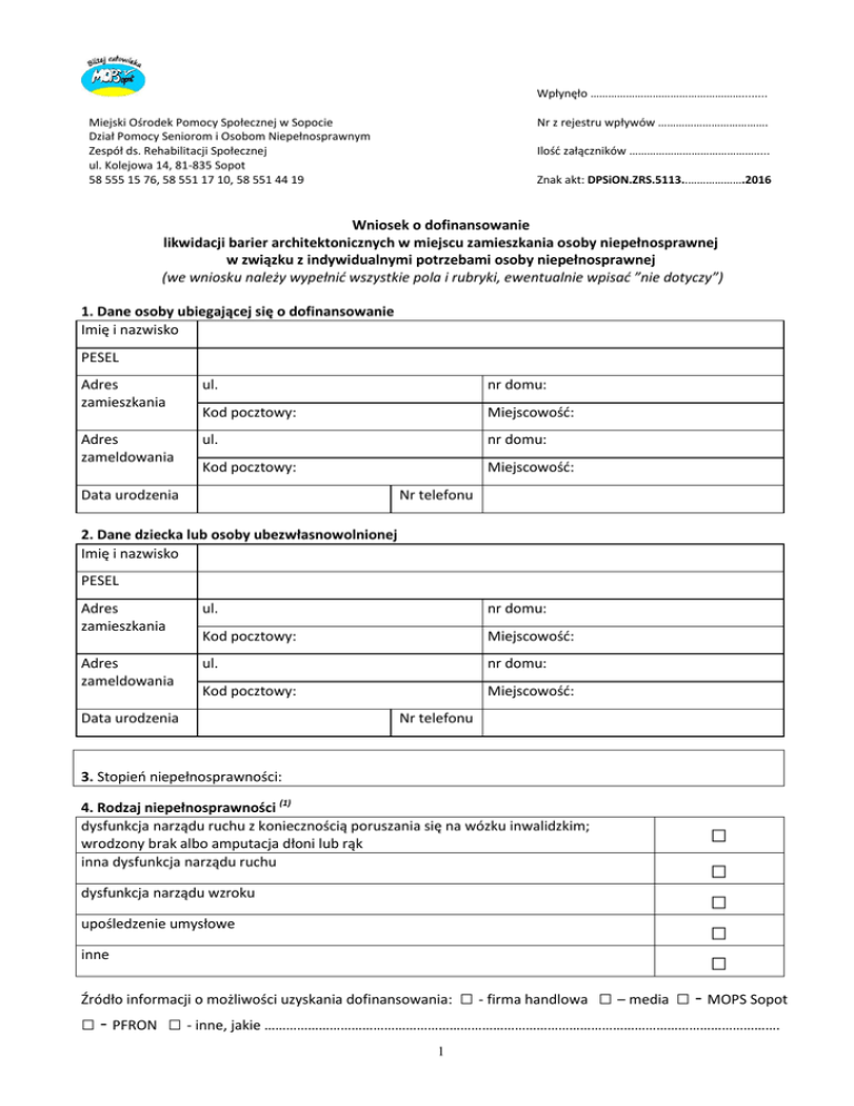 Wpłynęło ……………………………………………........ Miejski Ośrodek Pomocy Społecznej w Sopocie Dział Pomocy Seniorom i Osobom Niepełnosprawnym Zespół ds. Rehabilitacji Społecznej ul. Kolejowa 14, 81-835 Sopot 58 555 15 76, 58 551 17 10, 58 551 44 19 Nr z rejestru wpływów ………………………………. Ilość załączników ……………………………………..... Znak akt: DPSiON.ZRS.5113..……………….2016 Wniosek o dofinansowanie likwidacji barier architektonicznych w miejscu zamieszkania osoby niepełnosprawnej w związku z indywidualnymi potrzebami osoby niepełnosprawnej (we wniosku należy wypełnić wszystkie pola i rubryki, ewentualnie wpisać ”nie dotyczy”) 1. Dane osoby ubiegającej się o dofinansowanie Imię i nazwisko PESEL Adres zamieszkania ul. nr domu: Kod pocztowy: Miejscowość: Adres zameldowania ul. nr domu: Kod pocztowy: Miejscowość: Data urodzenia Nr telefonu 2. Dane dziecka lub osoby ubezwłasnowolnionej Imię i nazwisko PESEL Adres zamieszkania ul. nr domu: Kod pocztowy: Miejscowość: Adres zameldowania ul. nr domu: Kod pocztowy: Miejscowość: Data urodzenia Nr telefonu 3. Stopień niepełnosprawności: 4. Rodzaj niepełnosprawności (1) dysfunkcja narządu ruchu z koniecznością poruszania się na wózku inwalidzkim; wrodzony brak albo amputacja dłoni lub rąk inna dysfunkcja narządu ruchu dysfunkcja narządu wzroku upośledzenie umysłowe inne Źródło informacji o możliwości uzyskania dofinansowania: □ □ □ □ □ □ - firma handlowa □ – media □ - MOPS Sopot □ - PFRON □ - inne, jakie ……………………………………………………………………………………………………………………………. 1 5. Sytuacja mieszkaniowa – warunki mieszkaniowe (wypełnia pracownik MOPS – szczegółowy opis może zawierać adnotacja urzędowa sporządzona w trakcie wstępnej wizji lokalnej) złe przeciętne dobre bardzo dobre 6. Sytuacja mieszkaniowa – opis budynku i mieszkania* dom jednorodzinny, wielorodzinny prywatny, wielorodzinny komunalny, wielorodzinny spółdzielczy, inne .............................................................................................................................................................................. budynek parterowy, piętrowy, mieszkanie na ................... piętrze przybliżony wiek budynku lub rok budowy .......................................................................................................... tytuł prawny do lokalu: własność, własność spółdzielcza, spółdzielcze prawo lokatorskie, mieszkanie w zasobach miasta (umowa najmu), inne ………………………………………………………………………………………………………….. opis mieszkania: pokoje .............. (proszę podać liczbę), z kuchnią, bez kuchni, z łazienką, bez łazienki, z wc, bez wc, łazienka jest wyposażona w: wannę, brodzik, kabinę prysznicową, umywalkę. W mieszkaniu jest: instalacja wody zimnej, ciepłej, kanalizacja, centralne ogrzewanie, prąd, gaz inne ważne informacje dotyczące warunków mieszkaniowych, które mogą mieć wpływ na ocenę wniosku: ……………………………………………………………………………………………………………………………………………………………………….. ……………………………………………………………………………………………………………………………………………………………………….. ……………………………………………………………………………………………………………………………………………………………………….. ……………………………………………………………………………………………………………………………………………………………………….. 7. Sytuacja mieszkaniowa – zamieszkuje (1) samotnie □ □ □ z rodziną z osobami nie spokrewnionymi 8. Oświadczam, iż razem ze mną we wspólnym gospodarstwie domowym pozostają następujące osoby: Imię i nazwisko Posiadane orzeczenie o niepełnosprawności stopień rodzaj stopień pokrewieństwa 1. Średni miesięczny dochód (netto) Wnioskodawca Pozostali członkowie wspólnego gospodarstwa domowego 2. 3. 4. 5. 6. 7. Razem W przypadku kilku osób niepełnosprawnych zamieszkałych we wspólnym lokalu, jeżeli zakres dofinansowania obejmuje likwidację barier dla wszystkich niepełnosprawnych członków rodziny – należy dostarczyć kserokopie stosownych orzeczeń oraz zgodę na przetwarzanie danych osobowych (druk oświadczenia stanowi załącznik do wniosku). 2 9. Oświadczam, że przeciętny miesięczny dochód, w rozumieniu przepisów o świadczeniach rodzinnych, podzielony przez liczbę osób we wspólnym gospodarstwie domowym, obliczony za kwartał poprzedzający miesiąc złożenia wniosku wynosi 10. Sytuacja zawodowa (1) zatrudniony/ prowadzący działalność gospodarczą □ □ □ □ □ □ dzieci i młodzież do lat 18 osoba w wieku od lat 18 do 24, ucząca się w systemie szkolnym bezrobotny poszukujący pracy/ rencista poszukujący pracy rencista/ emeryt nie zainteresowany podjęciem pracy inne 11. Informacja o korzystaniu ze środków PFRON i Gminy Miasta Sopotu (dotyczy wyłącznie środków z budżetu Gminy Miasta Sopotu stanowiących dofinansowanie z zakresu rehabilitacji społecznej i zawodowej) □ nie korzystałam/em Nazwa instytucji, programu, w ramach którego została przyznana pomoc Przedmiot dofinansowania □ korzystałam/em Imię i nazwisko osoby, której przyznano pomoc 1) Numer i data zawarcia umowy 1) Kwota dofinansowania ze środków Rozliczono PFRON tak nie □ □ □ □ □ □ □ □ □ □ □ □ □ □ □ □ □ □ □ □ □ □ Gminy Miasta Sopotu Razem uzyskane dofinansowanie □ 12. Oświadczam, że nie pos