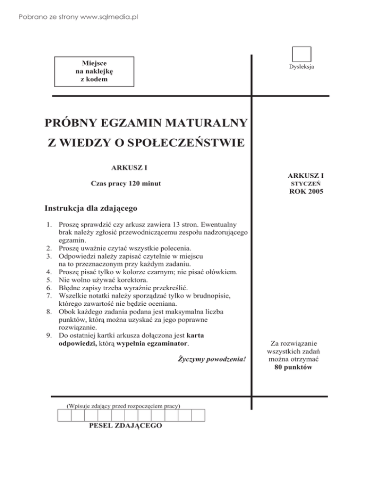 Pobrano ze strony www.sqlmedia.pl Miejsce na naklejkĊ z kodem Dysleksja PRÓBNY EGZAMIN MATURALNY Z WIEDZY O SPOàECZEēSTWIE ARKUSZ I ARKUSZ I Czas pracy 120 minut STYCZEē ROK 2005 Instrukcja dla zdającego 1. ProszĊ sprawdziü czy arkusz zawiera 13 stron. Ewentualny brak naleĪy zgáosiü przewodniczącemu zespoáu nadzorującego egzamin. 2. ProszĊ uwaĪnie czytaü wszystkie polecenia. 3. Odpowiedzi naleĪy zapisaü czytelnie w miejscu na to przeznaczonym przy kaĪdym zadaniu. 4. ProszĊ pisaü tylko w kolorze czarnym; nie pisaü oáówkiem. 5. Nie wolno uĪywaü korektora. 6. BáĊdne zapisy trzeba wyraĨnie przekreĞliü. 7. Wszelkie notatki naleĪy sporządzaü tylko w brudnopisie, którego zawartoĞü nie bĊdzie oceniana. 8. Obok kaĪdego zadania podana jest maksymalna liczba punktów, którą moĪna uzyskaü za jego poprawne rozwiązanie. 9. Do ostatniej kartki arkusza doáączona jest karta odpowiedzi, którą wypeánia egzaminator. ĩyczymy powodzenia! (Wpisuje zdający przed rozpoczĊciem pracy) PESEL ZDAJĄCEGO Za rozwiązanie wszystkich zadaĔ moĪna otrzymaü 80 punktów Pobrano ze strony www.sqlmedia.pl Zadanie 1. (0-1 pkt.) Obywatelstwo to A. obywatelski obowiązek pracy w paĔstwie. B. stosunek prawny áączący jednostkĊ z paĔstwem. C. stosunek okreĞlający przynaleĪnoĞü narodową. D. prawo przebywania w dowolnym paĔstwie. Zadanie 2. (0-1 pkt.) Idea paĔstwa narodowego narodziáa siĊ w A. B. C. D. XXI wieku. XVII wieku. XIX wieku. XX wieku. Zadanie 3. (0-1 pkt.) Kadencja Sejmu w Polsce trwa: A. 6 lat. B. 5 lat. C. 4 lata. D. 7 lat. Zadanie 4. (0-1 pkt.) WskaĪ komunistycznego dyktatora, który sprawuje nieprzerwanie wáadzĊ mimo rozpadu Ğwiatowego bloku komunistycznego: A. Józef Stalin, B. Bolesáaw Bierut, C. Mao Tse-Tung, D. Fidel Castro. Zadanie 5. (0-1 pkt.) Pierwszym premierem po upadku komunizmu w 1989 roku w Polsce byá A. Wojciech Jaruzelski. B. Aleksandr KwaĞniewski. C. Lech WaáĊsa. D. Tadeusz Mazowiecki. Zadanie 6. (0-1 pkt.) WskaĪ tytuá – spoĞród podanych – tygodnika, który w 2003/4 roku miaá najwiĊkszą liczbĊ czytelników Polsce. A. Newsweek. B. Wprost. C. Agora. D. Przekrój. 2 Pobrano ze strony www.sqlmedia.pl Zadanie 7. (0-3 pkt.) Do podanych w tabeli zadaĔ wpisz skróty programów pomocowych dla Polski, finansowanych ze Ğrodków Unii Europejskiej: ISPA, SAPARD, PHARE Zadania Program Wspieranie tworzenia gospodarki rynkowej, A. pomoc dla maáych i Ğrednich przedsiĊbiorstw, rozwoju infrastruktury, finansowanie rozwoju administracji i instytucji do funkcjonowania w Unii. B. Wspieranie inwestycji w dziedzinie ochrony Ğrodowiska oraz infrastruktury transportowej. C. Pomoc w modernizacji polskiego rolnictwa oraz rozwój obszarów wiejskich. Zadanie 8. (0-4 pkt.) WyjaĞnij znaczenie pojĊcia urbanizacja. Podaj trzy przykáady zjawisk związanych z procesem urbanizacji we wspóáczesnym Ğwiecie. WyjaĞnienie: ................................................................................................................................................. ................................................................................................................................................. ................................................................................................................................................. ................................................................................................................................................. Przykáady: 1. ........................................................................................................................................... 2. ........................................................................................................................................... 3. ........................................................................................................................................... Zadanie 9. (0-3 pkt.) PoniĪej wymieniono alfabetycznie siedem paĔstw europejskich, wskaĪ nazwy trzech, które są republikami: Belgia, Czechy, Hiszpania, Luksemburg, Niemcy, Rosja, Wielka Brytania Nazwy trzech paĔstw: .................................................................................................................................... 3 Pobrano ze strony www.sqlmedia.pl Zadanie 10. (0-1 pkt.) Na mocy Art. 1. Konstytucji Rzeczypospolitej Polskiej z 1997 roku wáadza zwierzchnia naleĪy do A. Rządu Rzeczypospolitej. B. SpoáeczeĔstwa. C. Narodu. D. Sejmu i Senatu. Zadanie 11. (0-16 pkt.) Przeczytaj fragment „Konstytucji Rzeczypospolitej Polskiej” i wykonaj podane poniĪej plecenia od A do G. Rozdziaá I Rzeczpospolita Art. 10. 1. Ustrój Rzeczypospolitej Polskiej opiera siĊ na podziale i równowadze wáadzy ustawodawczej, wáadzy wykonawczej i wáadzy sądowniczej. 2. WáadzĊ ustawodawczą sprawują Sejm i Senat, wáadzĊ wykonawczą Prezydent Rzeczypospolitej i Rada Ministrów, a wáadzĊ sądowniczą sądy i trybunaáy. Art. 11. 1. Rzeczpospolita zapewnia wolnoĞü tworzenia i dziaáania partii politycznych. Partie polityczne zrzeszają siĊ na zasadach dobrowolnoĞci i równoĞci obywateli polskich w celu wpáywania metodami demokratycznymi na ksztaátowanie polityki paĔstwa. [...] Art. 12. Rzeczpospolita Polska zapewnia wolnoĞü tworzenia i dziaáania związków zawodowych [...] Art. 13. Zakazane jest istnienie partii politycznych i innych organizacji odwoáujących siĊ w swoich programach do totalitarnych metod i praktyk dziaáania nazizmu, faszyzmu, komunizmu, a takĪe tych, których program lub dziaáalnoĞü zakáada lub dopuszcza nienawiĞü rasową i narodowoĞciową, stosowanie przemocy w celu zdobycia wáadzy lub wpáywu na politykĊ paĔstwa albo przewiduje utajnienie struktur lub czáonkostwa. [...] Art. 15. 1. Ustrój terytorialny Rzeczypospolitej Polskiej zapewnia decentralizacjĊ wáadzy publicznej. 2. Zasadniczy podziaá terytorialny paĔstwa uwzglĊdniający wiĊzi spoá