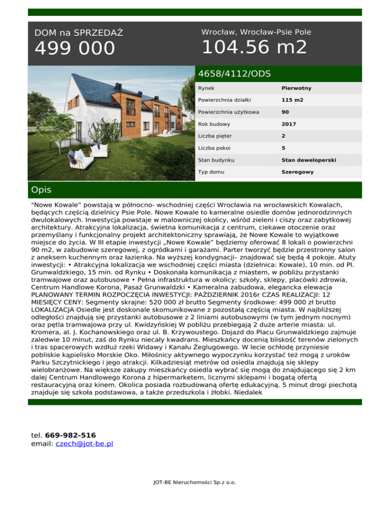 DOM na SPRZEDAŻ 499 000 Wrocław, Wrocław-Psie Pole 104.56 m2 4658/4112/ODS Rynek Pierwotny Powierzchnia działki 115 m2 Powierzchnia użytkowa 90 Rok budowy 2017 Liczba pięter 2 Liczba pokoi 5 Stan budynku Stan deweloperski Typ domu Szeregowy Opis "Nowe Kowale” powstają w północno- wschodniej części Wrocławia na wrocławskich Kowalach, będących częścią dzielnicy Psie Pole. Nowe Kowale to kameralne osiedle domów jednorodzinnych dwulokalowych. Inwestycja powstaje w malowniczej okolicy, wśród zieleni i ciszy oraz zabytkowej architektury. Atrakcyjna lokalizacja, świetna komunikacja z centrum, ciekawe otoczenie oraz przemyślany i funkcjonalny projekt architektoniczny sprawiają, że Nowe Kowale to wyjątkowe miejsce do życia. W III etapie inwestycji „Nowe Kowale” będziemy oferować 8 lokali o powierzchni 90 m2, w zabudowie szeregowej, z ogródkami i garażami. Parter tworzyć będzie przestronny salon z aneksem kuchennym oraz łazienka. Na wyższej kondygnacji– znajdować się będą 4 pokoje. Atuty inwestycji: • Atrakcyjna lokalizacja we wschodniej części miasta (dzielnica: Kowale), 10 min. od Pl. Grunwaldzkiego, 15 min. od Rynku • Doskonała komunikacja z miastem, w pobliżu przystanki tramwajowe oraz autobusowe • Pełna infrastruktura w okolicy: szkoły, sklepy, placówki zdrowia, Centrum Handlowe Korona, Pasaż Grunwaldzki • Kameralna zabudowa, elegancka elewacja PLANOWANY TERMIN ROZPOCZĘCIA INWESTYCJI: PAŹDZIERNIK 2016r CZAS REALIZACJI: 12 MIESIĘCY CENY: Segmenty skrajne: 520 000 zł brutto Segmenty środkowe: 499 000 zł brutto LOKALIZACJA Osiedle jest doskonale skomunikowane z pozostałą częścią miasta. W najbliższej odległości znajdują się przystanki autobusowe z 2 liniami autobusowymi (w tym jednym nocnym) oraz pętla tramwajowa przy ul. Kwidzyńskiej W pobliżu przebiegają 2 duże arterie miasta: ul. Kromera, al. J. Kochanowskiego oraz ul. B. Krzywoustego. Dojazd do Placu Grunwaldzkiego zajmuje zaledwie 10 minut, zaś do Rynku niecały kwadrans. Mieszkańcy docenią bliskość terenów zielonych i tras spacerowych wzdłuż rzeki Widawy i Kanału Żeglugowego. W lecie ochłodę przyniesie pobliskie kąpielisko Morskie Oko. Miłośnicy aktywnego wypoczynku korzystać też mogą z uroków Parku Szczytnickiego i jego atrakcji. Kilkadziesiąt metrów od osiedla znajdują się sklepy wielobranżowe. Na większe zakupy mieszkańcy osiedla wybrać się mogą do znajdującego się 2 km dalej Centrum Handlowego Korona z hipermarketem, licznymi sklepami i bogatą ofertą restauracyjną oraz kinem. Okolica posiada rozbudowaną ofertę edukacyjną. 5 minut drogi piechotą znajduje się szkoła podstawowa, a także przedszkola i żłobki. Niedalek tel. 669-982-516 email: [email protected] JOT-BE Nieruchomości Sp.z o.o. JOT-BE Nieruchomości Sp.z o.o. Powered by TCPDF (www.tcpdf.org)