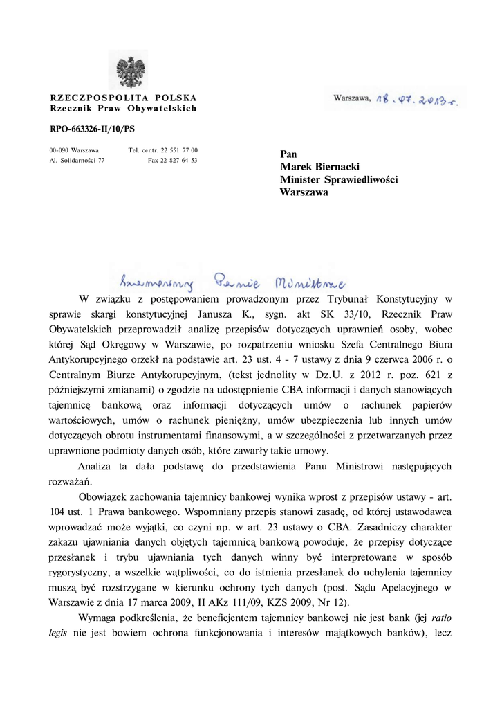 R Z E C Z P O S P O L I T A POLSKA Rzecznik Praw O b y w a t e l s k i c h RPO-663326-II/10/PS 00-090 Warszawa Al. Solidarności 77 Tel. centr. 22 551 77 00 Fax 22 827 64 53 Pan Marek Biernacki Minister Sprawiedliwości Warszawa W związku z postępowaniem prowadzonym przez Trybunał Konstytucyjny w sprawie skargi konstytucyjnej Janusza K., sygn. akt SK 33/10, Rzecznik Praw Obywatelskich przeprowadził analizę przepisów dotyczących uprawnień osoby, wobec której Sąd Okręgowy w Warszawie, po rozpatrzeniu wniosku Szefa Centralnego Biura Antykorupcyjnego orzekł na podstawie art. 23 ust. 4 - 7 ustawy z dnia 9 czerwca 2006 r. o Centralnym Biurze Antykorupcyjnym, (tekst jednolity w Dz.U. z 2012 r. poz. 621 z późniejszymi zmianami) o zgodzie na udostępnienie CBA informacji i danych stanowiących tajemnicę bankową oraz informacji dotyczących umów o rachunek papierów wartościowych, umów o rachunek pieniężny, umów ubezpieczenia lub innych umów dotyczących obrotu instrumentami finansowymi, a w szczególności z przetwarzanych przez uprawnione podmioty danych osób, które zawarły takie umowy. Analiza ta dała podstawę do przedstawienia Panu Ministrowi następujących rozważań. Obowiązek zachowania tajemnicy bankowej wynika wprost z przepisów ustawy - art. 104 ust. 1 Prawa bankowego. Wspomniany przepis stanowi zasadę, od której ustawodawca wprowadzać może wyjątki, co czyni np. w art. 23 ustawy o CBA. Zasadniczy charakter zakazu ujawniania danych objętych tajemnicą bankową powoduje, że przepisy dotyczące przesłanek i trybu ujawniania tych danych winny być interpretowane w sposób rygorystyczny, a wszelkie wątpliwości, co do istnienia przesłanek do uchylenia tajemnicy muszą być rozstrzygane w kierunku ochrony tych danych (post. Sądu Apelacyjnego w Warszawie z dnia 17 marca 2009, II AKz 111/09, KZS 2009, Nr 12). Wymaga podkreślenia, że beneficjentem tajemnicy bankowej nie jest bank (jej ratio legis nie jest bowiem ochrona funkcjonowania i interesów majątkowych banków), lecz 2 obywatel (podmiot) dokonujący czynności bankowych. Wydaje się zatem słuszne i pożądane zapewnienie mu maksymalnej ochrony prawnej przed nieuprawnionym ujawnianiem informacji objętych tajemnicą. Zgodnie z art. 47 Konstytucji, „Każdy ma prawo do ochrony prawnej życia prywatnego, rodzinnego, czci i dobrego imienia oraz do decydowania o swoim życiu osobistym Wedle powszechnie przyjętego poglądu, przez życie prywatne należy rozumieć wszystkie te okoliczności, zachowania, wydarzenia, które nie są bezpośrednio związane z wykonywaniem przez daną osobę zadań i kompetencji organów władzy publicznej oraz dokonywaniem innych czynności i prowadzeniem działalności o publicznym zasięgu i znaczeniu (P. Winczorek, Komentarz do Konstytucji Rzeczpospolitej Polskiej, Warszawa 2000, s. 66). Nie ulega wątpliwości, że udostępnianie organom państwa informacji objętych tajemnicą bankową dotyczących majątku danej osoby, stanowi ingerencję w jej sferę prywatności. W świetle art. 31 ust. 3 Konstytucji, ingerencja ta znajdywać może uspra wiedli wierne ze względu na ochronę innych wartości, w tym porządku publicznego. W tym kontekście odczytywać należy sformułowane w art. 23 ust. 1 ustawy o CBA uprawnienie do korzystania przez Biuro z informacji stanowiących tajemnicę bankową. In concreto, ocena przesłanek dopuszczalności ingerencji w prawo do prywatności poprzez ujawnienie informacji objętych tajemnicą bankową dokonywana jest przez sąd w postępowaniu uregulowanym w art. 23 ust. 4-7 ustawy o CBA. W postępowaniu tym podmiot, którego dotyczą dane, jest de lege lata całkowicie pozbawiony możliwości przedstawienia swego stanowiska odnośnie istnienia przesłanek do ujawnienia danych. Nie ma możliwości uczestniczenia w posiedzeniu sądu, gdyż o wydaniu orzeczenia informowany jest post factum. Z uwagi na charakter czynności operacyjno rozpoznawczych rozwiązanie to nie budzi zastrzeżeń. Jednakże z przepisów ustawy o CBA , w tym w szczególności z art. 23 ust. 7 tej ustawy ani też z przepisów innych aktów normatywnych nie wynika, aby zainteresowany miał możliwość dochodzenia swych praw choćby ex post. Sytuację taką należy rozpatrywać w ocenie Rzecznika Praw Obywatelskich w kategoriach nieusprawiedliwionego pozbawienia efektywnej ochrony prawnej konstytucyjnego prawa, o którym mowa w art. 47 Konstytucji. Całkowity brak możliwości uczestniczenia danego podmiotu w postępowaniu sądowym, które go dotyczy, wywołuje zatem stan, w którym osobie zainteresowanej nie są gwarantowane uprawnienia wynikające z art. 45 ust. 1 i 77 ust. 2 Konstytucji. Choć bowiem z formalnego punktu widzenia postanowienie o udostępnieniu danych stanowiących tajemnicę bankową wydawane jest w toku postępowania sądowego, to podmiot, którego te dane dotyczą nie ma realnej możliwości uczestnictwa w tym postępowaniu w jakimkolwiek jego stadium. Tymczasem prawo do rzeczywistego uczestniczenia w postępowaniu stanowi jeden z elementów fair trial. 3 Tak, jak to wyżej powiedziano, pozbawienie zainteresowanego podmiotu możliwości uczestnictwa w pierwszej instancji w postępowaniu sądowym w przedmiocie wyrażenia zgody na ujawnienie dotyczących go informacji objętych tajemnicą bankową uznać należy za usprawiedliwione czy wręcz pożądane z uwagi na potrzebę zachowania niejawnego charakteru czynności operacyjno - rozpoznawczych. Wobec braku tej możliwości, wydaje się jednak tym bardziej konieczne zagwarantowanie mu prawa do bycia wysłuchanym w postępowaniu odwoławczym, które staje się dla zainteresowanego jedyną okazją zaprezentowania swych racji przed sądem. W obowiązującym stanie prawnym nie jest jednak zapewnione osobie, której informacje i dane dotyczą, wynikające z art. 78 Konstytucji uprawnienie do zaskarżenia orzeczeń i decyzji wydanych w pierwszej instancji. Zasada kontroli orzeczeń i decyzji wydanych w pie