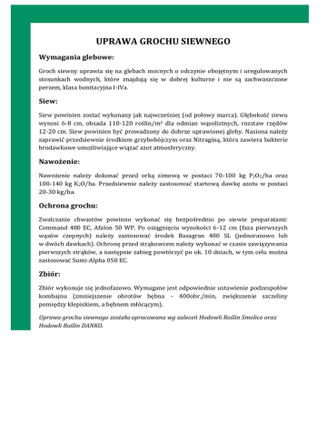 UPRAWA GROCHU SIEWNEGO Wymagania glebowe: Groch siewny uprawia się na glebach mocnych o odczynie obojętnym i uregulowanych stosunkach wodnych, które znajdują się w dobrej kulturze i nie są zachwaszczone perzem, klasa bonitacyjna I-IVa. Siew: Siew powinien zostać wykonany jak najwcześniej (od połowy marca). Głębokość siewu wynosi 6-8 cm, obsada 110-120 roślin/m2 dla odmian wąsolistnych, rozstaw rzędów 12-20 cm. Siew powinien być prowadzony do dobrze uprawionej gleby. Nasiona należy zaprawić przedsiewnie środkiem grzybobójczym oraz Nitraginą, która zawiera bakterie brodawkowe umożliwiające wiązać azot atmosferyczny. Nawożenie: Nawożenie należy dokonać przed orką zimową w postaci 70-100 kg P2O5/ha oraz 100-140 kg K2O/ha. Przedsiewnie należy zastosować startową dawkę azotu w postaci 20-30 kg/ha. Ochrona grochu: Zwalczanie chwastów powinno wykonać się bezpośrednio po siewie preparatami: Command 480 EC, Afalon 50 WP. Po osiągnięciu wysokości 6-12 cm (faza pierwszych wąsów czepnych) należy zastosować środek Basagran 480 SL (jednorazowo lub w dwóch dawkach). Ochronę przed strąkowcem należy wykonać w czasie zawiązywania pierwszych strąków, a następnie zabieg powtórzyć po ok. 10 dniach, w tym celu można zastosować Sumi-Alpha 050 EC. Zbiór: Zbiór wykonuje się jednofazowo. Wymagane jest odpowiednie ustawienie podzespołów kombajnu (zmniejszenie obrotów bębna – 400obr./min, zwiększenie szczeliny pomiędzy klepiskiem, a bębnem młócącym). Uprawa grochu siewnego została opracowana wg zaleceń Hodowli Roślin Smolice oraz Hodowli Roślin DANKO.