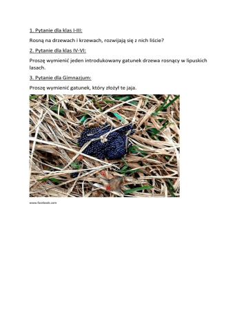 1. Pytanie dla klas I-III: Rosną na drzewach i krzewach, rozwijają się z nich liście? 2. Pytanie dla klas IV-VI: Proszę wymienić jeden introdukowany gatunek drzewa rosnący w lipuskich lasach. 3. Pytanie dla Gimnazjum: Proszę wymienić gatunek, który złożył te jaja. www.facebook.com