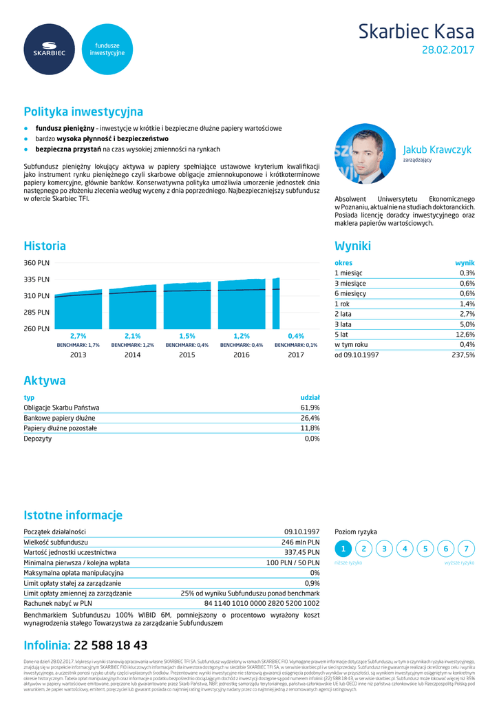 Skarbiec Kasa 28.02.2017 Polityka inwestycyjna • • • fundusz pieniężny – inwestycje w krótkie i bezpieczne dłużne papiery wartościowe bardzo wysoka płynność i bezpieczeństwo Jakub Krawczyk bezpieczna przystań na czas wysokiej zmienności na rynkach Subfundusz pieniężny lokujący aktywa w papiery spełniające ustawowe kryterium kwalifikacji jako instrument rynku pieniężnego czyli skarbowe obligacje zmiennokuponowe i krótkoterminowe papiery komercyjne, głównie banków. Konserwatywna polityka umożliwia umorzenie jednostek dnia następnego po złożeniu zlecenia według wyceny z dnia poprzedniego. Najbezpieczniejszy subfundusz w ofercie Skarbiec TFI. Historia 360 PLN360 PLN KASA KASA 360 PLN 360 PLN KASA 360 PLN KASA 360 PLN 335 PLN335 PLN 335 PLN 335 PLN 335 PLN 335 PLN PLN310 PLN 310 PLN 310 PLN 310 PLN 310 PLN 285 PLN285 PLN 285 PLN 310 260 PLN260 PLN 2,7% 285 PLN 260 PLN 2,1% 260 PLN 285 PLN 260 PLN 1,5% 1,2% Absolwent Uniwersytetu Ekonomicznego w Poznaniu, aktualnie na studiach doktoranckich. Posiada licencję doradcy inwestycyjnego oraz maklera papierów wartościowych. Wyniki KASA okres 285 PLN 260 PLN zarządzający wynik 1 miesiąc 0,3% 3 miesiące 0,6% 6 miesięcy 0,6% 1 rok 1,4% 2 lata 2,7% 3 lata 5,0% 5 lat 0,4% BENCHMARK: 1,7% BENCHMARK: 1,2% BENCHMARK: 0,4% BENCHMARK: 0,4% BENCHMARK: 0,1% 2013 2014 2015 2016 2017 12,6% w tym roku 0,4% od 09.10.1997 237,5% Aktywa typ udział Obligacje Skarbu Państwa 61,9% Bankowe papiery dłużne 26,4% Papiery dłużne pozostałe 11,8% Depozyty 0,0% Istotne informacje Początek działalności 09.10.1997 Wielkość subfunduszu 246 mln PLN Wartość jednostki uczestnictwa Minimalna pierwsza / kolejna wpłata Maksymalna opłata manipulacyjna Limit opłaty stałej za zarządzanie Limit opłaty zmiennej za zarządzanie Rachunek nabyć w PLN 337,45 PLN 100 PLN / 50 PLN Poziom ryzyka 1 2 niższe ryzyko 3 4 5 6 7 wyższe ryzyko 0% 0,9% 25% od wyniku Subfunduszu ponad benchmark 84 1140 1010 0000 2820 5200 1002 Benchmarkiem Subfunduszu 100% WIBID 6M, pomniejszony o procentowo wyrażony koszt wynagrodzenia stałego Towarzystwa za zarządzanie Subfunduszem Infolinia: 22 588 18 43 Dane na dzień 28.02.2017. Wykresy i wyniki stanowią opracowania własne SKARBIEC TFI SA. Subfundusz wydzielony w ramach SKARBIEC FIO. Wymagane prawem informacje dotyczące Subfunduszu, w tym o czynnikach ryzyka inwestycyjnego, znajdują się w prospekcie informacyjnym SKARBIEC FIO i kluczowych informacjach dla inwestora dostępnych w siedzibie SKARBIEC TFI SA, w serwisie skarbiec.pl i w sieci sprzedaży. Subfundusz nie gwarantuje realizacji określonego celu i wyniku inwestycyjnego, a uczestnik ponosi ryzyko utraty części wpłaconych środków. Prezentowane wyniki inwestycyjne nie stanowią gwarancji osiągnięcia podobnych wyników w przyszłości, są wynikiem inwestycyjnym osiągniętym w konkretnym okresie historycznym. Tabela opłat manipulacyjnych oraz informacje o podatku bezpośrednio obciążającym dochód z inwestycji dostępne są pod numerem infolinii: (22) 588 18 43, w serwisie skarbiec.pl. Subfundusz może lokować więcej niż 35% aktywów w papiery wartościowe emitowane, poręczone lub gwarantowane przez Skarb Państwa, NBP, jednostkę samorządu terytorialnego, państwa członkowskie UE lub OECD inne niż państwa członkowskie lub Rzeczpospolitą Polską pod warunkiem, że papier wartościowy, emitent, poręczyciel lub gwarant posiada co najmniej rating inwestycyjny nadany przez co najmniej jedną z renomowanych agencji ratingowych.