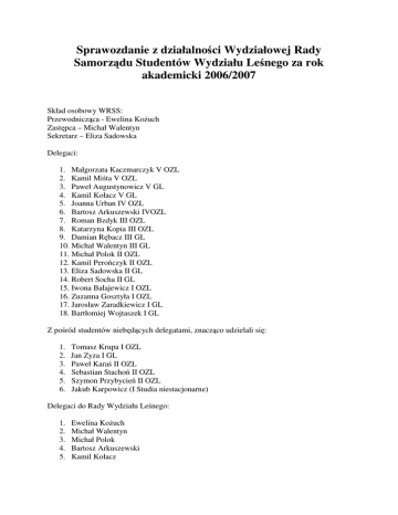 Sprawozdanie z działalności Wydziałowej Rady Samorządu Studentów Wydziału Leśnego za rok akademicki 2006/2007 Skład osobowy WRSS: Przewodnicząca - Ewelina Kożuch Zastępca – Michał Walentyn Sekretarz – Eliza Sadowska Delegaci: 1. Małgorzata Kaczmarczyk V OZL 2. Kamil Miśta V OZL 3. Paweł Augustynowicz V GL 4. Kamil Kołacz V GL 5. Joanna Urban IV OZL 6. Bartosz Arkuszewski IVOZL 7. Roman Bzdyk III OZL 8. Katarzyna Kopia III OZL 9. Damian Rębacz III GL 10. Michał Walentyn III GL 11. Michał Polok II OZL 12. Kamil Perończyk II OZL 13. Eliza Sadowska II GL 14. Robert Socha II GL 15. Iwona Bałajewicz I OZL 16. Zuzanna Gosztyła I OZL 17. Jarosław Zaradkiewicz I GL 18. Bartłomiej Wojtaszek I GL Z pośród studentów niebędących delegatami, znacząco udzielali się: 1. 2. 3. 4. 5. 6. Tomasz Krupa I OZL Jan Zyza I GL Paweł Karaś II OZL Sebastian Stachoń II OZL Szymon Przybycień II OZL Jakub Karpowicz (I Studia niestacjonarne) Delegaci do Rady Wydziału Leśnego: 1. 2. 3. 4. 5. Ewelina Kożuch Michał Walentyn Michał Polok Bartosz Arkuszewski Kamil Kołacz Delegaci do Komisji Dydaktycznej: 1. Joanna Urban 2. Kamil Miśta Delegaci do Uczelnianej Rady Samorządu Studentów: 1. Michał Walentyn 2. Bartosz Arkuszewski 3. Michał Polok Delegat do Rady Programowej K.A. „Arka”: Bartosz Arkuszewski W roku akademickim 2006/2007 WRSS podjął się następujących działań: • Udział w Inauguracji Roku Akademickiego 2006/2007 na Wydziale Leśnym Wygłoszenie przemówienia inauguracyjnego przez przewodniczącą WRSS – Ewelinę Kożuch; omówienie organizacji na Wydziale Leśnym, zaproszenie do aktywności w kołach naukowych i innych organizacjach studenckich; przeprowadzenie wyborów delegatów do WRSS. • Udział w Balu Beana reprezentacji studentów pierwszego roku Wydziału Leśnego. • Remont pomieszczenia Samorządowego mieszczącego się w DS. „III OAZA”. Czas trwania: grudzień 2006 – marzec 2007 Wszystkie działania, jakie zostały podjęte, wykonali studenci Wydziału Leśnego. Obejmowały one: częściowe skucie ścian, gipsowanie, wyrównanie ścian, malowanie, położenie wykładziny, meblowanie. Znaczące wsparcie podczas remontu studenci otrzymali od kierownictwa domu studenckiego, przede wszystkim od pana mgr inż. Adama Korty. Pomoc ta objęła nie tylko materiały wykorzystane przy pracach remontowych, ale również wiele czasu poświęconego na konsultacje w w/w sprawie. Podziękowania składamy także władzom dziekańskim Wydziału Leśnego za finansową pomoc w wykończeniu pomieszczenia. Za otrzymane pieniądze zakupiliśmy m.in. przedłużacze, zasłony i elementy oświetlenia. Do studentów, którzy zaangażowali się w to przedsięwzięcie należą: Michał Polok, Szymon Przybycień, Sebastian Stachoń, Iwona Bałajewicz, Jarosław Zaradkiewicz, Izabela Duch, Paweł Karaś, Paweł Kauzal, Eliza Sadowska, Zuzanna Gosztyła, Kamil Kołacz, Paweł Augustynowicz, Michał Walentyn a także wiele innych osób, którym WRSS serdecznie dziękuje za włączenie się w tą spontanicznie podjętą inicjatywę. Przygotowanie stoiska promującego Wydział Leśny podczas ogólnopolskiej konferencji organizowanej przez Uczelnianą Radę Samorządu Studentów w sali kongresowej na WL. Termin: grudzień 2006. • • Wydatkowanie pieniędzy (1 500 PLN) z nagrody Rektora za zajęcie II miejsca w Międzywydziałowym Turnieju Artystycznym Organizacja spotkania opłatkowego (wspólnie z Radą Mieszkańców DS. ”III OAZA”) Termin: styczeń 2007 • Spotkania opłatkowe stały się już tradycją Wydziałowej Rady Samorządu Studentów Wydziału Leśnego. Podobnie jak w latach poprzednich mieliśmy zaszczyt gościć władze rektorskie i dziekańskie, a także kierownictwo DS.”OAZA”. Obecni byli m. in.: Prof. dr hab. inż. Włodzimierz Sady, prof. dr hab. inż. Tadeusz Kowalski, dr hab. inż Jerzy Skrzyszewski, mgr inż. Adam Korta. Spotkanie z dyrektorami Regionalnych Dyrekcji Lasów Państwowych (Katowice, Kraków, Krosno) w sprawie możliwości i warunków podjęcia stażu i pracy w PGL LP przez studentów Wydziału Leśnego. Termin: luty 2007 Organizatorzy: WRSS wraz z prodziekanem ds. studenckich dr hab. inż. Jerzym Skrzyszewskim. • • Organizacja II edycji konkursu fotograficznego. Wskutek ogromnego zainteresowania, jakim cieszył się ten konkurs w roku ubiegły, organizatorzy postanowili rozszerzyć zakres tematyczny („Pejzaż”, „Życie Studenckie”) o dodatkową kategorię: „Przyroda w makroobiektywie”. Konkurs jest nadal w trakcie realizacji. Koordynator konkursu: Eliza Sadowska Przygotowanie stoiska promocyjnego podczas Dnia Otwartego na Akademii Rolniczej marzec 2007 Termin: marzec 2007 • Promocja Wydziału Leśnego obejmowała nie tylko samo stoisko promocyjne przy sali konferencyjnej, ale również multimedialną prezentację z omówieniem najważniejszych zagadnień z zakresu studiowania leśnictwa oraz tzw.„wycieczkę po wydziale” Na tegoroczne dni otwarte zostały wysłane zaproszenia do wszystkich Techników Leśnych w Polsce, których absolwenci są mile widziani jako przyszli studenci Wydziału Leśnego. Nasze stoisko cieszyło się dużym zainteresowaniem. Oprócz indywidualnych osób, odwiedziły nas trzy grupy zorganizowane: uczniowie z Techników Leśnych w Brynku, Starym Sączu i Lesku. • Udział w Międzywydziałowym Turnieju Artystycznym Termin: marzec 2007 Wieloosobowa reprezentacja WL w składzie ponad 50 osób zajęła II miejsce, wygrywając nagrodę w wysokości 1 500 PLN. Za pomoc w organizacji tego ogromnego przedsięwzięcia WRSS w sposób szczególny dziękuje: sygnalistom z zespołu HAGARD, chórowi po przewodnictwem pana dr inż. Janusza Gołąba, kabaretowi studenckiemu z II OZL-u. • Udział w Juwenaliach (Wybory najmilszej studentki i AR-mana) Termin: maj 2007 Podsumowując działalność WRSS w roku akademickim 2006/2007 pragnę serdecznie podziękować wszystkim za współpracę. Mam 