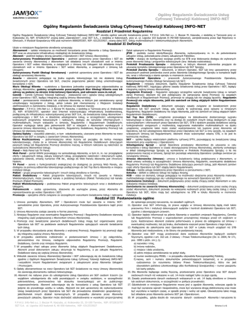 Ogólny Regulamin Świadczenia Usług Cyfrowej Telewizji Kablowej INFO-NET Ogólny Regulamin Świadczenia Usług Cyfrowej Telewizji Kablowej INFO-NET Rozdział I Przedmiot Regulaminu Ogólny Regulamin Świadczenia Usług Cyfrowej Telewizji Kablowej INFO-NET określa ogólne warunki świadczenia przez: F.P.H.U. Info-Net s.c. J. Boczar M. Kaszuba, z siedzibą w Tarnowie przy ul. Krakowska 33, NIP: 8732815757 zwaną dalej „Operatorem”, oraz SGT S.A., z siedzibą w Katowicach, przy ul. ul. Ligocka 103 budynek 8 (40-568 Katowice), zarejestrowaną przez Sąd Rejonowy w Gliwicach, X Wydział Gospodarczy KRS pod numerem 0000293307, NIP: 6312533927, zwaną dalej SGT, Usług multimedialnych i telekomunikacyjnych Abonentom. Rozdział II Definicje Użyte w niniejszym Regulaminie określenia oznaczają: Abonament – opłata miesięczna za możliwość korzystania przez Abonenta z Usług Operatora i SGT oraz za utrzymanie infrastruktury niezbędnej do świadczenia Usług; Abonent – podmiot będący stroną zawartej z Operatorem i SGT Umowy Abonenckiej; Autoryzowany Przedstawiciel Operatora – podmiot uprawniony przez Operatora i SGT do zawarcia Umowy Abonenckiej z Abonentem lub składania innych oświadczeń woli w imieniu Operatora i SGT wobec Abonenta, a związanych z Umową lub Usługami lub składania innych oświadczeń woli w imieniu Operatora i SGT wobec Abonenta, a związanych z Umową lub Usługami; Autoryzowany Punkt Obsługi Serwisowej – podmiot uprawniony przez Operatora i SGT do obsługi serwisowej Abonenta; Awaria – zdarzenie polegające na braku sygnału telewizyjnego lub nie działanie Usług świadczonych przez Operatora lub SGT, znaczne pogorszenie jakości Usług uniemożliwiające korzystanie z nich; Biuro Obsługi Klienta – wydzielona u Operatora jednostka organizacyjna odpowiedzialna za obsługę Abonentów; godziny urzędowania poszczególnych Biur Obsługi Klienta oraz ich adresy są podane na stronie Internetowej Operatora, pod adresem www.in.net.pl; Cennik – Cennik Cyfrowej Telewizji Kablowej - zestawienie cen i opisów Usług udostępnianych przez Operatora i SGT, będący integralną częścią Umowy Abonenckiej; Lokal – pomieszczenie mieszkalne lub użytkowe Abonenta, w którym jest zainstalowany sprzęt umożliwiający korzystanie z Usług, adres Lokalu jest równoznaczny z Miejscem Instalacji zdefiniowanym w Zamówieniu Instalacji, o ile Umowa nie stanowi inaczej; Operator – F.P.H.U. Info-Net s.c. J. Boczar M. Kaszuba, z siedzibą w Tarnowie przy ul. Krakowska 33, NIP: 8732815757, operator sieci Internet wykorzystujący infrastrukturę światłowodową, podłączoną do infrastruktury wykorzystywanej przez SGT S.A., do świadczenia Usług Abonentowi i współpracujący z SGT S.A. w dziedzinie udostępniania Usług, w szczególności: udostępnienia kodowanych programów telewizyjnych i radiowych, dostępu do serwisów informacyjnych i multimedialnych, innych wskazane w Umowie, Regulaminie i Regulaminach Dodatkowych; Operator występuje także jako pełnomocnik SGT w relacjach z Abonentem wynikających z zawarcia Umowy Abonenckiej, o ile Regulamin, Regulaminy Dodatkowe, Regulaminy Promocji lub Umowa nie stanowią inaczej. Opłata/Opłaty – wszystkie płatności, w tym odszkodowania, uiszczane przez Abonenta na rzecz Operatora lub SGT w związku z zawarciem Umowy Abonenckiej; Okres Rozliczeniowy – jednomiesięczny okres liczony od początku do końca miesiąca kalendarzowego, chyba że w Umowie Abonenckiej lub Regulaminie Dodatkowym dotyczącym pewnych Usług lub Regulaminie Promocji określono inaczej, w którym naliczane są należności za wyświadczone Abonentowi Usługi; Panel – Web Panel lub TV Panel; Web Panel – portal WWW pozwalający na samoobsługę Abonenta, w tym m. in. na: przeglądanie oferty i zakupionych Usług, zakupy kolejnych Usług, przeglądanie należności i dokonanych wpłat, zgłaszanie Usterek, zmianę numerów PIN itd., dostęp do Web Panelu Abonenta jest chroniony hasłem; TV Panel – serwis o funkcjonalności analogicznej do dostępnej za pomocą Web Panelu, ale dostępny za pomocą odbiornika telewizyjnego podłączonego do Set Top Box’a Abonenta w miejscu instalacji Usługi; Pakiet – grupa programów telewizyjnych i innych Usług określona w Cenniku; Pakiet Dodatkowy – Pakiet programów telewizyjnych, innych niż zawarte w Pakiecie Wielotematycznym, może zawierać kanały o podobnej tematyce (Pakiet Tematyczny) lub kanały Premium (Pakiet Premium); Pakiet Wielotematyczny – podstawowy Pakiet programów telewizyjnych wraz z dodatkowymi Usługami; Pełnomocnik – osoba uprawniona, stosownie do wymogów prawa, przez Abonenta do reprezentowania go wobec Operatora i SGT; Promocja – specjalna oferta związana ze szczególnymi warunkami świadczenia Usług i naliczania Opłat opisanymi w Regulaminie Promocji; jPIN – osobisty numer identyfikacyjny Abonenta, wykorzystywany m. in. do potwierdzania zakupów Usług, poświadczania zmiany zakupionych Pakietów; tvPIN – służący do konfiguracji swojego profilu na STB oraz blokowania dostępu do wybranych przez Abonenta Usług i programów telewizyjnych (tzw. blokada rodzicielska); Protokół Przekazania Sprzętu – dokument, w którym Abonent potwierdza przyjęcie do używania kompletu Udostępnionego przez Operatora lub SGT Sprzętu; Protokół Zwrotu Sprzętu – dokument, w którym Operator, SGT lub inny upoważniony przez powyższych podmiot potwierdza zwrot przez Abonenta Udostępnionego Sprzętu w komplecie bądź nie, wraz z informacją o stanie sprzętu w momencie zwrotu; Przedstawiciel Operatora – pracownik Autoryzowanego Przedstawiciela Operatora, Autoryzowanego Punktu Obsługi Serwisowej lub SGT; Regulamin – niniejszy dokument, Ogólny Regulamin Świadczenia Usług Cyfrowej Telewizji Kablowej INFO-NET, regulujący główne zasady świadczenia Usług przez Operatora i SGT, będący integralną częścią Umowy Abonenckiej; Regulamin Promocji –