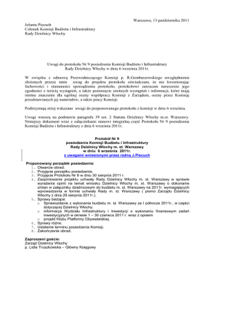 Warszawa, 13 pa dziernika 2011 Jolanta Piecuch Cz onek Komisji Bud"etu i Infrastruktury Rady Dzielnicy W ochy Uwagi do protoko u Nr 9 posiedzenia Komisji Bud"etu i Infrastruktury Rady Dzielnicy W ochy w dniu 6 wrze-nia 2011r. W zwi/zku z odmow/ Przewodnicz/cego Komisji p. R.Gembarzewskiego uwzgl2dnienia z o"onych przeze mnie uwag do projektu protoko u o-wiadczam, "e nie kwestionuj/c fachowo-ci i staranno-ci sporz/dzenia protoko u, protoko owi zarzucam naruszenie jego zgodno-ci z tre-ci/ wyst/pie3, a tak"e pomini2cie istotnych wyst/pie3 i informacji, które maj/ istotne znaczenie dla ogólnej oceny wspó pracy Komisji z Zarz/dem, oceny przez Komisj2 przedstawianych jej materia ów, a tak"e pracy Komisji. Podtrzymuj2 ni"ej wskazane uwagi do proponowanego protoko u z komisji w dniu 6 wrze-nia. Uwagi wnosz2 na podstawie paragrafu 39 ust. 2 Statutu Dzielnicy W ochy m.st. Warszawy. Niniejszy dokument wraz z za /cznikami stanowi integraln/ cz2-7 Protoko u Nr 9 posiedzenia Komisji Bud"etu i Infrastruktury z dnia 6 wrze-nia 2011r. Protokó Nr 9 posiedzenia Komisji Bud etu i Infrastruktury Rady Dzielnicy W ochy m. st. Warszawy w dniu 6 wrze%nia 2011r. z uwagami wniesionymi przez radn* J.Piecuch Proponowany porz*dek posiedzenia: 1. Otwarcie obrad. 2. Przyj cie porz dku posiedzenia. 3. Przyj cie Protoko u Nr 8 w dniu 30 sierpnia 2011 r. 4. Zaopiniowanie projektu uchwa y Rady Dzielnicy W ochy m. st. Warszawy w sprawie wyra'enia opinii na temat wniosku Dzielnicy W ochy m. st. Warszawy o dokonanie zmian w za czniku dzielnicowym do bud'etu m. st. Warszawy na 2011r. wymagaj cych wprowadzenia w formie uchwa y Rady m. st. Warszawy ( pismo Zarz du Dzielnicy W ochy z dnia 29 sierpnia 2011r.). 5. Sprawy bie' ce: o Sprawozdanie z wykonania bud'etu m. st. Warszawy za I pó rocze 2011r., w cz 2ci dotycz cej Dzielnicy W ochy. o informacja Wydzia u Infrastruktury i Inwestycji o wykonaniu finansowym zada3 inwestycyjnych w okresie 1 – 30 czerwca 2011 r. wraz z opisem o projekt Klubu Platformy Obywatelskiej. 6. Sprawy ró'ne. 7. Ustalenie terminu posiedzenia Komisji. 8. Zako3czenie obrad. Zaproszeni go%cie: Zarz d Dzielnicy W ochy p. Lidia Truszkowska – G ówny Ksi gowy Ad.1 Przewodnicz cy Komisji Roman Gembarzewski otworzy posiedzenie, stwierdzi obecno2: 10 radnych. Powita go2ci: p. Micha a W sowicza Burmistrza Dzielnicy W ochy, p. Lidi Truszkowsk G ówna Ksi gow , p. Zbigniewa Wieczorka Naczelnika Wydzia u Infrastruktury i Inwestycji, p. Katarzyn =witalsk Naczelnika Wydzia u Kultury i Promocji. Ad.2 Porz dek posiedzenia przyj to jednog o2nie po przeniesieniu na nast pne posiedzenie Komisji przyj cia protoko u z posiedzenia Komisji w dniu 30 sierpnia 2011r Ad.4 Zaopiniowanie projektu uchwa y Rady Dzielnicy W ochy m. st. Warszawy w sprawie wyra'enia opinii na temat wniosku Dzielnicy W ochy m. st. Warszawy o dokonanie zmian w za czniku dzielnicowym do bud'etu m. st. Warszawy na 2011r. wymagaj cych wprowadzenia w formie uchwa y Rady m. st. Warszawy ( pismo Zarz du Dzielnicy W ochy z dnia 29 sierpnia 2011r.). W zwi zku ze z o'onymi przez wydzia y merytoryczne i jednostki organizacyjne Dzielnicy (WAG, WIN, WIR, WKU, WOW, WO=, DBFO, OPS, OSiR, ZGN) wnioskami o dokonanie zmian w za czniku Dzielnicy W ochy polegaj cych na: o Zwi kszeniu planu dochodów realizowanych przez Dzielnic o Zwi kszeniu planu wydatków bie' cych przeznaczonych na: - realizacj zada3 z zakresu utrzymania i remontów dróg gminnych (WIR) - realizacj zada3 z zakresu adu przestrzennego i gosp. nieruchomo2ciami (ZGN) - realizacj zada3 z zakresu Edukacji (WOW i DBFO) - realizacj zada3 z zakresu gospodarki komunalnej i ochrony 2rodowiska (WO=) - realizacj zada3 z zakresu kultury (WKU: D.K. W ochy i Biblioteka Publiczna) - przeniesienie 2rodków finansowych w planie wydatków maj tkowych pomi dzy zadaniami, paragrafami, rozdzia ami i dzia ami klasyfikacji bud'etowej o Zwi kszeniu planów dochodu na wydzielonych rachunkach jednostek bud'etowych prowadz cych dzia alno2: okresow w ustawie o systemie o2wiaty i wydatków nimi finansowanych na rok 2011 w Szkole Podstawowej: Nr 87, Gimnazjum Nr 114 oraz Liceum Ogólnokszta c ce Nr 73 (DBFO) Zarz d Dzielnicy przekaza projekt uchwa y do zaopiniowania przez Komisj . Przewodnicz*cy Komisji Roman Gembarzewski nakre2li w ogólnym zarysie wnioski i zastrze'enia zg oszone przez radnych na poprzednim posiedzeniu do zaproponowanych zmian w za czniku dzielnicowym. Zaproponowa przyj cie konwencji, aby zaproszeni go2cie udzielali informacji w odpowiedzi na uwagi radnych co do zasadno2ci i celowo2ci proponowanych zmian w za czniku. Na wst pie przekaza g os Burmistrzowi Dzielnicy. Pan Micha W*sowicz Burmistrz Dzielnicy W ochy odniós si do wydatków maj tkowych Dzielnicy. Odno2nie wykorzystania 2rodków finansowych zabezpieczonych na wykup gruntów pod ul. Dzwonkow . poinformowa , 'e z uwagi na brak mo'liwo2ci wykupu w tym roku utrzymanie tej pozycji niecelowe. St d propozycja przeznaczenia 2rodków na zakupy inwestycyjne i modernizacje na rzecz poprawy jako2ci funkcjonowania ZGN, D.K. W ochy, Biblioteki, Urz du Dzielnicy W ochy. Wykorzystane 2rodki przyczyni si do oszcz dno2ci po stronie wydatków bie' cych w roku przysz ym. Zaznaczy , 'e m.in. zrealizowanie monitoringu w siedzibie ZGN, w przysz ym roku zmniejszy wydatki na ochron fizyczn obiektu. Doda , 'e analogiczne zrealizowanie innych propozycji zada3 opisanych we wniosku zaowocuje zmniejszeniem wydatków bie' cych z tego tytu u w przysz ym roku. Usuni to: temat wniosku dotycz cego Usuni to: Skupi uwag na kwestii Usuni to: drogi. Usuni to: Zaznaczy Usuni to: ograniczone Usuni to: y Usuni to: s Usuni to: proponowane w uchwale zadania. Zadania te s Przewodnicz*cy Komisji Roman Gembarzewski przekaza g os Katarzynie =witalskiej Naczelnikowi Wydzia u Kultury i Promocji. Usuni to: ami Naczelnik Katarzyna 3witalska odnios a si do uwag dotycz cych przesuni cia 2rodków na zakupy dla Domu Kultury W ochy. Uzasadni a potrzeb zakupu luster do sali widowiskowej, gdzie odbywa si najw
