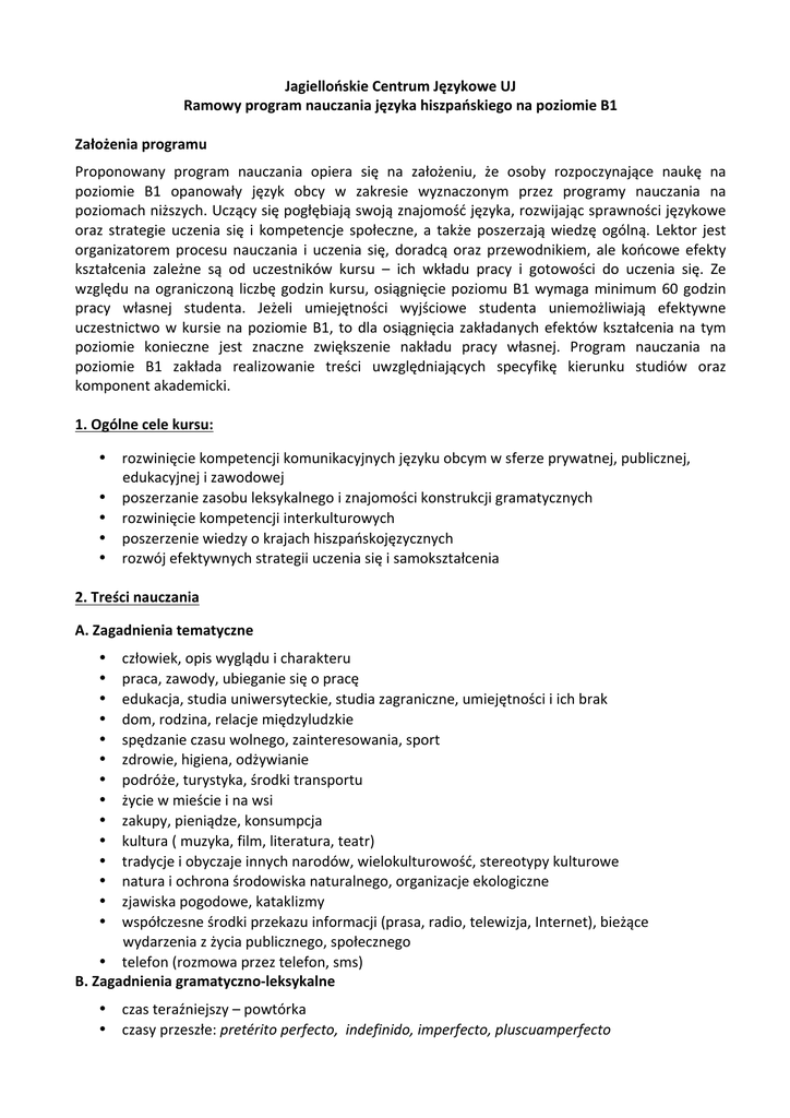 Jagiellońskie Centrum Językowe UJ Ramowy program nauczania języka hiszpańskiego na poziomie B1 Założenia programu Proponowany program nauczania opiera się na założeniu, że osoby rozpoczynające naukę na poziomie B1 opanowały język obcy w zakresie wyznaczonym przez programy nauczania na poziomach niższych. Uczący się pogłębiają swoją znajomość języka, rozwijając sprawności językowe oraz strategie uczenia się i kompetencje społeczne, a także poszerzają wiedzę ogólną. Lektor jest organizatorem procesu nauczania i uczenia się, doradcą oraz przewodnikiem, ale końcowe efekty kształcenia zależne są od uczestników kursu – ich wkładu pracy i gotowości do uczenia się. Ze względu na ograniczoną liczbę godzin kursu, osiągnięcie poziomu B1 wymaga minimum 60 godzin pracy własnej studenta. Jeżeli umiejętności wyjściowe studenta uniemożliwiają efektywne uczestnictwo w kursie na poziomie B1, to dla osiągnięcia zakładanych efektów kształcenia na tym poziomie konieczne jest znaczne zwiększenie nakładu pracy własnej. Program nauczania na poziomie B1 zakłada realizowanie treści uwzględniających specyfikę kierunku studiów oraz komponent akademicki. 1. Ogólne cele kursu: rozwinięcie kompetencji komunikacyjnych języku obcym w sferze prywatnej, publicznej, edukacyjnej i zawodowej • poszerzanie zasobu leksykalnego i znajomości konstrukcji gramatycznych • rozwinięcie kompetencji interkulturowych • poszerzenie wiedzy o krajach hiszpańskojęzycznych • rozwój efektywnych strategii uczenia się i samokształcenia 2. Treści nauczania • A. Zagadnienia tematyczne człowiek, opis wyglądu i charakteru praca, zawody, ubieganie się o pracę edukacja, studia uniwersyteckie, studia zagraniczne, umiejętności i ich brak dom, rodzina, relacje międzyludzkie spędzanie czasu wolnego, zainteresowania, sport zdrowie, higiena, odżywianie podróże, turystyka, środki transportu życie w mieście i na wsi zakupy, pieniądze, konsumpcja kultura ( muzyka, film, literatura, teatr) tradycje i obyczaje innych narodów, wielokulturowość, stereotypy kulturowe natura i ochrona środowiska naturalnego, organizacje ekologiczne zjawiska pogodowe, kataklizmy współczesne środki przekazu informacji (prasa, radio, telewizja, Internet), bieżące wydarzenia z życia publicznego, społecznego • telefon (rozmowa przez telefon, sms) B. Zagadnienia gramatyczno-‐leksykalne • • • • • • • • • • • • • • • czas teraźniejszy – powtórka • czasy przeszłe: pretérito perfecto, indefinido, imperfecto, pluscuamperfecto • konstrukcja estar +gerundio (estoy/he estado/estuve/estaba) • tryb subjuntivo: presente de subjuntivo, pretérito perfecto de subjuntivo oraz pretérito imperfecto de subjuntivo • indicativo / subjuntivo w zdaniach dopełnieniowych, okolicznikowych czasu, celu, względnych, przyzwalających • futuro simple / futuro compuesto do wyrażania przyszłości oraz przypuszczeń • tryb przypuszczający condicional simple jako forma grzecznościowa, wyrażanie życzeń me gustaría, wyrażanie przypuszczenia do przeszłości i dawanie rad w zdaniach yo que tú, deberías • tryb rozkazujący: imperativo afirmativo oraz negativo z zaimkami dopełnienia bliższego i dalszego • zdania warunkowe I, II • mowa zależna; przekazywanie informacji, pytań (dice, pregunta, dijo, preguntó) próśb, sugestii (dice, pide) • strona bierna • zdania bezosobowe • konstrukcje peryfrastyczne z infinitivo (empezar a, dejar de, acabar de, volver a, seguir sin) oraz seguir+gerundio, llevar+gerundio • konstrukcje do wyrażania trwania czynności hace … que, desde hace, desde • ser/ estar • słowotwórstwo • spójniki • rodzajniki -‐ poszerzenie wiadomości • przyimki -‐ poszerzenie wiadomości, rekcja czasowników • wybrane wyrażenia idiomatyczne i przysłowia C) funkcje językowe • opisywanie cech osób i miejsc, właściwości przedmiotów i zjawisk, formułowanie definicji, np. Es una persona amable. Está guapa. Es de metal, sirve para...,está en ... • przywoływanie wspomnień, relacjonowanie wydarzeń z uwzględnieniem okoliczności, opowiadanie anegdot, np. ¿A qué tipo de escuela ibas? Estaba en el salón viendo la tele, cuando oí el disparo. • przedstawianie początku, trwania i końca danej czynności, np. Empecé a jugar al tenis en 2012. Llevo dos años tocando la guitarra. He dejado de fumar. • mówienie o umiejętnościach i ich braku. Soy bastante bueno dibujando, soy capaz de … Los idiomas me resultan fáciles. Me cuesta aprenderlo. • proszenie o radę, udzielanie rad i wskazówek, np. Usa siempre crema protectora. No lleves mucho dinero. Deberías descansar. Yo en tu lugar esperaría. Te aconsejo que te compres una buena guía. Es importante hacerlo / que lo hagas. • rozkazywanie, nakazywanie, np. ¡Hazlo!, ¡No te vayas! • przekazywanie informacji, pytań (dice, pregunta, dijo, preguntó) próśb, sugestii (dice, pide) Dice que tiene hambre y pregunta si tienes dinero. Pide que le compres un helado. Dijo que no lo sabía y preguntó cómo nos habíamos enterado. • przedstawianie opinii na dany temat, argumentowanie, podsumowanie, np. Creo que es interesante, pero no pienso que sea urgente. Está claro que hay muchos problemas y no es verdad que el gobierno no haga nada. En mi opinión... Por un lado... por otro lado... Además, etc. • stwierdzanie faktu i ocenianie, np. Es evidente que prefieren esperar. Es lógico que no llamen. • wyrażanie przypuszczenia, np. Quizás... Probablemente... Serán las ocho. Saldría de Cracovia... • wyrażanie uczuć, upodobań, emocji, np. Me gusta bailar / que mi novio sepa bailar. Odio tener que esperar/ que mi amiga llegue tarde. Me da vergüenza hablar en público • wyrażanie zdziwienia, żalu, np. ¡Qué raro que no nos llame / que no haya llamado! ¡Qué pena que no puedas irte de vacaciones! • wyrażanie zgody 