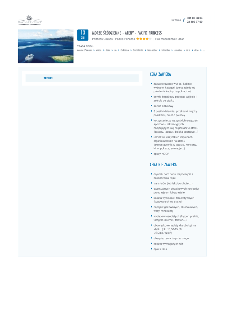 Infolinia 13 MORZE ŚRÓDZIEMNE - ATENY - PACIFIC PRINCESS DNI Princess Cruises - Pacific Princess 801 08 08 03 22 492 77 90 | Rok modernizacji: 2002 TRASA REJSU: Ateny (Pireus) TERMIN Volos dzie Ja Odessa Constanta Nessebar Istambu Istambu dzie dzie CENA ZAWIERA zakwaterowanie w 2-os. kabinie wybranej kategorii (cena zależy od położenia kabiny na pokładzie) serwis bagażowy podczas wejścia i zejścia ze statku serwis kabinowy 3 posiłki dziennie, przekąski między posiłkami, bufet o północy korzystanie ze wszystkich urządzeń sportowo - rekreacyjnych znajdujących się na pokładzie statku (baseny, jacuzzi, boiska sportowe…) udział we wszystkich imprezach organizowanych na statku (przedstawienia w teatrze, koncerty, kino, pokazy, animacje...) opłaty NCCF CENA NIE ZAWIERA dojazdu do/z portu rozpoczęcia i zakończenia rejsu transferów (lotnisko/port/hotel...) ewentualnych dodatkowych noclegów przed rejsem lub po rejsie kosztu wycieczek fakultatywnych (kupowanych na statku) napojów gazowanych, alkoholowych, wody mineralnej wydatków osobistych (fryzjer, pralnia, fotograf, internet, telefon...) obowiązkowej opłaty dla obsługi na statku (ok. 13,50-15,50 USD/os./dzień) ubezpieczenia turystycznego kosztu wymaganych wiz opłat i taks ...