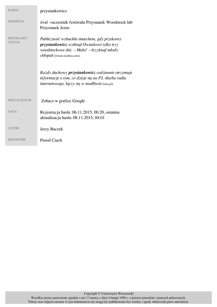 HASŁO przystankowicz DEFINICJA środ. «uczestnik festiwalu Przystanek Woodstock lub Przystanek Jezus» PRZYKŁADY UŻYCIA Publiczność wybuchła śmiechem, gdy przekorny przystankowicz wytknął Owsiakowi tylko trzy woodstockowe dni. – Mało! – krzyknął młody chłopak (forum-wishlist.com). Każdy duchowy przystankowicz codziennie otrzymuje informacje o tym, co dzieje się na PJ, słucha radia internetowego, łączy się w modlitwie (ekai.pl). WIZUALIZACJE Zobacz w grafice Google DATA Rejestracja hasła: 06.11.2015, 00.20, ostatnia aktualizacja hasła: 08.11.2015, 04.01 AUTOR Jerzy Buczek REDAKTOR Paweł Ciach Copyright © Uniwersytet Warszawski Wszelkie prawa zastrzeżone zgodnie z art.17 ustawy z dnia 4 lutego 1994 r. o prawie autorskim i prawach pokrewnych. Teksty oraz zdjęcia zawarte w tym dokumencie nie mogą być publikowane bez wiedzy i zgody właściciela praw autorskich. Powered by TCPDF (www.tcpdf.org)