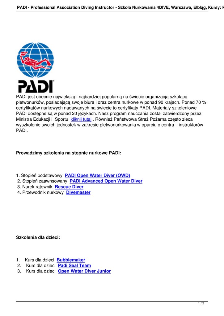 PADI - Professional Association Diving Instructor - Szkoła Nurkowania 4DIVE, Warszawa, Elbląg, Kursy: P PADI jest obecnie największą i najbardziej popularną na świecie organizacją szkolącą płetwonurków, posiadającą swoje biura i oraz centra nurkowe w ponad 90 krajach. Ponad 70 % certyfikatów nurkowych nadawanych na świecie to certyfikaty PADI. Materiały szkoleniowe PADI dostępne są w ponad 20 językach. Nasz program nauczania został zatwierdzony przez Ministra Edukacji i Sportu kliknij tutaj . Również Państwowa Straż Pożarna często zleca wyszkolenie swoich jednostek w zakresie płetwonurkowania w oparciu o centra i instruktorów PADI. Prowadzimy szkolenia na stopnie nurkowe PADI: 1. Stopień podstawowy PADI Open Water Diver (OWD) 2. Stopień zaawnsowany PADI Advanced Open Water Diver 3. Nurek ratownik Rescue Diver 4. Przewodnik nurkowy Divemaster Szkolenia dla dzieci: 1. Kurs dla dzieci Bubblemaker 2. Kurs dla dzieci Padi Seal Team 3. Kurs dla dzieci Open Water Diver Junior 1/2 PADI - Professional Association Diving Instructor - Szkoła Nurkowania 4DIVE, Warszawa, Elbląg, Kursy: P Kursy specjalistyczne: 1. Nurkowanie na wzbogaconym powietrzu Nitrox 2. Nurkowanie głębokie Deep Diver 3. Nurkowanie wrakowe Wreck Diver 4. Nurkowanie nocne Night Diver 5. Podwodna nawigacja Underwater Navigator 6. Nurkowanie w suchym skafandrze Dry Suit Diver 7. Nurkowanie podlodowe Ice Diver 8. Doskonała pływalność zerowa Wreck Diver 9. Ochrona środowiska podwodnego P rojekt AWAR E 10. Kurs nurkowy S ideMount Dive r Pierwsza Pomoc Medyczna PADI Emergency First Response 2/2