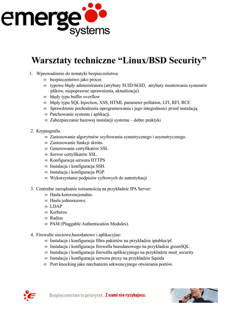 Warsztaty techniczne “Linux/BSD Security” 1. Wprowadzenie do tematyki bezpieczeństwa: • bezpieczeństwo jako proces • typowe błędy administratora (atrybuty SUID/SGID, atrybuty montowania systemów plików, niepoprawne uprawnienia, aktualizacje) • błędy typu buffer overflow • błędy typu SQL Injection, XSS, HTML parameter pollution, LFI, RFI, RCE • Sprawdzenie pochodzenia oprogramowania i jego integralności przed instalacją. • Patchowanie systemu i aplikacji. • Zabezpieczanie bazowej instalacji systemu – dobre praktyki 2. Kryptografia. • Zastosowanie algorytmów szyfrowania symetrycznego i asymetrycznego. • Zastosowanie funkcji skrótu. • Generowanie certyfikatów SSL • Serwer certyfikatów SSL. • Konfiguracja serwera HTTPS • Instalacja i konfiguracja SSH. • Instalacja i konfiguracja PGP. • Wykorzystanie podpisów cyfrowych do autentykacji 3. Centralne zarządzanie tożsamością na przykładzie IPA Server: • Hasła konwencjonalne. • Hasła jednorazowe. • LDAP • Kerberos • Radius • PAM (Pluggable Authentication Modules). 4. Firewalle sieciowe,bazodanowe i aplikacyjne: • Instalacja i konfiguracja filtra pakietów na przykładzie iptables/pf. • Instalacja i konfiguracja firewalla bazodanowego na przykładzie greenSQL • Instalacja i konfiguracja firewalla aplikacyjnego na przykładzie mod_security • Instalacja i konfiguracja serwera proxy na przykładzie Squida • Port knocking jako mechanizm sekwencyjnego otwierania portów. 5. Konfiguracja połączenia VPN na przykładzie OpenVPN. 6. Zabezpieczenia na poziomie jądra systemu: ▪ SELinux ▪ grsecurity ▪ LIDS ▪ propolice 7. Szyfrowane systemy plików. 8. Monitorowanie zdarzeń systemowych oraz integralności systemu plików z wykorzystaniem rozwiązań IDS/IPS: - OSSEC - Aide/tripewire - analiza logów 9. Tworzenie kopii zapasowych oraz odzyskiwanie danych z wykorzystaniem pakietu Bacula.