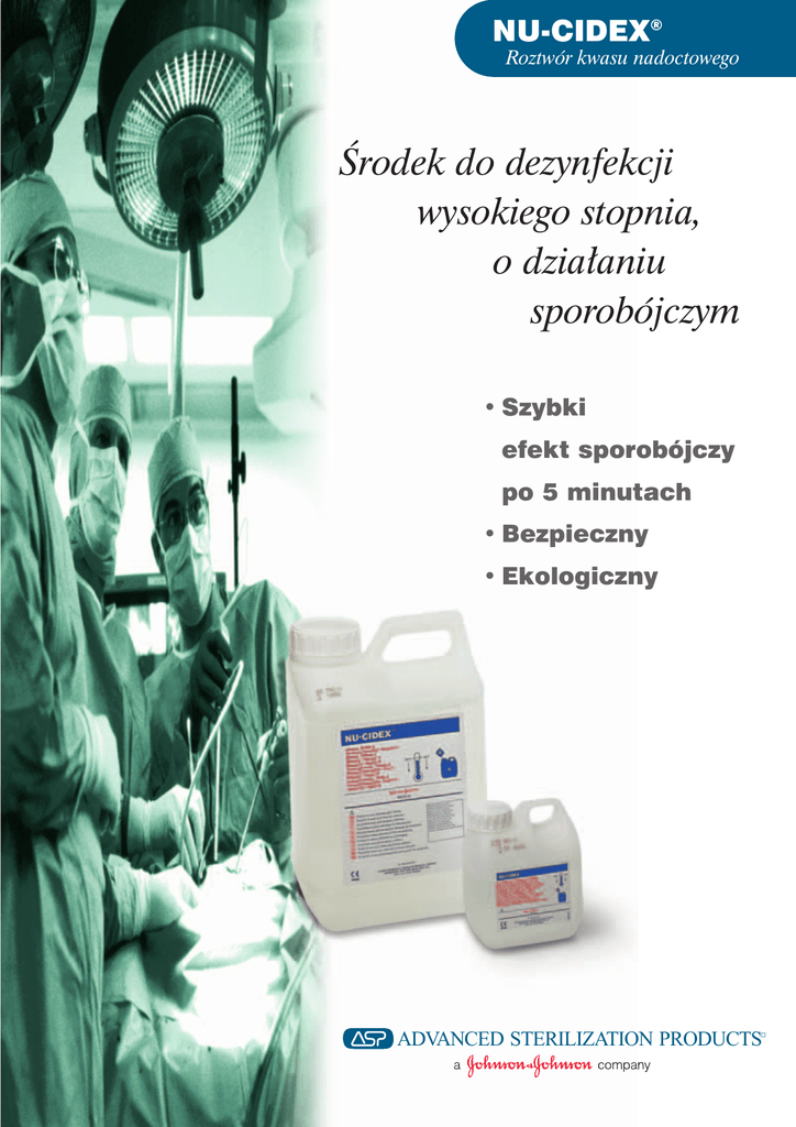 NU-CIDEX® Roztwór kwasu nadoctowego Ârodek do dezynfekcji wysokiego stopnia, o dzia∏aniu sporobójczym • Szybki efekt sporobójczy po 5 minutach • Bezpieczny • Ekologiczny ADVANCED STERILIZATION PRODUCTS¤ NU-CIDEX® Ârodek do dezynfekcji wysokiego stopnia o dzia∏aniu sporobójczym Szybki i skuteczny Êrodek do dezynfekcji wysokiego stopnia o dzia∏aniu sporobójczym NU-CIDEX® to buforowany, stabilny roztwór kwasu nadoctowego. Jest doskona∏ym preparatem zapewniajàcym dezynfekcj´ wysokiego stopnia delikatnych instrumentów medycznych wsz´dzie tam, gdzie inne metody zimnej sterylizacji sà niemo˝liwe do zastosowania. NU-CIDEX zosta∏ stworzony z myÊlà o u˝yciu w miejscach, w których istnieje potrzeba bardzo szybkiej dezynfekcji sprz´tu medycznego. W temperaturze pokojowej NU-CIDEX w ciàgu zaledwie 5 minut niszczy pràtki gruêlicy (takie szczepy, które sà oporne na dzia∏anie aldehydu glutarowego), wegetatywne formy bakterii, grzyby, wirusy i przetrwalniki bakterii. Przyjazny dla Êrodowiska NU-CIDEX rozk∏ada si´ naturalnie do tlenu, wody i dwutlenku w´gla. Mo˝e byç wylewany bezpoÊrednio do kanalizacji. NU-CIDEX jest ekologicznym preparatem, nie stwarzajàcym zagro˝enia dla Êrodowiska naturalnego. KompatybilnoÊç NU-CIDEX zosta∏ stworzony z myÊlà o dezynfekcji delikatnych instumentów medycznych, narz´dzi i endoskopów i znajduje zastosowanie w: •Oddzia∏ach Chirurgicznych •Centralnych Sterylizacjach •Pracowniach Endoskopowych Dane techniczne • Aktywacja Aktywny roztwór otrzymuje si´ przez dodanie zawartoÊci butelki B do pojemnika A • St´˝enie substancji czynnej 0.35% buforowanego roztworu kwasu nadoctowego • Przeznaczenie Roztwór do 5 minutowej dezynfekcji wysokiego stopnia o dzia∏aniu sporobójczym • Okres przydatnoÊci do u˝ycia 24 godziny • Okres przechowywania 35 tygodni •Gabinetach Stomatologicznych oraz na: •Blokach Operacyjnych • Klasyfikacja produktu Klasa IIa wed∏ug MDD 93/42/EEC • Gospodarka odpadami Usuwaç zgodnie z obowiàzujàcymi przepisami (Prosimy zapoznaç si´ z instrukcjà do∏àczonà do preparatu) Bezpieczeƒstwo w miejscu pracy W st´˝eniu roboczym NU-CIDEX wykazuje s∏aby, kwaÊny zapach z powodu obecnoÊci kwasu octowego. Najwy˝sze Dopuszczalne St´˝enie (NDS) kwasu nadoctowego nie zosta∏o ustalone. Znane sà natomiast wartoÊci NDS dla dwu produktów jego rozpadu: kwasu octowego i nadtlenku wodoru. W przeprowadzonych badaniach (otwarty 5 litrowy pojemnik Êrodka NU-CIDEX, ustawiono w szczelnie zamkni´tym pomieszczeniu, w temperaturze 32° C) nie stwierdzono obecnoÊci w powietrzu par kwasu octowego i nadtlenku wodoru. Badajàc w∏aÊciwoÊci dra˝niàce preparatu w teÊcie Magnnusson-Kligman, wykazano, ˝e NU-CIDEX ma zdecydowanie mniejsze oddzia∏ywanie dra˝niàce ni˝ aldehyd glutarowy. Produkt NU-CIDEX® Kod NCX010 Jednostka sprzeda˝y 2 x 5 litrów * Trademark Johnson & Johnson Poland Sp. z o.o. ul. Szyszkowa 20, 02-285 Warszawa tel. (022) 668 00 00 fax (022) 668 00 01 Dzia∏ Obs∏ugi Klienta: tel. (022) 668 00 07, fax (022) 668 00 15; e-mail: [email protected] Dzia∏ Marketingu: tel. (022) 668 00 63, fax (022) 668 00 55 ASP/028 VIN/01/E ADVANCED STERILIZATION PRODUCTS¤