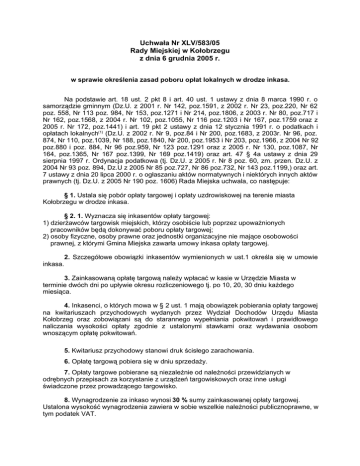 Uchwała Nr XLV/583/05 Rady Miejskiej w Kołobrzegu z dnia 6 grudnia 2005 r. w sprawie określenia zasad poboru opłat lokalnych w drodze inkasa. Na podstawie art. 18 ust. 2 pkt 8 i art. 40 ust. 1 ustawy z dnia 8 marca 1990 r. o samorządzie gminnym (Dz.U. z 2001 r. Nr 142, poz.1591, z 2002 r. Nr 23, poz.220, Nr 62 poz. 558, Nr 113 poz. 984, Nr 153, poz.1271 i Nr 214, poz.1806, z 2003 r. Nr 80, poz.717 i Nr 162, poz.1568, z 2004 r. Nr 102, poz.1055, Nr 116 poz.1203 i Nr 167, poz.1759 oraz z 2005 r. Nr 172, poz.1441) i art. 19 pkt 2 ustawy z dnia 12 stycznia 1991 r. o podatkach i opłatach lokalnych(1) (Dz.U. z 2002 r. Nr 9, poz.84 i Nr 200, poz.1683, z 2003r. Nr 96, poz. 874, Nr 110, poz.1039, Nr 188, poz.1840, Nr 200, poz.1953 i Nr 203, poz.1966, z 2004 Nr 92 poz.880 i poz. 884, Nr 96 poz.959, Nr 123 poz.1291 oraz z 2005 r. Nr 130, poz.1087, Nr 164, poz.1365, Nr 167 poz.1399, Nr 169 poz.1419) oraz art. 47 § 4a ustawy z dnia 29 sierpnia 1997 r. Ordynacja podatkowa (tj. Dz.U. z 2005 r. Nr 8 poz. 60, zm. przen. Dz.U. z 2004 Nr 93 poz. 894, Dz.U z 2005 Nr 85 poz.727, Nr 86 poz.732, Nr 143 poz.1199,) oraz art. 7 ustawy z dnia 20 lipca 2000 r. o ogłaszaniu aktów normatywnych i niektórych innych aktów prawnych (tj. Dz.U. z 2005 Nr 190 poz. 1606) Rada Miejska uchwala, co następuje: § 1. Ustala się pobór opłaty targowej i opłaty uzdrowiskowej na terenie miasta Kołobrzegu w drodze inkasa. § 2. 1. Wyznacza się inkasentów opłaty targowej: 1) dzierżawców targowisk miejskich, którzy osobiście lub poprzez upoważnionych pracowników będą dokonywać poboru opłaty targowej; 2) osoby fizyczne, osoby prawne oraz jednostki organizacyjne nie mające osobowości prawnej, z którymi Gmina Miejska zawarła umowy inkasa opłaty targowej. 2. Szczegółowe obowiązki inkasentów wymienionych w ust.1 określa się w umowie inkasa. 3. Zainkasowaną opłatę targową należy wpłacać w kasie w Urzędzie Miasta w terminie dwóch dni po upływie okresu rozliczeniowego tj. po 10, 20, 30 dniu każdego miesiąca. 4. Inkasenci, o których mowa w § 2 ust. 1 mają obowiązek pobierania opłaty targowej na kwitariuszach przychodowych wydanych przez Wydział Dochodów Urzędu Miasta Kołobrzeg oraz zobowiązani są do starannego wypełniania pokwitowań i prawidłowego naliczania wysokości opłaty zgodnie z ustalonymi stawkami oraz wydawania osobom wnoszącym opłatę pokwitowań. 5. Kwitariusz przychodowy stanowi druk ścisłego zarachowania. 6. Opłatę targową pobiera się w dniu sprzedaży. 7. Opłaty targowe pobierane są niezależnie od należności przewidzianych w odrębnych przepisach za korzystanie z urządzeń targowiskowych oraz inne usługi świadczone przez prowadzącego targowisko. 8. Wynagrodzenie za inkaso wynosi 30 % sumy zainkasowanej opłaty targowej. Ustalona wysokość wynagrodzenia zawiera w sobie wszelkie należności publicznoprawne, w tym podatek VAT. § 3. 1. Inkasentami opłaty uzdrowiskowej są, osoby fizyczne, osoby prawne i inne jednostki organizacyjne nie posiadające osobowości prawnej prowadzące: sanatoria, zakłady uzdrowiskowe, hotele, pensjonaty, domy i ośrodki wypoczynkowe, ośrodki szkoleniowe, campingi, pola namiotowe i inne obiekty o podobnym przeznaczeniu. 2. Szczegółowe obowiązki inkasentów wymienionych w ust. 1 określone są w umowie o inkaso. 3. Inkasentami opłaty uzdrowiskowej są również osoby fizyczne prowadzące działalność gospodarczą w zakresie wynajmu kwater prywatnych. § 4. Zainkasowaną opłatę uzdrowiskową należy wpłacać w kasie w Urzędzie Miasta w terminie 7 dni po zakończeniu miesiąca, w którym odbywał się pobór opłaty. § 5. Inkasenci, o których mowa w § 3 ust. 3, mają obowiązek pobierania opłaty uzdrowiskowej na kwitariuszach przychodowych wydanych przez Wydział Dochodów Urzędu Miasta Kołobrzeg oraz zobowiązani są do starannego wypełniania pokwitowań i prawidłowego naliczania wysokości opłaty zgodnie z ustalonymi stawkami oraz wydawania osobom wnoszącym opłatę pokwitowań. § 6.1. Za inkaso opłaty uzdrowiskowej inkasentom przysługuje wynagrodzenie w wysokości 20% zainkasowanej kwoty opłaty uzdrowiskowej i wpłaconej na rzecz miasta. Ustalona wysokość wynagrodzenia zawiera w sobie wszelkie należności publicznoprawne, w tym podatek VAT. 2. Wynagrodzenie jest płatne na podstawie rozliczenia - zestawienia pokwitowań wg kwitariuszy w przypadku osób fizycznych prowadzących wynajem kwater prywatnych, natomiast w przypadku pozostałych osób na podstawie przedłożonego rachunku wraz z zestawieniem dziennych wpłat opłat uzdrowiskowych. § 7. Inkasent odpowiada całym swoim majątkiem za pobraną opłatę a nie wpłaconą na rachunek miasta. § 8. Kwitariusz przychodowy stanowi druk ścisłego zarachowania i podlega zwrotowi. § 9. Traci moc uchwała Nr XXIX/368/04 Rady Miejskiej w Kołobrzegu z dnia 30 listopada 2004 r. w sprawie określenia zasad poboru opłat lokalnych w drodze inkasa. § 10. Wykonanie uchwały powierza się Prezydentowi Miasta Kołobrzeg. § 11. Uchwała wchodzi w życie po upływie 14 dni od dnia jej ogłoszenia w Dzienniku Urzędowym Województwa Zachodniopomorskiego. Przewodniczący Rady Miejskiej w Kołobrzegu Janusz Gromek (1) Niniejsza ustawa dokonuje w zakresie swojej regulacji wdrożenia następujących dyrektyw Wspólnot Europejskich: 1) dyrektywy 92/106/EWG z dnia 7 grudnia 1992 r. w sprawie ustanowienia wspólnych zasad dla niektórych typów transportu kombinowanego towarów między państwami członkowskimi (Dz.Urz.WE L 368 z 17.12.1992), 2) dyrektywy 1999/62/WE z dnia 17 czerwca 1999 r. w sprawie pobierania opłat za użytkowanie niektórych typów infrastruktury przez pojazdy ciężarowe (Dz.Urz.WE L 187 z 20.07.1999) dane dotyczące ogłoszenia aktów prawa Unii Europejskiej, zamieszczone w niniejszej ustawie z dniem uzyskania przez Rzeczpospolitą Polską członkostwa w Unii Europejskiej – dotyczą ogłoszenia tych aktów w Dzienniku Urzędowym Unii 