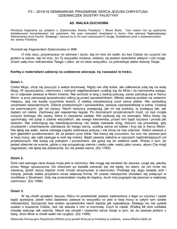 F3 – 2015/16 SEMINARIUM: PRAGNIENIE SERCA JEZUSA CHRYSTUSA. DZIENNICZEK SIOSTRY FAUSTYNY A5. WALKA DUCHOWA Poniższe fragmenty są cytatami z „Dzienniczka Siostry Faustyny” i Słowo Boże. Tym razem nie są opatrzone dodatkowymi komentarzami lub pytaniami. Na czas rozważań (medytacji w domu i/lub adoracji Najświętszego Sakramentu) proś Ducha Świętego i Jezusa by to On sam wskazywał Ci drogę. Dodatkowo proś o wstawiennictwo św. siostry Faustyny. Pomódl się fragmentem Dzienniczka nr 898. O mój Jezu, przywracasz mi zdrowie i życie, daj mi moc do walki, bo bez Ciebie nic uczynić nie jestem w stanie, daj mi moc, bo Ty wszystko możesz, widzisz, że jestem dzieckiem słabym i cóż mogę. Znam całą moc miłosierdzia Twego i ufam, że mi dasz wszystko, co potrzebuje słabe dziecię Twoje. Kartkę z materiałami zabieraj na codzienne adoracje, by rozważać te treści. Dzień 1. Córka Moja, chcę cię pouczyć o walce duchowej. Nigdy nie ufaj sobie, ale całkowicie zdaj się na wolę Moją. W opuszczeniu, ciemności i różnych wątpliwościach uciekaj się do Mnie i do kierownika swego, on ci odpowie zawsze w Moim imieniu. Nie wchodź w targ z żadną pokusą, zaraz zamykaj się w Sercu Moim, a przy pierwszej sposobności odkryj ją przed spowiednikiem. Miłość własną postaw na ostatnim miejscu, aby nie kaziła uczynków twoich. Z wielką cierpliwością znoś sama siebie. Nie zaniedbuj umartwień wewnętrznych. Zdanie przełożonych i spowiednika, zawsze usprawiedliwiaj w sobie. Uciekaj od szemrzących, jak od zarazy. Niech wszyscy postępują, jak im się podoba, ty postępuj tak, jak żądam od ciebie. Zachowuj jak najwierniej regułę. Po doznanych przykrościach myśl, co byś mogła uczynić dobrego dla osoby, która ci cierpienie zadała. Nie wylewaj się na zewnątrz. Milcz kiedy cię upominają; nie pytaj o zdanie wszystkich, ale swego kierownika; przed nim bądź szczera i prosta jak dziecko. Nie zniechęcaj się niewdzięcznością; nie badaj ciekawie dróg, którymi cię prowadzę; gdy znudzenie i zniechęcenie zakołacze do twego serca, uciekaj sama od siebie i kryj się w Sercu Moim. Nie lękaj się walki, sama odwaga często odstrasza pokusy i nie śmią na nas uderzać. Walcz zawsze z tym głębokim przekonaniem, że Ja jestem przy tobie. Nie kieruj się uczuciem, bo ono nie zawsze jest w twej mocy, ale cała zasługa w woli się mieści. Bądź zawsze zależna w rzeczach najdrobniejszych od przełożonych. Nie łudzę cię pokojem i pociechami, ale gotuj się do wielkich walk. Wiedz o tym, że jesteś obecnie na scenie, gdzie ci się przypatruje ziemia i niebo całe; walcz jako rycerz, abym Cię mógł nagradzać; nie lękaj się zbytecznie, bo nie jesteś sama. (Dz 1760) Dzień 2. Dziś nad samego rana dusza moja jest w ciemnicy. Nie mogę się wznieść do Jezusa, czuję się, jakoby przez Niego opuszczona. Do stworzeń po światła zwracać się nie będę, bo wiem, że oni mnie nie oświecą, jeżeli Jezus będzie mnie chciał utrzymywać w ciemności. Poddaję się Jego świętej woli i cierpię, jednak walka przybiera coraz większą formę. W czasie nieszporów chciałam się połączyć w modlitwie z Siostrami. Gdy się przeniosłam myślą do kaplicy, duch mój pogrążył się jeszcze w większej ciemności. (Dz 1496) Dzień 3. W tej chwili ujrzałam Jezusa, Który mi powiedział: jestem zadowolony z tego co czynisz i nadal bądź spokojna, jeżeli robić będziesz zawsze to wszystko co jest w twej mocy w całym tym dziele miłosierdzia. Szczerość twa wobec spowiednika niech będzie jak największa. Dlatego nic nie zyskał szatan z kuszenia Ciebie, żeś nie weszła z nim w rozmowę. Czyń to nadal. Wielką Mi dziś oddałaś chwałę walcząc tak wiernie. Niech się utrwali i utwierdzi serce twoje w tym, że Ja zawsze jestem z tobą, choć Mnie w chwili walki nie czujesz. (Dz 1499) Materiały formacyjne Wspólnoty Effatha przy parafii Wieczerzy Pańskiej w Lublinie; www.effatha-lublin.pl Dzień 4. Dziś po Komunii św. Jezus dał mi znowu kilka wskazówek: pierwsze - nie walcz sama z pokusą, ale natychmiast odsłoń ją spowiednikowi, a wtenczas pokusa straci całą swą siłę; drugie - w tych doświadczeniach nie trać pokoju, przeżywaj Moją obecność, proś o pomoc Matkę Moją i Świętych; trzecie - miej tę pewność, że Ja na ciebie patrzę i wspieram cię; czwarte - nie lękaj się ani walk duchowych, ani żadnych pokus, bo Ja cię wspieram, byleś ty chciała walczyć, wiedz, że zawsze zwycięstwo jest po twojej stronie; piąte wiedz, że przez mężną walkę oddajesz Mi wielką chwałę, a sobie skarbisz zasługi, pokusa daje sposobność do okazania Mi wierności. (Dz 1560) Dzień 5. Ja milcząc dalej i aktem woli trwam ogólnie w Bogu, choć jęk wyrywa się z serca. Nareszcie odszedł kusiciel, a ja umęczona zasnęłam natychmiast. Rano kiedy przyjęłam Komunię św. i zaraz po Komunii św. weszłam da swej celi padając na kolana i odnowiłam akt poddania się we wszystkim Najświętszej woli Boga. Proszę Cię, Jezu, daj mi moc do walki, niech się ze mną stanie według Najświętszej woli Twojej. Dusza moja rozmiłowała się w Najświętszej woli Twojej. (Dz 1498) Dzień 6. +J.M.J. Czuję, że broni mnie jakaś moc i osłania przeciwko pociskom nieprzyjaciela. Strzeże mnie i broni, czuję to nadto dobrze, jestem osłonięta, jakby cieniem Jego skrzydeł. (Dz 1799) Materiały formacyjne Wspólnoty Effatha przy parafii Wieczerzy Pańskiej w Lublinie; www.effatha-lublin.pl