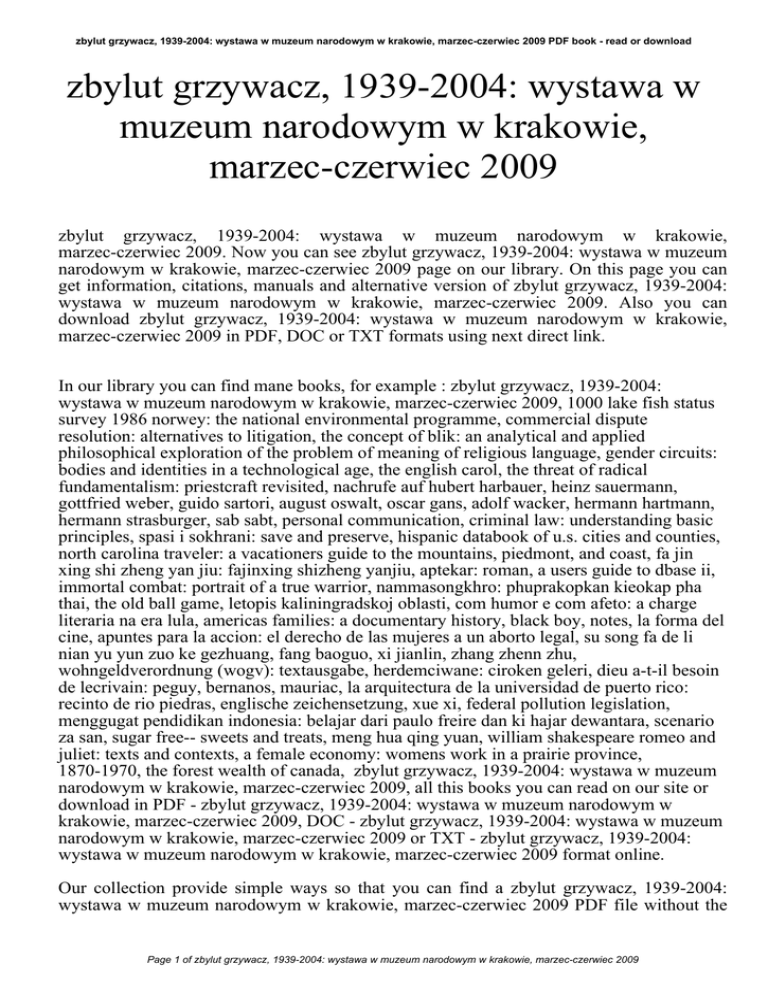 zbylut grzywacz, 1939-2004: wystawa w muzeum narodowym w krakowie, marzec-czerwiec 2009 PDF book - read or download zbylut grzywacz, 1939-2004: wystawa w muzeum narodowym w krakowie, marzec-czerwiec 2009 zbylut grzywacz, 1939-2004: wystawa w muzeum narodowym w krakowie, marzec-czerwiec 2009. Now you can see zbylut grzywacz, 1939-2004: wystawa w muzeum narodowym w krakowie, marzec-czerwiec 2009 page on our library. On this page you can get information, citations, manuals and alternative version of zbylut grzywacz, 1939-2004: wystawa w muzeum narodowym w krakowie, marzec-czerwiec 2009. Also you can download zbylut grzywacz, 1939-2004: wystawa w muzeum narodowym w krakowie, marzec-czerwiec 2009 in PDF, DOC or TXT formats using next direct link. In our library you can find mane books, for example : zbylut grzywacz, 1939-2004: wystawa w muzeum narodowym w krakowie, marzec-czerwiec 2009, 1000 lake fish status survey 1986 norwey: the national environmental programme, commercial dispute resolution: alternatives to litigation, the concept of blik: an analytical and applied philosophical exploration of the problem of meaning of religious language, gender circuits: bodies and identities in a technological age, the english carol, the threat of radical fundamentalism: priestcraft revisited, nachrufe auf hubert harbauer, heinz sauermann, gottfried weber, guido sartori, august oswalt, oscar gans, adolf wacker, hermann hartmann, hermann strasburger, sab sabt, personal communication, criminal law: understanding basic principles, spasi i sokhrani: save and preserve, hispanic databook of u.s. cities and counties, north carolina traveler: a vacationers guide to the mountains, piedmont, and coast, fa jin xing shi zheng yan jiu: fajinxing shizheng yanjiu, aptekar: roman, a users guide to dbase ii, immortal combat: portrait of a true warrior, nammasongkhro: phuprakopkan kieokap pha thai, the old ball game, letopis kaliningradskoj oblasti, com humor e com afeto: a charge literaria na era lula, americas families: a documentary history, black boy, notes, la forma del cine, apuntes para la accion: el derecho de las mujeres a un aborto legal, su song fa de li nian yu yun zuo ke gezhuang, fang baoguo, xi jianlin, zhang zhenn zhu, wohngeldverordnung (wogv): textausgabe, herdemciwane: ciroken geleri, dieu a-t-il besoin de lecrivain: peguy, bernanos, mauriac, la arquitectura de la universidad de puerto rico: recinto de rio piedras, englische zeichensetzung, xue xi, federal pollution legislation, menggugat pendidikan indonesia: belajar dari paulo freire dan ki hajar dewantara, scenario za san, sugar free-- sweets and treats, meng hua qing yuan, william shakespeare romeo and juliet: texts and contexts, a female economy: womens work in a prairie province, 1870-1970, the forest wealth of canada, zbylut grzywacz, 1939-2004: wystawa w muzeum narodowym w krakowie, marzec-czerwiec 2009, all this books you can read on our site or download in PDF - zbylut grzywacz, 1939-2004: wystawa w muzeum narodowym w krakowie, marzec-czerwiec 2009, DOC - zbylut grzywacz, 1939-2004: wystawa w muzeum narodowym w krakowie, marzec-czerwiec 2009 or TXT - zbylut grzywacz, 1939-2004: wystawa w muzeum narodowym w krakowie, marzec-czerwiec 2009 format online. Our collection provide simple ways so that you can find a zbylut grzywacz, 1939-2004: wystawa w muzeum narodowym w krakowie, marzec-czerwiec 2009 PDF file without the Page 1 of zbylut grzywacz, 1939-2004: wystawa w muzeum narodowym w krakowie, marzec-czerwiec 2009 zbylut grzywacz, 1939-2004: wystawa w muzeum narodowym w krakowie, marzec-czerwiec 2009 PDF book - read or download digging. And by having usage of our ebooks online or by saving it on your pc, you have convenient answers with zbylut grzywacz, 1939-2004: wystawa w muzeum narodowym w krakowie, marzec-czerwiec 2009. To begin with finding zbylut grzywacz, 1939-2004: wystawa w muzeum narodowym w krakowie, marzec-czerwiec 2009, you are to find our website comprehensive zbylut grzywacz, 1939-2004: wystawa w muzeum narodowym w krakowie, marzec-czerwiec 2009 manuals listed. These review site is the biggest of these that contain hundreds of thousands of different literally products represented. You will also see that there are specific sites catered to different product categories or types, brands or niche categories related with zbylut grzywacz, 1939-2004: wystawa w muzeum narodowym w krakowie, marzec-czerwiec 2009. So depending on just what you are searching, you'll be able to choose ebooks zbylut grzywacz, 1939-2004: wystawa w muzeum narodowym w krakowie, marzec-czerwiec 2009 to fit your own needs, zbylut grzywacz, 1939-2004: wystawa w muzeum narodowym w krakowie, marzec-czerwiec 2009. Page 2 of zbylut grzywacz, 1939-2004: wystawa w muzeum narodowym w krakowie, marzec-czerwiec 2009