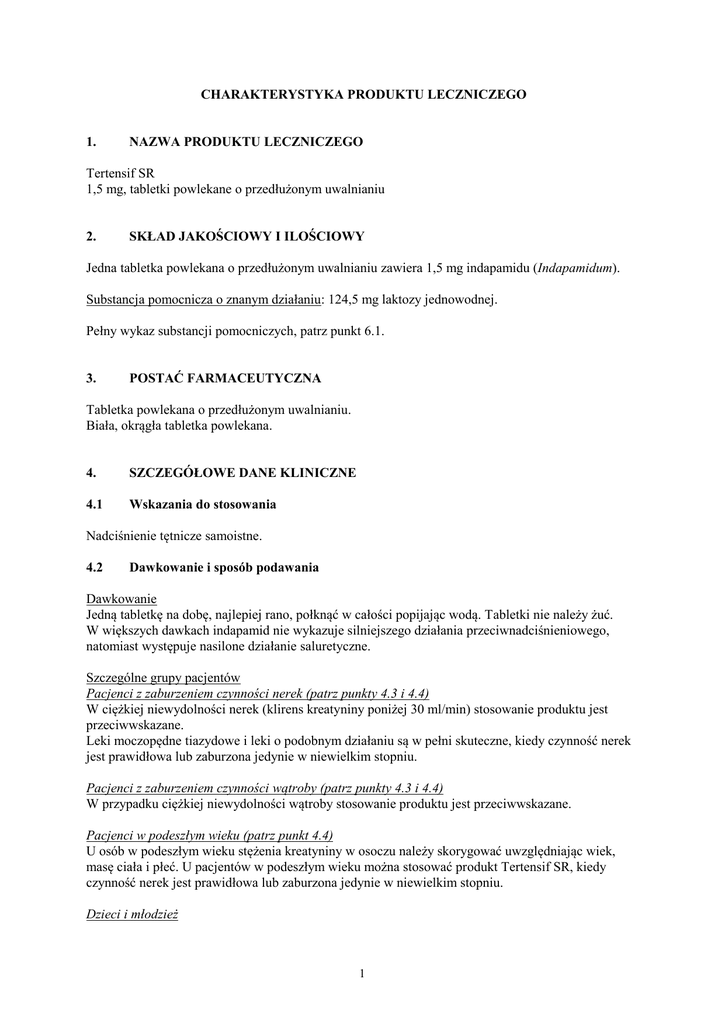 CHARAKTERYSTYKA PRODUKTU LECZNICZEGO 1. NAZWA PRODUKTU LECZNICZEGO Tertensif SR 1,5 mg, tabletki powlekane o przedłużonym uwalnianiu 2. SKŁAD JAKOŚCIOWY I ILOŚCIOWY Jedna tabletka powlekana o przedłużonym uwalnianiu zawiera 1,5 mg indapamidu (Indapamidum). Substancja pomocnicza o znanym działaniu: 124,5 mg laktozy jednowodnej. Pełny wykaz substancji pomocniczych, patrz punkt 6.1. 3. POSTAĆ FARMACEUTYCZNA Tabletka powlekana o przedłużonym uwalnianiu. Biała, okrągła tabletka powlekana. 4. SZCZEGÓŁOWE DANE KLINICZNE 4.1 Wskazania do stosowania Nadciśnienie tętnicze samoistne. 4.2 Dawkowanie i sposób podawania Dawkowanie Jedną tabletkę na dobę, najlepiej rano, połknąć w całości popijając wodą. Tabletki nie należy żuć. W większych dawkach indapamid nie wykazuje silniejszego działania przeciwnadciśnieniowego, natomiast występuje nasilone działanie saluretyczne. Szczególne grupy pacjentów Pacjenci z zaburzeniem czynności nerek (patrz punkty 4.3 i 4.4) W ciężkiej niewydolności nerek (klirens kreatyniny poniżej 30 ml/min) stosowanie produktu jest przeciwwskazane. Leki moczopędne tiazydowe i leki o podobnym działaniu są w pełni skuteczne, kiedy czynność nerek jest prawidłowa lub zaburzona jedynie w niewielkim stopniu. Pacjenci z zaburzeniem czynności wątroby (patrz punkty 4.3 i 4.4) W przypadku ciężkiej niewydolności wątroby stosowanie produktu jest przeciwwskazane. Pacjenci w podeszłym wieku (patrz punkt 4.4) U osób w podeszłym wieku stężenia kreatyniny w osoczu należy skorygować uwzględniając wiek, masę ciała i płeć. U pacjentów w podeszłym wieku można stosować produkt Tertensif SR, kiedy czynność nerek jest prawidłowa lub zaburzona jedynie w niewielkim stopniu. Dzieci i młodzież 1 Nie ustalono bezpieczeństwa stosowania i skuteczności produktu Tertensif SR u dzieci oraz młodzieży. Brak dostępnych danych. Sposób podawania Podanie doustne. 4.3 Przeciwwskazania - Nadwrażliwość na substancję czynną, inne sulfonamidy lub na którąkolwiek substancję pomocniczą wymienioną w punkcie 6.1. - Ciężka niewydolność nerek. - Encefalopatia wątrobowa lub inne ciężkie zaburzenia czynności wątroby. - Hipokaliemia. 4.4 Specjalne ostrzeżenia i środki ostrożności dotyczące stosowania Ostrzeżenia specjalne W przypadku zaburzenia czynności wątroby, leki moczopędne o działaniu podobnym do tiazydów mogą powodować encefalopatię wątrobową, szczególnie w przypadku zaburzeń gospodarki wodno-elektrolitowej. Stosowanie tych leków moczopędnych należy natychmiast przerwać w przypadku wystąpienia objawów encefalopatii wątrobowej. Nadwrażliwość na światło Opisywano przypadki reakcji uczuleniowych na światło, związanych ze stosowaniem tiazydowych leków moczopędnych oraz leków o podobnym działaniu (patrz punkt 4.8). Jeśli reakcja nadwrażliwości na światło wystąpi podczas leczenia, zaleca się odstawienie leku. Jeśli ponowne zastosowanie leku moczopędnego okaże się konieczne, zaleca się ochronę powierzchni skóry narażonej na działanie promieni słonecznych lub sztucznego promieniowania UVA. Substancje pomocnicze Ze względu na zawartość laktozy w produkcie, pacjenci z rzadko występującą dziedziczną nietolerancją galaktozy, z zespołem złego wchłaniania glukozy–galaktozy lub z niedoborem laktazy (typu Lapp) nie powinni stosować tego produktu. Środki ostrożności dotyczące stosowania - Równowaga wodno-elektrolitowa Stężenie sodu w osoczu Przed rozpoczęciem leczenia należy ocenić stężenie sodu, a następnie regularnie je kontrolować. Każde leczenie moczopędne może powodować hiponatremię, czasem z poważnymi jej konsekwencjami. Zmniejszenie stężenia sodu może być w początkowym okresie bezobjawowe, dlatego też konieczna jest jego regularna kontrola, częstsza u osób w podeszłym wieku lub pacjentów z marskością wątroby (patrz punkty 4.8 i 4.9). Stężenie potasu w osoczu Utrata potasu z hipokaliemią stanowi duże ryzyko związane ze stosowaniem leków moczopędnych tiazydowych i leków o podobnym działaniu. Należy zapobiegać rozwojowi hipokaliemii (3,4 mmol/l), szczególnie u pacjentów, u których ryzyko jej wystąpienia jest największe, np. u osób w podeszłym wieku, niedożywionych, leczonych wieloma lekami, u pacjentów z marskością wątroby z obrzękami i wodobrzuszem, z chorobą naczyń wieńcowych i niewydolnością serca. W takiej sytuacji hipokaliemia zwiększa kardiotoksyczność produktów zawierających glikozydy naparstnicy oraz ryzyko zaburzeń rytmu serca. 2 W grupie ryzyka znajdują się także pacjenci z wydłużonym odstępem QT, bez względu na to, czy jest to zaburzenie wrodzone, czy jatrogenne. Hipokaliemia, podobnie jak i bradykardia, usposabia do rozwoju ciężkich zaburzeń rytmu serca, szczególnie do potencjalnie śmiertelnego częstoskurczu typu torsade de pointes. Częstsze oznaczanie stężenia potasu w osoczu jest konieczne we wszystkich przedstawionych powyżej sytuacjach. Pierwsze oznaczenie stężenia potasu w osoczu należy wykonać w pierwszym tygodniu leczenia. W przypadku stwierdzenia hipokaliemii konieczne jest uzupełnienie potasu. Stężenie wapnia w osoczu Leki moczopędne tiazydowe i leki o podobnym działaniu mogą zmniejszać wydalanie wapnia z moczem, powodując nieznaczne i przemijające zwiększenie stężenia wapnia w osoczu. Znaczna hiperkalcemia może być skutkiem nierozpoznanej nadczynności przytarczyc. Należy przerwać leczenie powyższymi lekami przed przeprowadzeniem badania oceniającego czynność przytarczyc. - Stężenie glukozy we krwi Monitorowanie stężenia glukozy we krwi jest ważne u osób chorych na cukrzycę, szczególnie jeśli współistnieje hipokaliemia. - Kwas moczowy U pacjentów z hiperurykemią istnieje tendencja do zwiększania częstości napadów dny. - Czynność nerek a leki moczopędne Leki moczopędne tiazydowe i leki o podobnym działaniu są w pełni sk