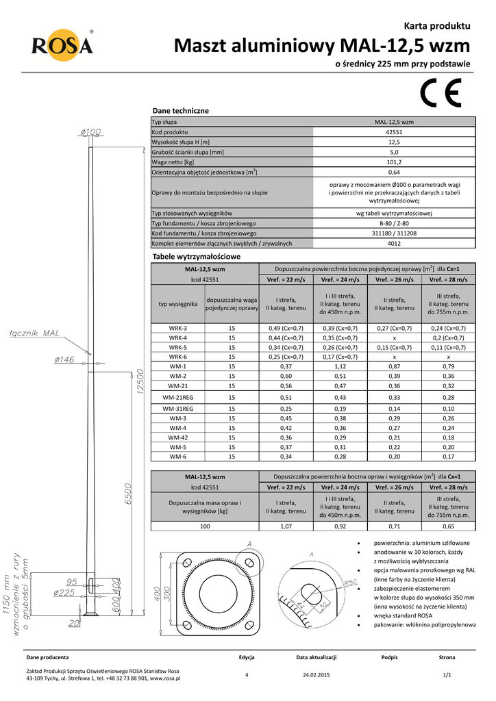 Karta produktu Maszt aluminiowy MAL-12,5 wzm o średnicy 225 mm przy podstawie Dane techniczne Typ słupa MAL-12,5 wzm Kod produktu 42551 Wysokość słupa H [m] 12,5 Grubość ścianki słupa [mm] 5,0 Waga netto [kg] 101,2 3 Orientacyjna objętość jednostkowa [m ] 0,64 oprawy z mocowaniem Ø100 o parametrach wagi i powierzchni nie przekraczających danych z tabeli wytrzymałościowej Oprawy do montażu bezpośrednio na słupie Typ stosowanych wysięgników wg tabeli wytrzymałościowej Typ fundamentu / kosza zbrojeniowego B-80 / Z-80 Kod fundamentu / kosza zbrojeniowego 311180 / 311208 Komplet elementów złącznych zwykłych / zrywalnych 4012 Tabele wytrzymałościowe Dopuszczalna powierzchnia boczna pojedynczej oprawy [m2] dla Cx=1 MAL-12,5 wzm kod 42551 Vref. = 22 m/s Vref. = 24 m/s Vref. = 26 m/s Vref. = 28 m/s typ wysięgnika dopuszczalna waga pojedynczej oprawy I strefa, II kateg. terenu I i III strefa, II kateg. terenu do 450m n.p.m. II strefa, II kateg. terenu III strefa, II kateg. terenu do 755m n.p.m. WRK-3 WRK-4 WRK-5 WRK-6 WM-1 WM-2 15 15 15 15 15 15 0,49 (Cx=0,7) 0,44 (Cx=0,7) 0,34 (Cx=0,7) 0,25 (Cx=0,7) 0,37 0,60 0,39 (Cx=0,7) 0,35 (Cx=0,7) 0,26 (Cx=0,7) 0,17 (Cx=0,7) 1,12 0,51 0,27 (Cx=0,7) x 0,15 (Cx=0,7) x 0,87 0,39 0,24 (Cx=0,7) 0,2 (Cx=0,7) 0,11 (Cx=0,7) x 0,79 0,36 WM-21 15 0,56 0,47 0,36 0,32 WM-21REG 15 0,51 0,43 0,33 0,28 WM-31REG WM-3 WM-4 WM-42 WM-5 WM-6 15 15 15 15 15 15 0,25 0,45 0,42 0,36 0,37 0,34 0,19 0,38 0,36 0,29 0,31 0,28 0,14 0,29 0,27 0,21 0,22 0,20 0,10 0,26 0,24 0,18 0,20 0,17 Dopuszczalna powierzchnia boczna opraw i wysięgników [m2] dla Cx=1 MAL-12,5 wzm kod 42551 Vref. = 22 m/s Vref. = 24 m/s Vref. = 26 m/s Vref. = 28 m/s Dopuszczalna masa opraw i wysięgników [kg] I strefa, II kateg. terenu I i III strefa, II kateg. terenu do 450m n.p.m. II strefa, II kateg. terenu III strefa, II kateg. terenu do 755m n.p.m. 100 1,07 0,92 0,71 0,65 Dane producenta Zakład Produkcji Sprzętu Oświetleniowego ROSA Stanisław Rosa 43-109 Tychy, ul. Strefowa 1, tel. +48 32 73 88 901, www.rosa.pl Edycja Data aktualizacji 4 24.02.2015 powierzchnia: aluminium szlifowane anodowanie w 10 kolorach, każdy z możliwością wybłyszczania opcja malowania proszkowego wg RAL (inne farby na życzenie klienta) zabezpieczenie elastomerem w kolorze słupa do wysokości 350 mm (inna wysokość na życzenie klienta) wnęka standard ROSA pakowanie: włóknina polipropylenowa Podpis Strona 1/1