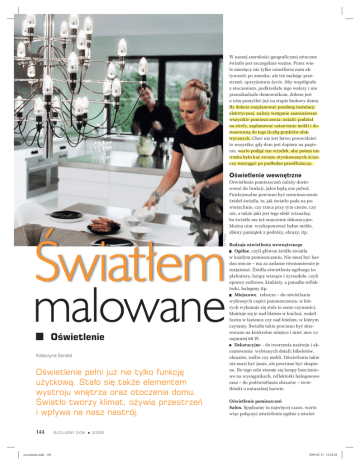 W naszej szerokoĂci geograficznej sztuczne Ăwiatïo jest szczególnie waĝne. Przez wiele miesiÚcy nie tylko umoĝliwia nam aktywnoĂÊ po zmroku, ale teĝ malujÈc przestrzeñ, uprzyjemnia ĝycie. Aby wspóïgraïo z otoczeniem, podkreĂlaïo jego walory i nie przeszkadzaïo domownikom, dobrze jest o nim pomyĂleÊ juĝ na etapie budowy domu. By dobrze rozplanowaÊ przebieg instalacji elektrycznej, naleĝy wstÚpnie zaaranĝowaÊ wszystkie pomieszczenia: ustaliÊ podziaï na strefy, zaplanowaÊ ustawienie mebli i dostosowanÈ do tego liczbÚ punktów elektrycznych. ChoÊ nie jest ïatwo przewidzieÊ to wszystko, gdy dom jest dopiero na papierze, warto podjÈÊ ten wysiïek, aby potem nie trzeba byïo kuÊ Ăwieĝo otynkowanych Ăcian czy rozciÈgaÊ po podïodze przedïuĝaczy. fot. Philips OĂwietlenie wewnÚtrzne ¥wiatïem malowane OĂwietlenie Katarzyna Sendal OĂwietlenie peïni juĝ nie tylko funkcjÚ uĝytkowÈ. Staïo siÚ takĝe elementem wystroju wnÚtrza oraz otoczenia domu. ¥wiatïo tworzy klimat, oĝywia przestrzeñ i wpïywa na nasz nastrój. 144 oswietlenie.indd 144 BUDUJEMY DOM OĂwietlenie pomieszczeñ naleĝy dostosowaÊ do funkcji, jakie bÚdÈ one peïniÊ. Funkcjonalne powinno byÊ rozmieszczenie ěródeï Ăwiatïa, to, jak Ăwiatïo pada na powierzchnie, czy rzuca przy tym cienie, czy nie, a takĝe jaki jest tego efekt wizualny, bo Ăwiatïo ma teĝ znaczenie dekoracyjne. Moĝna nim wyeksponowaÊ ïadne meble, zbiory pamiÈtek z podróĝy, obrazy, itp. Rodzaje oĂwietlenia wewnÚtrznego Ogólne, czyli gïówne ěródïo Ăwiatïa w kaĝdym pomieszczeniu. Nie musi byÊ ba bardzo mocne – ma za zadanie równomiernie je to rozjaĂniaÊ. ½ródïa oĂwietlenia ogólnego to: plafoniery, lampy wiszÈce i ĝyrandole, czy czyli oprawy sufitowe, kinkiety, a ponadto reflek reflektorki, halogeny itp. Miejscowe, robocze – do oĂwietlania wybranych czÚĂci pomieszczenia, w których wykonuje siÚ stale te same czynnoĂci czynnoĂci. Montuje siÚ je nad blatem w kuchni, wokóï lustra w ïazience czy nad fotelem, w którym czytamy. ¥wiatïo takie powinno byÊ skierowane na konkretne miejsce i mieÊ moc co najmniej 60 W. Dekoracyjne – do tworzenia nastroju i akcentowania wybranych detali: bibelotów, obrazów, roĂlin czy mebli. OĂwietlenie takie nie musi byÊ jasne, ale powinno byÊ skupione. Do tego celu stosuje siÚ lampy bezcieniowe na wysiÚgnikach, reflektorki halogenowe oraz – do podĂwietlania obrazów – Ăwietlówki o naturalnej barwie. OĂwietlenie pomieszczeñ Salon. SpÚdzamy tu najwiÚcej czasu, warto wiÚc poïÈczyÊ oĂwietlenie ogólne z oĂwiet- 3/2009 2009-02-13 14:28:04 fot. Philips fot. Aurora Technika ¥wietlna Przykïad oĂwietlenia dekoracyjnego wykorzystywanego do akcentowania wybranych detali – obrazów, zdjÚÊ lekko ĝóïta. Najkorzystniejsze oĂwietlenie zapewnia lampa zawieszona na wysokoĂci 60–70 cm nad blatem – z ĝarówkÈ 60–75 W lub ĂwietlówkÈ 15 W. JeĂli stóï jest dïugi, zamiast jednej lampy z duĝym kloszem moĝna powiesiÊ dwie mniejsze. Sypialnia. Powinna byÊ miejscem nastrojowym i zachÚcajÈcym do odpoczynku, do czego przyczynia siÚ teĝ oĂwietlenie. Zalecane jest Ăwiatïo o delikatnym i ciepïym odcieniu, nieodpowiednie natomiast – ĝarówki o barwie niebieskozielonej czy o innej chïodnej barwie, gdyĝ wywoïujÈ wraĝenie zimna, mogÈ teĝ wprowadzaÊ w stan niepokoju. OĂwietlenie dekoracyjne. Najwaĝniejsze w sypialni, bo buduje nastrój sprzyjajÈcy wypoczynkowi. OĂwietlenie miejscowe. Przydatne, jeĂli lubimy czytaÊ w ïóĝku. Wtedy najwygodniej bÚdzie umieĂciÊ ěródïa Ăwiatïa tuĝ przy nim. LampkÚ stojÈcÈ naleĝy postawiÊ na szafce nocnej, obok ïóĝka, w odlegïoĂci nie mniejszej niĝ 50 cm. ½ródïa Ăwiatïa mocowane na Ăcianie nad ïóĝkiem naleĝy zamontowaÊ nie niĝej niĝ 75 cm od pïaszczyzny materaca. Do doĂwietlenia strefy czytania sprawdzajÈ siÚ lampki z regulowanym kierunkiem i wysokoĂciÈ Ăwiecenia. JeĂli stóï jest dïugi, zamiast jedne duĝej lampy moĝna powiesiÊ dwie mniejsze fot. Krulen leniem miejscowym, by najlepiej sïuĝyïo róĝnym funkcjom, w salonie bowiem przyjmujemy goĂci, odpoczywamy, oglÈdamy telewizjÚ, czytamy. ¥wiatïo powinno byÊ rozproszone, a jego barwa – wspóïgraÊ z kolorem Ăcian. Do wyboru mamy kilka rodzajów oĂwietlenia: Kinkiety. NiezbÚdne w kaĝdym salonie. PamiÚtajmy jednak, by nie wieszaÊ ich bezpoĂrednio nad kanapÈ czy fotelami, poniewaĝ oĂwietlaïyby gïowy siedzÈcych na nich osób. Do kinkietów, zamiast tradycyjnych wïÈczników, dobrze jest zamontowaÊ Ăciemniacze, które regulujÈ natÚĝenie Ăwiatïa. Lampa stojÈca. Najlepiej ustawiÊ jÈ koïo fotela. Najwygodniejsze sÈ takie lampy, które majÈ dwa ěródïa Ăwiatïa: jedno skierowane w dóï – odpowiednie do czytania, i drugie skierowane na sufit. Lampka za telewizorem. Naleĝy ustawiÊ jÈ za odbiornikiem. Moĝe to byÊ np. lampa stojÈca. Jej Ăwiatïo powinno byÊ skierowane na ĂcianÚ za telewizorem, aby rozpraszaïo mrok – oglÈdanie telewizji bÚdzie wtedy mniej mÚczÈce dla naszych oczu. Kuchnia. Podobnie jak w salonie, najlepiej tu poïÈczyÊ oĂwietlenie ogólne z miejscowym. OĂwietlenie ciÈgu roboczego. To najwaĝniejsze oĂwietlenie w kuchni, potrzebne podczas wykonywania codziennych czynnoĂci zwiÈzanych z przygotowywaniem posiïków: punkty Ăwietlne naleĝy zamontowaÊ nad caïÈ dïugoĂciÈ blatu roboczego. Sprawdza siÚ tu oĂwietlenie umieszczone pod szafkami wiszÈcymi (np. oczka halogenowe) albo zainstalowane nad meblami lampki halogenowe na wysiÚgnikach. Moc takiego oĂwietlenia nie musi byÊ duĝa. W zupeïnoĂci wystarczÈ: ĝarówki 35–40 W lub Ăwietlówki kompaktowe 5–10 W. OĂwietlenie stoïu. ¥wiatïo nie moĝe raziÊ siedzÈcych przy nim osób, a wiÚc ĂwieciÊ im w oczy, ale powinno dobrze oĂwietlaÊ blat. Nie moĝe zmieniaÊ barw potraw, dlatego barwa Ăwiatïa powinna byÊ jasna, ciepïa, 