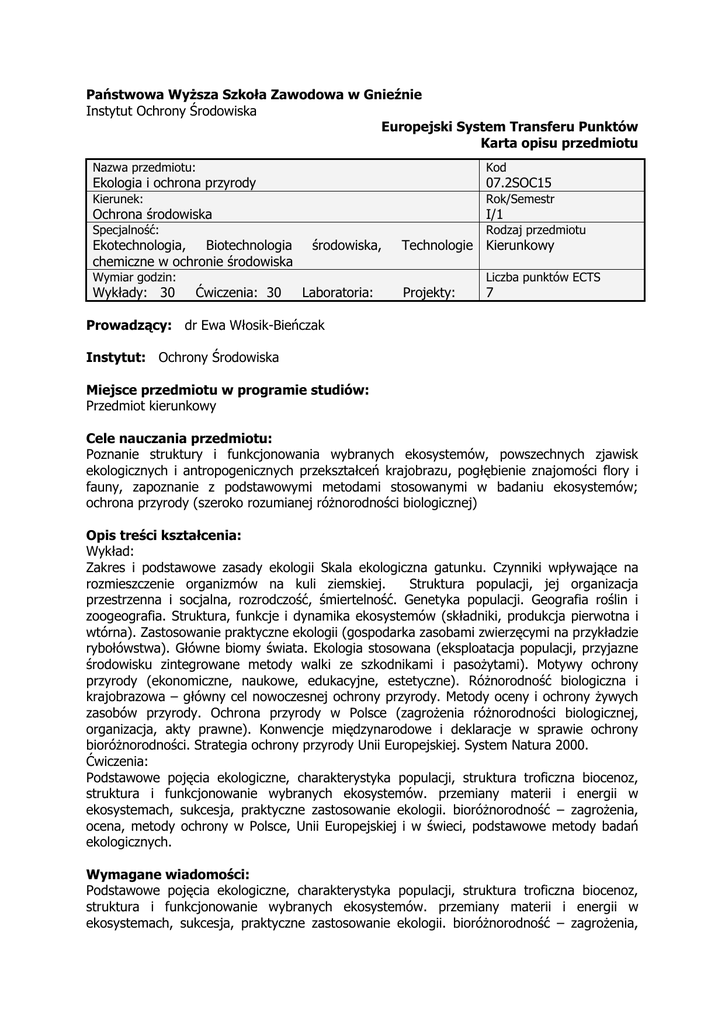 Państwowa Wyższa Szkoła Zawodowa w Gnieźnie Instytut Ochrony Środowiska Europejski System Transferu Punktów Karta opisu przedmiotu Nazwa przedmiotu: Kod Kierunek: Rok/Semestr Ekologia i ochrona przyrody 07.2SOC15 Ochrona środowiska Specjalność: Ekotechnologia, Biotechnologia chemiczne w ochronie środowiska Wymiar godzin: Wykłady: 30 Ćwiczenia: 30 I/1 środowiska, Laboratoria: Rodzaj przedmiotu Technologie Kierunkowy Projekty: Liczba punktów ECTS 7 Prowadzący: dr Ewa Włosik-Bieńczak Instytut: Ochrony Środowiska Miejsce przedmiotu w programie studiów: Przedmiot kierunkowy Cele nauczania przedmiotu: Poznanie struktury i funkcjonowania wybranych ekosystemów, powszechnych zjawisk ekologicznych i antropogenicznych przekształceń krajobrazu, pogłębienie znajomości flory i fauny, zapoznanie z podstawowymi metodami stosowanymi w badaniu ekosystemów; ochrona przyrody (szeroko rozumianej różnorodności biologicznej) Opis treści kształcenia: Wykład: Zakres i podstawowe zasady ekologii Skala ekologiczna gatunku. Czynniki wpływające na rozmieszczenie organizmów na kuli ziemskiej. Struktura populacji, jej organizacja przestrzenna i socjalna, rozrodczość, śmiertelność. Genetyka populacji. Geografia roślin i zoogeografia. Struktura, funkcje i dynamika ekosystemów (składniki, produkcja pierwotna i wtórna). Zastosowanie praktyczne ekologii (gospodarka zasobami zwierzęcymi na przykładzie rybołówstwa). Główne biomy świata. Ekologia stosowana (eksploatacja populacji, przyjazne środowisku zintegrowane metody walki ze szkodnikami i pasożytami). Motywy ochrony przyrody (ekonomiczne, naukowe, edukacyjne, estetyczne). Różnorodność biologiczna i krajobrazowa – główny cel nowoczesnej ochrony przyrody. Metody oceny i ochrony żywych zasobów przyrody. Ochrona przyrody w Polsce (zagrożenia różnorodności biologicznej, organizacja, akty prawne). Konwencje międzynarodowe i deklaracje w sprawie ochrony bioróżnorodności. Strategia ochrony przyrody Unii Europejskiej. System Natura 2000. Ćwiczenia: Podstawowe pojęcia ekologiczne, charakterystyka populacji, struktura troficzna biocenoz, struktura i funkcjonowanie wybranych ekosystemów. przemiany materii i energii w ekosystemach, sukcesja, praktyczne zastosowanie ekologii. bioróżnorodność – zagrożenia, ocena, metody ochrony w Polsce, Unii Europejskiej i w świeci, podstawowe metody badań ekologicznych. Wymagane wiadomości: Podstawowe pojęcia ekologiczne, charakterystyka populacji, struktura troficzna biocenoz, struktura i funkcjonowanie wybranych ekosystemów. przemiany materii i energii w ekosystemach, sukcesja, praktyczne zastosowanie ekologii. bioróżnorodność – zagrożenia, ocena, metody ochrony w Polsce, Unii Europejskiej i w świecie, podstawowe metody badań ekologicznych. Forma prowadzonych zajęć: Wykład, ćwiczenia Język wykładowy: Język polski Metody oceny: Zaliczenie na podstawie trzech prac kontrolnych i aktywnego udziału w zajęciach Bibliografia: Podstawowa: 1. Mackenzie A., Ball A. S., Virdee S. R. 2005: Ekologia. Krótkie wykłady. PWN, Warszawa. 2. Stawicka J., Szymczak-Piątek M., Wieczorek J., 2004: Wybrane zagadnienia ekologiczne.SGGW, Warszawa. Uzupełniająca: 1. Begon M., Mortimer M., 1989. Ekologia populacji. PWRiL, Warszawa 2. Andrzejewski R., Falińska K., (red.) 1986: Populacje roślin i zwierząt. Ekologiczne studium porównawcze. PWN, Warszawa. 3. Falińska K., 2004: Ekologia roślin. PWN, Warszawa.