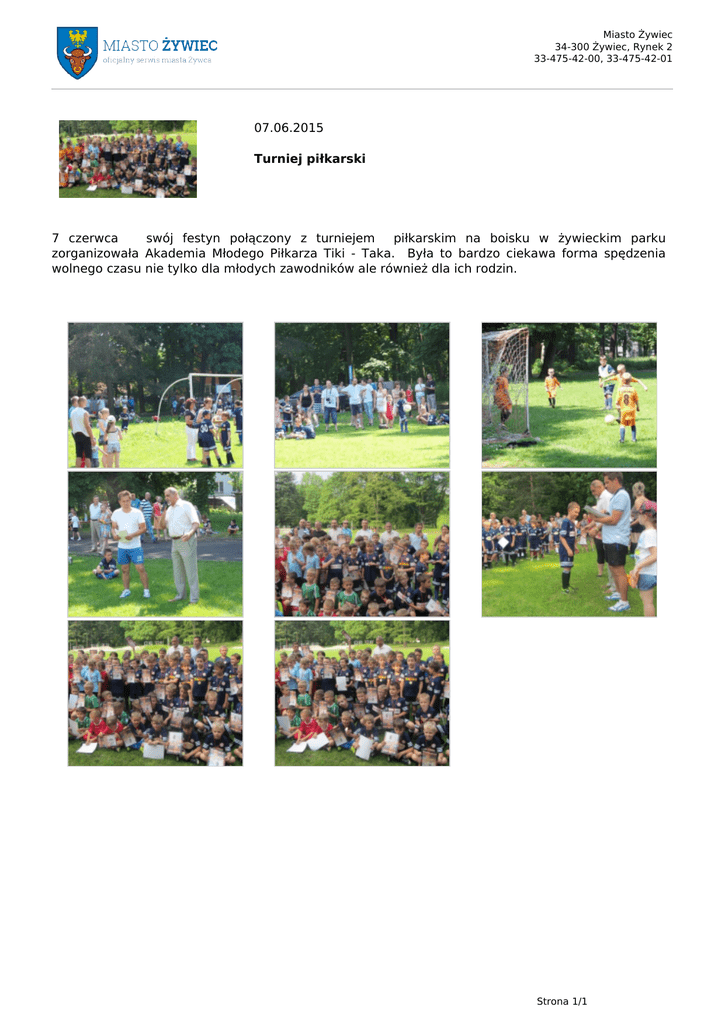 Miasto Żywiec 34-300 Żywiec, Rynek 2 33-475-42-00, 33-475-42-01 07.06.2015 Turniej piłkarski 7 czerwca swój festyn połączony z turniejem piłkarskim na boisku w żywieckim parku zorganizowała Akademia Młodego Piłkarza Tiki - Taka. Była to bardzo ciekawa forma spędzenia wolnego czasu nie tylko dla młodych zawodników ale również dla ich rodzin. Strona 1/1 Powered by TCPDF (www.tcpdf.org)