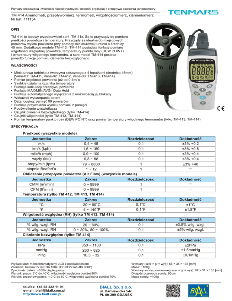 Pomiary środowiska i wielkości nieelektrycznych / mierniki prędkości / przepływu powietrza (anemometry) TM 414 Anemometr, przepływomierz, termometr, wilgotnościomierz, ciśnieniomierz Nr kat: 111154 OPIS TM 414 to topowy przedstawiciel serii TM-41x. Są to przyrządy do pomiaru prędkości powietrza i temperatury. Przyrządy są idealne do miejscowych pomiarów wylotu powietrza przy pomocy miniaturowej turbinki o średnicy 45 mm. Dodatkowo modele TM-413 i TM-414 posiadają funkcję pomiaru wilgotności względnej powietrza, temperatury punktu rosy (DEW POINT) i temperatury wilgotnego termometru, a sam model TM-414 posiada ponadto funkcję pomiaru ciśnienia bezwzględnego WŁAŚCIWOŚCI • Miniaturowa turbinka z tworzywa sztucznego z 4 łopatkami (średnica 45mm) (Vane-01: TM-411, Vane-02: TM-412, Vane-03: TM-413, TM-414) • Pomiar prędkości powietrza już od 0,4m/ s • Szybkie działania czujnika temperatury • Funkcja kalkulacji przepływu powietrza • Funkcje MAX/MIN/AVG i Data Hold • Funkcja automatycznego wyłączenia z możliwością jej blokady • Wskaźnik wyczerpania baterii • Data logging: pamięć 99 pomiarów • Funkcja przywołania wyniku pomiaru z pamięci • Podświetlenie wyświetlacza • Czujnik ciśnienia bezwzględnego (tylko TM-414) • Czujnik wilgotności (tylko TM-413, TM-414) • Pomiar temperatury punktu rosy (DEW POINT) oraz pomiar temperatury wilgotnego termometru (tylko TM-413, TM-414) SPECYFIKACJA Prędkość (wszystkie modele) Jednostka Zakres Rozdzielczość 0,4 ~ 45 0,1 m/s km/k (kph) 1,5 ~ 160 0,1 mile/h (mph) 0,9 ~ 100 0,1 węzły (kts) 0,8 ~ 88 0,1 stopy/min (fpm) 79 ~ 8800 1 stopnie Beafort’a 1 ~ 12 1 Obliczanie przepływu powietrza (Air Flow) (wszystkie modele) Dokładność ±3% +0,2 ±3% +0,8 ±3% +0,4 ±3% +0,4 ±3% +40 --- Jednostka Zakres CMM [m3/min] 0 ~ 9999 CFM [ft3/min] 0 ~ 9999 Temperatura (tylko TM 412, TM 413, TM 414) Rozdzielczość 1 1 Dokładność ----- Jednostka Zakres °C -20 ~ 60°C -4 ~ 140°F °F Wilgotność względna (RH) (tylko TM 413, TM 414) Rozdzielczość 0,1°C 0,1°F Dokładność ±1°C ±1,8°F Jednostka Zakres % wilg. wzgl. RH 20 ~ 80% % wilg. wzgl. RH 0 ~ 20%, 80 ~ 100% Ciśnienie bezwględne (tylko TM 414) Rozdzielczość 0,1 0,1 Dokładność ±3,5% wilg. wzgl. ±5% wilg. wzgl. Rozdzielczość 0,1 0,1 0,1 Dokładność ±2hPa ±1,5mmHg ±0,1inHg Jednostka hPa mmHg inHg Zakres 350 ~ 1100 263 ~ 825 10,3 ~ 32 Wyświetlacz: monochromatyczny LCD z podświetleniem Zasilanie: bateria 9V (NEDA 1604, IEC 6F22 lub JIS 006P) Żywotnośc baterii: ~100h ciągłej pracy Warunki pracy: 5˚C do 40˚C, wilgotność względna poniżej 80% Warunki przechowywania: -10˚C do 60˚C, wilgotność względna poniżej 70% tel./fax: +48 58 322 11 91 e-mail: [email protected] http://www.biall.com.pl Wymiary (szer × gł × wys): 56 × 35 × 135 [mm] Masa: ~160g Wymiary sondy pomiarowej (szer × gł × wys): 67 × 31 × 135 [mm] Długość przewodu sondy: 95cm Masa sondy: ~100g BIALL Sp. z o.o. ul. Barniewicka 54c PL 80-299 GDAŃSK