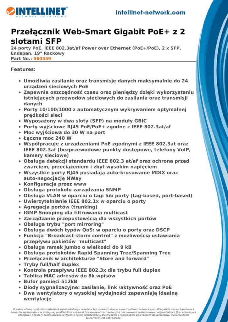 Przełącznik Web-Smart Gigabit PoE+ z 2 slotami SFP 24 porty PoE, IEEE 802.3at/af Power over Ethernet (PoE+/PoE), 2 x SFP, Endspan, 19" Rackowy Part No.: 560559 Features: Umożliwia zasilanie oraz transmisję danych maksymalnie do 24 urządzeń sieciowych PoE Zapewnia oszczędność czasu oraz pieniędzy dzięki wykorzystaniu istniejących przewodów sieciowych do zasilania oraz transmisji danych Porty 10/100/1000 z automatycznym wykrywaniem optymalnej prędkości sieci Wyposażony w dwa sloty (SFP) na moduły GBIC Porty wyjściowe RJ45 PoE/PoE+ zgodne z IEEE 802.3at/af Moc wyjściowa do 30 W na port Łączna moc 240 W Współpracuje z urządzeniami PoE zgodnymi z IEEE 802.3at oraz IEEE 802.3af (bezprzewodowe punkty dostępowe, telefony VoIP, kamery sieciowe) Obsługa detekcji standardu IEEE 802.3 at/af oraz ochrona przed zwarciem, przeciążeniem i zbyt wysokim napięciem Wszystkie porty RJ45 posiadają auto-krosowanie MDIX oraz auto-negocjację NWay Konfiguracja przez www Obsługa protokołu zarządzania SNMP Obsługa VLAN w oparciu o tagi lub porty (tag-based, port-based) Uwierzytelnianie IEEE 802.1x w oparciu o porty Agregacja portów (trunking) IGMP Snooping dla filtrowania multicast Zarządzanie przepustowścią dla wszystkich portów Obsługa trybu "port mirroring" Obsługa dwóch typów QoS: w oparciu o porty oraz DSCP Funkcja "Broadcast storm control" z możliwością ustawiania przepływu pakietów "multicast" Obsługa ramek jumbo o wielkości do 9 kB Obsługa protokołów Rapid Spanning Tree/Spanning Tree Przełącznik w architekturze "Store and forward" Tryby full/half duplex Kontrola przepływu IEEE 802.3x dla trybu full duplex Tablica MAC adresów do 8k wpisów Bufor pamięci 512kB Diody sygnalizacyjne: zasilanie, link /aktywność oraz PoE Dwa wentylatory o wysokiej wydajności zapewniają idealną wentylację O pełną ofertę produktów Intellinet pytaj lokalnego resellera lub odwiedź stronę www.intellinet-network.com. Wszystkie nazwy handlowe i towarów występujące w niniejszej publikacji są znakami towarowymi zastrzeżonymi lub nazwami zastrzeżonymi odpowiednich firm odnośnych właścicieli i zostały zamieszczone wyłącznie celem identyfikacji. Dystrybucja i reprodukcja powyższych dokumentów, wykorzystanie zawartości jest zabronione. Uchwyty rackowe w standardzie 19" Gwarancja 3 lata Specyfikacja: Standardy: • IEEE 802.1d (Protokół Spanning Tree) • IEEE 802.1p (Traffic Prioritization) • IEEE 802.1q (VLAN Tagging) • IEEE 802.1w (Protokół Rapid Spanning Tree) • IEEE 802.3ad (Link Aggregation) • IEEE 802.3 (10Base-T Ethernet) • IEEE 802.3ab (Skrętka Gigabit Ethernet) • IEEE 802.3ad (Protokół Link Aggregation Control LACP) • IEEE 802.3af (Power over Ethernet 802.3at Typu 1) • IEEE 802.3at (Power over Ethernet 802.3at Typu 2) • IEEE 802.3u (100Base-TX Fast Ethernet) • IEEE 802.3x (kontrola przepływu dla trybu full duplex) Specyfikacja: • Obsługiwane media transmisyjne: - 10Base-T Cat3, 4, 5 UTP/STP RJ45 - 100Base-TX Cat5 UTP/STP RJ45 - 1000Base-T Cat5e UTP/STP RJ-45 • Prędkość przesyłania/filtrowania pakietów: - 1,488,000 p/s (1000 Mb/s) - 148,800 p/s (100 Mb/s) - 14,880 p/s (10 Mb/s) • Tablica adresów MAC: 8k • Prędkość magistrali: 52 Gb/s • Architektura przełączania: store and forward • Konfiguracja: - Przepustowość portu: 10 Mb/s, 100 Mb/s, 1000 Mb/s lub auto-negocjacja - PoE włączone/wyłączone dla poszczególnego portu - Kontrola przepływu włączona/wyłączona dla poszczególnego portu - VLAN - Ograniczanie szybkości (prędkość wyjściowa oraz prędkość wejściowa) - Port Mirroring - Agregacja portów/LACP: 8 grup - Konfiguracja Broadcast Storm - IGMP Snooping - Quality of Service (QoS): w oparciu o porty lub DSCP - Zintegrowane narzędzie diagnostyczne kabla VeriPHY - Zintegrowany klient Ping ICMP wysyłający żądania PING do innych węzłów sieciowych O pełną ofertę produktów Intellinet pytaj lokalnego resellera lub odwiedź stronę www.intellinet-network.com. Wszystkie nazwy handlowe i towarów występujące w niniejszej publikacji są znakami towarowymi zastrzeżonymi lub nazwami zastrzeżonymi odpowiednich firm odnośnych właścicieli i zostały zamieszczone wyłącznie celem identyfikacji. Dystrybucja i reprodukcja powyższych dokumentów, wykorzystanie zawartości jest zabronione. - SNMPv1/v2c (Simple Network Management Protocol) - Ustawienia sieci LAN (Adres IP, Brama, ect.) • Certyfikaty: FCC Class A, CE Mark Diody sygnalizacyjne: • PoE • Zasilanie: • Link / Aktywność Zasilanie: • Wejście: 90 – 260 V AC, 50 – 60 Hz • Pobór mocy: 260 W (maksymalny) Parametry fizyczne: • Metalowa obudowa • Wymiary: 440 (W) x 208 (L) x 44 (H) mm • Waga: 3,1 kg • Temperatura pracy: 0 - 40˚C • Wilgotność pracy: 10 – 90% RH, bez kondensacji • Temperatura przechowywania: -20 – 70°C Zawartość opakowania: • Przełącznik 24-Portowy Web-Smart Gigabit PoE+ z 2 slotami SFP • Kabel zasilający • Instrukcja użytkownika O pełną ofertę produktów Intellinet pytaj lokalnego resellera lub odwiedź stronę www.intellinet-network.com. Wszystkie nazwy handlowe i towarów występujące w niniejszej publikacji są znakami towarowymi zastrzeżonymi lub nazwami zastrzeżonymi odpowiednich firm odnośnych właścicieli i zostały zamieszczone wyłącznie celem identyfikacji. Dystrybucja i reprodukcja powyższych dokumentów, wykorzystanie zawartości jest zabronione. O pełną ofertę produktów Intellinet pytaj lokalnego resellera lub odwiedź stronę www.intellinet-network.com. Wszystkie nazwy handlowe i towarów występujące w niniejszej publikacji są znakami towarowymi zastrzeżonymi lub nazwami zastrzeżonymi odpowiednich firm odnośnych właścicieli i zostały zamieszczone wyłącznie celem identyfikacji. Dystrybucja i reprodukcja powyższych dokumentów, wykorzystanie zawartości jest zabronione.