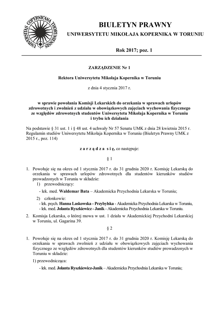 BIULETYN PRAWNY UNIWERSYTETU MIKOŁAJA KOPERNIKA W TORUNIU Rok 2017; poz. 1 ZARZĄDZENIE Nr 1 Rektora Uniwersytetu Mikołaja Kopernika w Toruniu z dnia 4 stycznia 2017 r. w sprawie powołania Komisji Lekarskich do orzekania w sprawach urlopów zdrowotnych i zwolnień z udziału w obowiązkowych zajęciach wychowania fizycznego ze względów zdrowotnych studentów Uniwersytetu Mikołaja Kopernika w Toruniu i trybu ich działania Na podstawie § 31 ust. 1 i § 48 ust. 4 uchwały Nr 57 Senatu UMK z dnia 28 kwietnia 2015 r. Regulamin studiów Uniwersytetu Mikołaja Kopernika w Toruniu (Biuletyn Prawny UMK z 2015 r., poz. 114) z a r z ą d z a s i ę, co następuje: §1 1. Powołuje się na okres od 1 stycznia 2017 r. do 31 grudnia 2020 r. Komisję Lekarską do orzekania w sprawach urlopów zdrowotnych dla studentów kierunków studiów prowadzonych w Toruniu w składzie: 1) przewodniczący: - lek. med. Waldemar Bata – Akademicka Przychodnia Lekarska w Toruniu; 2) członkowie: - lek. psych. Hanna Laskowska - Przybylska - Akademicka Przychodnia Lekarska w Toruniu, - lek. med. Jolanta Ryszkiewicz - Janik - Akademicka Przychodnia Lekarska w Toruniu. 2. Komisja Lekarska, o której mowa w ust. 1 działa w Akademickiej Przychodni Lekarskiej w Toruniu, ul. Gagarina 39. §2 1. Powołuje się na okres od 1 stycznia 2017 r. do 31 grudnia 2020 r. Komisję Lekarską do orzekania w sprawach zwolnień z udziału w obowiązkowych zajęciach wychowania fizycznego ze względów zdrowotnych dla studentów kierunków studiów prowadzonych w Toruniu w składzie: 1) przewodnicząca: - lek. med. Jolanta Ryszkiewicz-Janik – Akademicka Przychodnia Lekarska w Toruniu; 2) członkowie: - mgr Michał Tyburski, - mgr Anna Wiak. 2. Komisja Lekarska, o której mowa w ust. 1 działa w Akademickiej Przychodni Lekarskiej, ul. Gagarina 39. 3. Student ubiegający się o zwolnienie lekarskie z udziału w obowiązkowych zajęciach wychowania fizycznego zobowiązany jest do rejestracji internetowej na stronie http://www.ucs.umk.pl/rejestracja. §3 1. Powołuje się na okres od 1 stycznia 2017 r. do 31 grudnia 2020 r. Komisję Lekarską do orzekania w sprawach urlopów zdrowotnych i zwolnień z udziału w obowiązkowych zajęciach wychowania fizycznego ze względów zdrowotnych dla studentów kierunków studiów prowadzonych w Collegium Medicum w Bydgoszczy w składzie: 1) przewodniczący: - dr n. med. Krzysztof Buczkowski – Katedra i Zakład Lekarza Rodzinnego; 2) zastępca przewodniczącego: - dr n. med. Rafał Donderski – Klinika Nefrologii, Nadciśnienia Tętniczego i Chorób Wewnętrznych w Katedrze Nefrologii, Nadciśnienia Tętniczego i Chorób Wewnętrznych; 3) członkowie: - dr n. med. Maciej Bieliński – Zakład Neuropsychologii Klinicznej w Katedrze Neuropsychologii Klinicznej, - dr n. med. Agnieszka Łukaszewska-Smyk – Katedra i Klinika Chorób Oczu, - dr n. med. Magdalena Mackiewicz-Milewska – Katedra i Klinika Rehabilitacji, - dr n. med. Krzysztof Nicpoń – Klinika Neurologii, - dr n. med. Karolina Obońska – Klinika Kardiologii i Chorób Wewnętrznych w Katedrze Kardiologii i Chorób Wewnętrznych, - dr n. med. Krzysztof Szwed – Zakład Neuropsychologii Klinicznej w Katedrze Neuropsychologii Klinicznej, - dr n. med. Małgorzata Wierzchowska – Klinika Otolaryngologii i Onkologii Laryngologicznej w Katedrze Otolaryngologii i Onkologii Laryngologicznej, - lek. Tacjana Barczyńska – Klinika Reumatologii i Układowych Chorób Tkanki Łącznej, - lek. Karolina Borowska-Maćkowiak – Klinika Położnictwa, Chorób Kobiecych i Ginekologii Onkologicznej w Katedrze Położnictwa, Chorób Kobiecych i Ginekologii Onkologicznej, - lek. Michał Danek – I Klinika Psychiatrii w Katedrze Psychiatrii, - lek. Przemysław Grudzka – I Klinika Psychiatrii w Katedrze Psychiatrii, - lek. Sebastian Grzyb – Klinika Neurochirurgii, Neurotraumatologii i Neurochirurgii Dziecięcej, - lek. Sebastian Kaszewski – Pracownia Biologii Molekularnej Skóry, Immunodermatologii i Dermatopatologii w Katedrze Dermatologii, Chorób Przenoszonych Drogą Płciową i Immunodermatologii, - lek. Katarzyna Klucz – Katedra i Zakład Lekarza Rodzinnego, 2 - lek. Marcin Maciejewski – Oddział Kliniczny Ortopedii i Traumatologii Narządu Ruchu, - lek. Jakub Ohla – Oddział Kliniczny Ortopedii i Traumatologii Narządu Ruchu, - lek. Robert Princ – Klinika Neurologii, - lek. Małgorzata Szafrańska – Klinika Endokrynologii i Diabetologii w Katedrze Endokrynologii i Diabetologii, - lek. Małgorzata Węgierska – Klinika Reumatologii i Układowych Chorób Tkanki Łącznej”. 2. Komisja Lekarska, o której mowa w ust. 1, działa w Szpitalu Uniwersyteckim nr 1 im. dr. Antoniego Jurasza w Bydgoszczy przy ul. M. Curie Skłodowskiej 9. 3. Komisja Lekarska, o której mowa w ust. 1, orzeka w składzie trzyosobowym wyznaczonym przez przewodniczącego Komisji lub zastępcę przewodniczącego Komisji. §4 1. Student ubiegający się o urlop zdrowotny składa umotywowany wniosek do właściwego dziekana. 2. Wniosek, o którym mowa w ust. 1 powinien być złożony bezpośrednio po zaistnieniu przyczyn zdrowotnych lub wystąpieniu okoliczności uzasadniających ubieganie się o udzielenie urlopu zdrowotnego. 3. Dziekan po otrzymaniu umotywowanego wniosku studenta bezzwłocznie przekazuje go właściwej Komisji Lekarskiej. §5 1. Komisja Lekarska rozpatruje wniosek, o którym mowa w § 4 ust. 1, na posiedzeniu wyznaczonym w terminie 14 dni od dnia otrzymania od dziekana przedmiotowego wniosku. 2. Student zobowiązany jest do osobistego stawienia się przed Komisją Lekarską w terminie wskazanym przez przewodniczącego Komisji lub zastępcę przewodniczącego Komisji. Z obowiązku osobistego stawienia się przed Komisją zwolnieni są studenci przebywający na leczeniu w zamkniętych zakładach opieki zdrowotnej. 3. W przypadku stwierdzenia przez Komisję Lekarską konieczności przeprowadzenia dodatkowych konsultacji medycznych student, po u