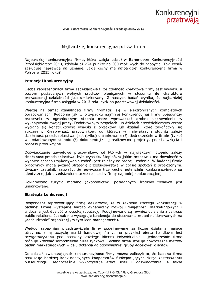 Wyniki Barometru Konkurencyjności Przedsiębiorstw 2013 Najbardziej konkurencyjna polska firma Najbardziej konkurencyjna firma, która wzięła udział w Barometrze Konkurencyjności Przedsiębiorstw 2013, zdobyła aż 274 punkty na 300 możliwych do zdobycia. Taki wynik zasługuje naprawdę na uznanie. Jakie cechy ma najbardziej konkurencyjna firma w Polsce w 2013 roku? Potencjał konkurencyjny Osoba reprezentująca firmę zadeklarowała, że zdolność kredytowa firmy jest wysoka, a poziom posiadanych wolnych środków pieniężnych w stosunku do charakteru prowadzonej działalności jest umiarkowany. Z naszych badań wynika, że najbardziej konkurencyjna firma osiągała w 2013 roku zysk na podstawowej działalności. Wiedzę na temat działalności firmy gromadzi się w elektronicznych kompletnych opracowaniach. Podobnie jak w przypadku najmniej konkurencyjnej firmy pojedynczy pracownik w ograniczonym stopniu może wprowadzać drobne usprawnienia w wykonywaniu swojej pracy. Dodatkowo, w zespołach lub działach przedsiębiorstwa często wyciąga się konstruktywne wnioski z projektów lub działań, które zakończyły się sukcesem. Kreatywność pracowników, od których w największym stopniu zależy działalność przedsiębiorstwa, jest (tylko) umiarkowana (!). Jednocześnie w firmie (tylko) w umiarkowanym stopniu (!) dokumentuje się realizowane projekty, przedsięwzięcia i procesy produkcyjne. Doświadczenie zawodowe pracowników, od których w największym stopniu zależy działalność przedsiębiorstwa, było wysokie. Stopień, w jakim pracownik ma dowolność w wyborze sposobu wykonywania zadań, jest zależny od rodzaju zadania. W badanej firmie pracownicy mogą poznać strategię przedsiębiorstwa w czasie spotkań z przełożonymi. Uważny czytelnik zauważy, że powyższe trzy cechy potencjału konkurencyjnego są identyczne, jak przedstawione przez nas cechy firmy najmniej konkurencyjnej. Deklarowane zużycie umiarkowane. moralne (ekonomiczne) posiadanych środków trwałych jest Strategia konkurencji Respondent reprezentujący firmę deklarował, że w zakresie strategii konkurencji w badanej firmie występuje bardzo dynamiczny rozwój umiejętności marketingowych i widoczna jest dbałość o wysoką reputację. Podejmowane są również działania z zakresu public relations. Jednak nie występuje tendencja do stosowania metod nakierowanych na „odchudzanie” organizacji, w tym lean managementu. Według zapewnień przedstawiciela firmy podejmowane są liczne działania mające utrzymać silną pozycję marki handlowej firmy, na przykład oferta handlowa jest przygotowywana pod potrzeby każdego klienta indywidualnie i jednocześnie firma próbuje kreować samodzielnie nisze rynkowe. Badana firma stosuje nowoczesne metody badań marketingowych w celu dotarcia do odpowiedniej grupy docelowej klientów. Do działań zwiększających konkurencyjność firmy można zaliczyć to, że badana firma poszukuje bardziej konkurencyjnych kooperantów funkcjonujących dzięki zastosowaniu outsourcingu. Jednocześnie wykorzystuje efekt skali i doświadczenia, a także Wszelkie prawa zastrzeżone. Copyright © Olaf Flak, Grzegorz Głód www.konkurencyjniprzetrwaja.pl Wyniki Barometru Konkurencyjności Przedsiębiorstw 2013 benchmarking nakierowany świadczonych usług. na szukanie źródeł obniżki kosztów produkcji lub Przewaga konkurencyjna Głównym celem stosowanej obecnie przez firmę strategii cenowej dla wszystkich produktów lub usług łącznie jest maksymalizacja udziałów w sektorze lub segmencie rynku. Jednocześnie nabywca produktów firmy często może negocjować ceny tych produktów. System dystrybucji zapewnia terminowość dostaw produktów na dość wysokim poziomie. Czasami klient może testować produkty przed zakupem. Wszystkie produkty firmy są objęte gwarancją (np. darmowy serwis, wymiana lub naprawa) i spełniają w dość wysokim stopniu ogólnie przyjęte kryterium bycia proekologicznym. W firmie często przed wprowadzeniem produktu planuje się ich czas życia, od 51 do 75 procent klientów jest objętych programem lojalnościowym. Podsumowanie Z badania wynika, że firma ma silne podstawy, aby być naprawdę konkurencyjną. Mimo, że w potencjale konkurencyjnym można zauważyć pewne mankamenty, firma świadomie i konsekwentnie kształtuje swoją strategię konkurencji. Wynikiem tego jest duża przewaga konkurencyjna. W sumie naprawdę świetny wynik! Z jakiej branży jest to firma? Dość wymagającej: usługi dla firm. Wszelkie prawa zastrzeżone. Copyright © Olaf Flak, Grzegorz Głód www.konkurencyjniprzetrwaja.pl