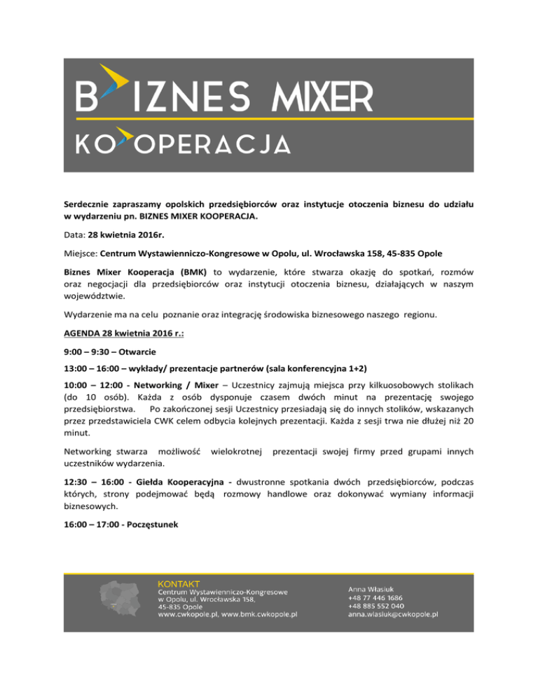 Serdecznie zapraszamy opolskich przedsiębiorców oraz instytucje otoczenia biznesu do udziału w wydarzeniu pn. BIZNES MIXER KOOPERACJA. Data: 28 kwietnia 2016r. Miejsce: Centrum Wystawienniczo-Kongresowe w Opolu, ul. Wrocławska 158, 45-835 Opole Biznes Mixer Kooperacja (BMK) to wydarzenie, które stwarza okazję do spotkań, rozmów oraz negocjacji dla przedsiębiorców oraz instytucji otoczenia biznesu, działających w naszym województwie. Wydarzenie ma na celu poznanie oraz integrację środowiska biznesowego naszego regionu. AGENDA 28 kwietnia 2016 r.: 9:00 – 9:30 – Otwarcie 13:00 – 16:00 – wykłady/ prezentacje partnerów (sala konferencyjna 1+2) 10:00 – 12:00 - Networking / Mixer – Uczestnicy zajmują miejsca przy kilkuosobowych stolikach (do 10 osób). Każda z osób dysponuje czasem dwóch minut na prezentację swojego przedsiębiorstwa. Po zakończonej sesji Uczestnicy przesiadają się do innych stolików, wskazanych przez przedstawiciela CWK celem odbycia kolejnych prezentacji. Każda z sesji trwa nie dłużej niż 20 minut. Networking stwarza możliwość uczestników wydarzenia. wielokrotnej prezentacji swojej firmy przed grupami innych 12:30 – 16:00 - Giełda Kooperacyjna - dwustronne spotkania dwóch przedsiębiorców, podczas których, strony podejmować będą rozmowy handlowe oraz dokonywać wymiany informacji biznesowych. 16:00 – 17:00 - Poczęstunek Wejście na Biznes Mixer Kooperacja to koszt tylko 100 zł! Dzięki uczestnictwu w niej mają Państwo możliwość spotkania się i porozmawiania z przedstawicielami firm oraz instytucji otoczenia biznesu, działającymi na terenie naszego województwa. WARUNKI UCZESTNICTWA w BIZNES MIXER KOOPERACJA PAKIET AKTYWNY - 100,00 PLN / 1 os. wpis do elektronicznej bazy kooperantów (imię, nazwisko, stanowisko, nazwa firmy, www, email, tel.) wstęp na Networking/ Mixer oraz giełdę kooperacyjną dostęp do platformy/giełdy kooperacyjnej umożliwiającej umawianie spotkań z innymi zarejestrowanymi uczestnikami otwarty dostęp do Internetu reklama na wieży LED przed budynkiem CWK do wykorzystania do końca roku 2016 na podstawie przedłożonego oświadczenia Wirtualne stoisko na stronie: etargi.cwkopole.pl wraz z dodatkową usługą reklamową na podstawie przedłożonego oświadczenia poczęstunek dla uczestników Zachęcamy również do pojawienia się na wydarzeniu jako WYSTAWCA! POWIERZCHNIA WYSTAWIENNICZA w BIZNES MIXER KOOPERACJA STOISKO MODUŁOWE Z WYPOSAŻENIEM - 6 m2 Cena: 1.500 PLN ZABUDOWA (3m szerokość x 2m głębokość) - ściany zabudowy w kolorze szarym - fryz z nazwą firmy (czcionka w kolorze granatowym) INSTALACJA ELEKTRYCZNA: - punkty świetlne – 2 szt. - przyłącze elektryczne do 3kW – 1 szt. WYPOSAŻENIE: - lada informacyjna (100x50x110cm) – 1 szt. - krzesło barowe (hoker) – 1 szt. - stolik (95x95x73 cm) - 2 krzesła - kosz na śmieci – 1 szt. Należność za powierzchnię wystawienniczą obejmuje: udostępnienie powierzchni na okres wydarzenia, montażu i demontażu stoiska kartę wstępu WYSTAWCA otwarty dostęp do Internetu możliwość rozpowszechniania materiałów promocyjnych w czasie trwania wydarzenia na terenach targowych sprzątanie dostępnych części stoisk i ciągów komunikacyjnych ochronę obiektu podstawowy wpis do katalogu papierowego (nazwa firmy, stopka adresowa) PRZYKŁADOWE ROZMIESZCZENIE STOISK BIZNES MIXER KOOPERACJA PAKIET PARTNERSKI Koszt netto* Oficjalny tytuł Partnera Maksymalna liczba pakietów PAKIET SPONSORSKI 5 000 PLN tak 5 Informacja o Partnerze na stronie www wydarzenia tak CD ze zdjęciami z wydarzenia tak Pakiety AKTYWNE do dyspozycji Partnera dla zaproszonych gości 5 pakietów Wyeksponowanie Partnera oraz jego materiałów reklamowych podczas Networkingu (roll-up) 1 Wykorzystanie sali konferencyjnej CWK o wymiarach 73 m2 na spotkanie biznesowe podczas Biznes Mixer Kooperacja w dniu 28.04.2016 r. nie dłuższe niż 2 godziny 1 Udostępnienie stoiska na potrzeby promocyjne Partnera z zabudową modułową wraz z wyposażeniem, bądź powierzchni niezabudowanej 12m2