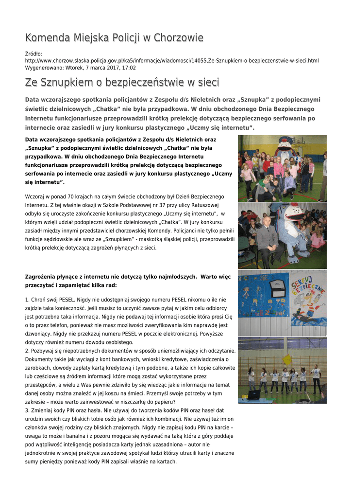 Komenda Miejska Policji w Chorzowie Źródło: http://www.chorzow.slaska.policja.gov.pl/ka5/informacje/wiadomosci/14055,Ze-Sznupkiem-o-bezpieczenstwie-w-sieci.html Wygenerowano: Wtorek, 7 marca 2017, 17:02 Ze Sznupkiem o bezpieczeństwie w sieci Data wczorajszego spotkania policjantów z Zespołu d/s Nieletnich oraz „Sznupka” z podopiecznymi świetlic dzielnicowych „Chatka” nie była przypadkowa. W dniu obchodzonego Dnia Bezpiecznego Internetu funkcjonariusze przeprowadzili krótką prelekcję dotyczącą bezpiecznego serfowania po internecie oraz zasiedli w jury konkursu plastycznego „Uczmy się internetu”. Data wczorajszego spotkania policjantów z Zespołu d/s Nieletnich oraz „Sznupka” z podopiecznymi świetlic dzielnicowych „Chatka” nie była przypadkowa. W dniu obchodzonego Dnia Bezpiecznego Internetu funkcjonariusze przeprowadzili krótką prelekcję dotyczącą bezpiecznego serfowania po internecie oraz zasiedli w jury konkursu plastycznego „Uczmy się internetu”. Wczoraj w ponad 70 krajach na całym świecie obchodzony był Dzień Bezpiecznego Internetu. Z tej właśnie okazji w Szkole Podstawowej nr 37 przy ulicy Ratuszowej odbyło się uroczyste zakończenie konkursu plastycznego „Uczmy się internetu”, w którym wzięli udział podopieczni świetlic dzielnicowych „Chatka”. W jury konkursu zasiadł między innymi przedstawiciel chorzowskiej Komendy. Policjanci nie tylko pełnili funkcje sędziowskie ale wraz ze „Sznupkiem” - maskotką śląskiej policji, przeprowadzili krótką prelekcję dotyczącą zagrożeń płynących z sieci. Zagrożenia płynące z internetu nie dotyczą tylko najmłodszych. Warto więc przeczytać i zapamiętać kilka rad: 1. Chroń swój PESEL. Nigdy nie udostępniaj swojego numeru PESEL nikomu o ile nie zajdzie taka konieczność. Jeśli musisz to uczynić zawsze pytaj w jakim celu odbiorcy jest potrzebna taka informacja. Nigdy nie podawaj tej informacji osobie która prosi Cię o to przez telefon, ponieważ nie masz możliwości zweryfikowania kim naprawdę jest dzwoniący. Nigdy nie przekazuj numeru PESEL w poczcie elektronicznej. Powyższe dotyczy również numeru dowodu osobistego. 2. Pozbywaj się niepotrzebnych dokumentów w sposób uniemożliwiający ich odczytanie. Dokumenty takie jak wyciągi z kont bankowych, wnioski kredytowe, zaświadczenia o zarobkach, dowody zapłaty kartą kredytową i tym podobne, a także ich kopie całkowite lub częściowe są źródłem informacji które mogą zostać wykorzystane przez przestępców, a wielu z Was pewnie zdziwiło by się wiedząc jakie informacje na temat danej osoby można znaleźć w jej koszu na śmieci. Przemyśl swoje potrzeby w tym zakresie – może warto zainwestować w niszczarkę do papieru? 3. Zmieniaj kody PIN oraz hasła. Nie używaj do tworzenia kodów PIN oraz haseł dat urodzin swoich czy bliskich tobie osób jak również ich kombinacji. Nie używaj też imion członków swojej rodziny czy bliskich znajomych. Nigdy nie zapisuj kodu PIN na karcie – uwaga to może i banalna i z pozoru mogąca się wydawać na taką która z góry poddaje pod wątpliwość inteligencję posiadacza karty jednak uzasadniona – autor nie jednokrotnie w swojej praktyce zawodowej spotykał ludzi którzy utracili karty i znaczne sumy pieniędzy ponieważ kody PIN zapisali właśnie na kartach. 4. Dokładnie sprawdzaj wyciągi z konta i kart kredytowych. Gdy znajdziesz coś niepokojącego, jakąkolwiek nieprawidłowość natychmiast poinformuj o tym stosowne służby bankowe. 5. Zgłaszaj natychmiast kradzież lub zagubienie istotnych dokumentów takich jak dowód osobisty, prawo jazdy, karty kredytowe czy bankomatowe. Takie zdarzenia należy zgłaszać na Policji oraz w odpowiedniej dokumentowi firmie (w wypadku kart kredytowych bankomatowych – w banku). Zachowanie takie nie zabezpieczy cię w 100% od razu przed wszystkimi możliwymi nieprzyjemnościami związanymi z ewentualnym przestępstwem jednak pozwoli skutecznie obronić się przed długofalowymi konsekwencjami. 6. Jeśli podejrzewasz, że padłeś ofiarą kradzieży tożsamości natychmiast zgłoś się na Policję i przedstaw wszystkie znane ci okoliczności związane z tą sprawą. 7. Zwracaj uwagę na bezpieczeństwo w miejscu pracy. Nie podawaj nikomu loginów i haseł do komputerów, programów i tym podobnych. One jednoznacznie Cię identyfikują – jeśli ktoś w sposób przestępczy wykorzysta hasło które mu podałeś, możesz mieć znaczne nieprzyjemności. Gdy opuszczasz stanowisko pracy na dłużej pamiętaj aby się wylogować. Nie zapamiętuj też haseł w przeglądarkach internetowych. Nie zapisuj ich też w łatwo dostępnych miejscach. 8. Poddawaj pod wątpliwość wszystkie informacje z prośbami o udostępnienie jakichkolwiek danych dopóki nie będziesz pewien co do źródła takiej prośby oraz celowości i konieczności podania tych danych. Więcej możesz przeczytać TUTAJ Ocena: 0/5 (0) Tweetnij