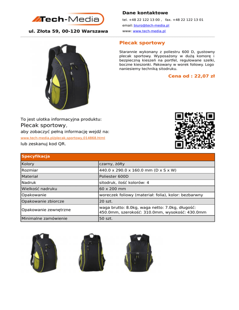 Dane kontaktowe tel. +48 22 122 13 00 , fax. +48 22 122 13 01 email: [email protected] ul. Złota 59, 00-120 Warszawa www: www.tech-media.pl Plecak sportowy Starannie wykonany z poliestru 600 D, gustowny plecak sportowy. Wyposażony w dużą komorę i bezpieczną kieszeń na portfel, regulowane szelki, boczne kieszonki. Pakowany w worek foliowy. Logo naniesiemy techniką sitodruku. Cena od : 22,07 zł To jest ulotka informacyjna produktu: Plecak sportowy, aby zobaczyć pełną informację wejdź na: www.tech-media.pl/plecak,sportowy,014868.html lub zeskanuj kod QR. Specyfikacja Kolory czarny, żółty Rozmiar 440.0 x 290.0 x 160.0 mm (D x S x W) Materiał Poliester 600D Nadruk sitodruk, ilość kolorów: 4 Wielkość nadruku 60 x 200 mm Opakowanie woreczek foliowy (materiał: folia), kolor: bezbarwny Opakowanie zbiorcze 20 szt. Opakowanie zewnętrzne waga brutto: 8.0kg, waga netto: 7.0kg, długość: 450.0mm, szerokość: 310.0mm, wysokość: 430.0mm Minimalne zamówienie 50 szt.