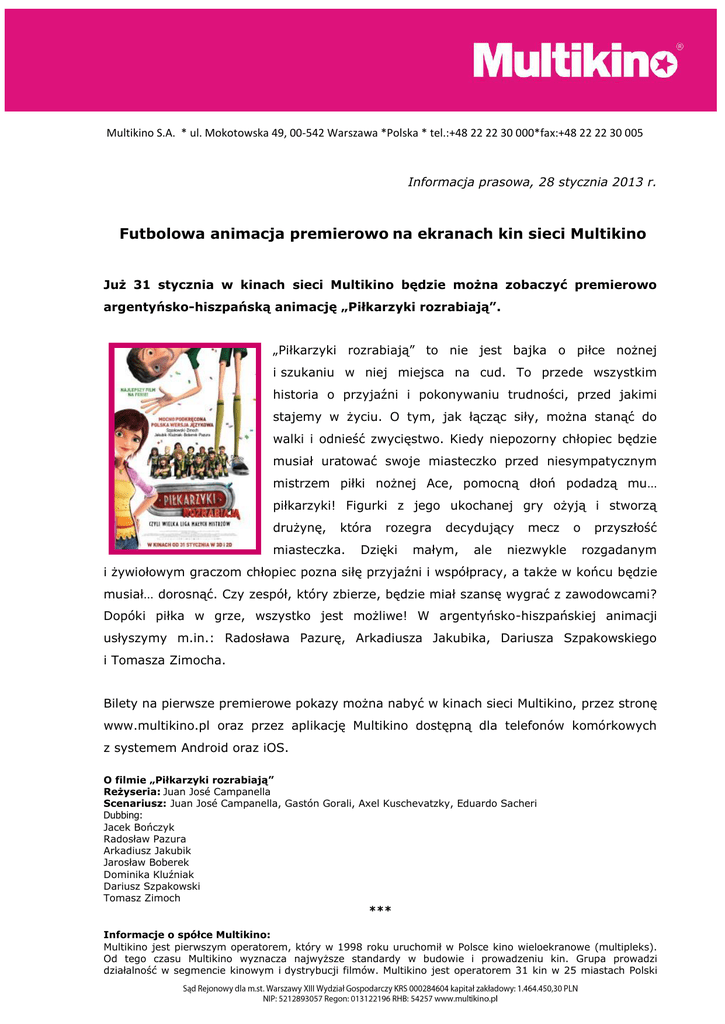 Multikino S.A. * ul. Mokotowska 49, 00-542 Warszawa *Polska * tel.:+48 22 22 30 000*fax:+48 22 22 30 005 Informacja prasowa, 28 stycznia 2013 r. Futbolowa animacja premierowo na ekranach kin sieci Multikino Już 31 stycznia w kinach sieci Multikino będzie można zobaczyć premierowo argentyńsko-hiszpańską animację „Piłkarzyki rozrabiają”. „Piłkarzyki rozrabiają” to nie jest bajka o piłce nożnej i szukaniu w niej miejsca na cud. To przede wszystkim historia o przyjaźni i pokonywaniu trudności, przed jakimi stajemy w życiu. O tym, jak łącząc siły, można stanąć do walki i odnieść zwycięstwo. Kiedy niepozorny chłopiec będzie musiał uratować swoje miasteczko przed niesympatycznym mistrzem piłki nożnej Ace, pomocną dłoń podadzą mu… piłkarzyki! Figurki z jego ukochanej gry ożyją i stworzą drużynę, która miasteczka. rozegra Dzięki decydujący małym, ale mecz niezwykle o przyszłość rozgadanym i żywiołowym graczom chłopiec pozna siłę przyjaźni i współpracy, a także w końcu będzie musiał… dorosnąć. Czy zespół, który zbierze, będzie miał szansę wygrać z zawodowcami? Dopóki piłka w grze, wszystko jest możliwe! W argentyńsko-hiszpańskiej animacji usłyszymy m.in.: Radosława Pazurę, Arkadiusza Jakubika, Dariusza Szpakowskiego i Tomasza Zimocha. Bilety na pierwsze premierowe pokazy można nabyć w kinach sieci Multikino, przez stronę www.multikino.pl oraz przez aplikację Multikino dostępną dla telefonów komórkowych z systemem Android oraz iOS. O filmie „Piłkarzyki rozrabiają” Reżyseria: Juan José Campanella Scenariusz: Juan José Campanella, Gastón Gorali, Axel Kuschevatzky, Eduardo Sacheri Dubbing: Jacek Bończyk Radosław Pazura Arkadiusz Jakubik Jarosław Boberek Dominika Kluźniak Dariusz Szpakowski Tomasz Zimoch *** Informacje o spółce Multikino: Multikino jest pierwszym operatorem, który w 1998 roku uruchomił w Polsce kino wieloekranowe (multipleks). Od tego czasu Multikino wyznacza najwyższe standardy w budowie i prowadzeniu kin. Grupa prowadzi działalność w segmencie kinowym i dystrybucji filmów. Multikino jest operatorem 31 kin w 25 miastach Polski z łączną liczbą 253 ekranów i 53 716 miejscami. W sierpniu 2007 r. Multikino otworzyło wyjątkowe kino w centrum handlowym Złote Tarasy w Warszawie. Obiekt składa się z 8 nowoczesnych sal, w tym Sali Premierowej na 777 osób, wyposażonej w projektory cyfrowe Barco DP 4K, fenomenalny system dźwięku Martin Audio i największy w Europie ekran przystosowany do projekcji cyfrowej (prawie 300 m2). W sierpniu 2010 roku Grupa otworzyła pierwsze kino za granicą w Rydze (8 ekranów i 1620 miejsc), a we wrześniu w Wilnie (7 ekranów i 1547 miejsca). Multikino to więcej niż kino! To największe premiery filmowe oraz koncerty, maratony, transmisje sportowe, Opery HD, Kino na obcasach, Multibabykino i wiele więcej. Multikino to także oryginalna sieć kawiarni Cavablanca Cinema Cafe. Od lat Multikino jest partnerem najważniejszych festiwali filmowych w Polsce w tym Festiwalu Polskich Filmów Fabularnych w Gdyni, Camerimage i Warszawskiego Festiwalu Filmowego. Multikino jest w gronie światowych liderów kinowej cyfryzacji, dzięki wyposażeniu sal kinowych w projektory firmy BARCO i systemy do projekcji trójwymiarowej Dolby 3D. Sieć z powodzeniem prezentuje w technologii 3D: filmy, koncerty, wydarzenia sportowe, opery oraz balet. Multikino jest liderem cyfryzacji w Europie czyli technologicznego i jakościowego przełomu w branży kinowej. Kontakt dla mediów: Natalia Kaleta-Nguyen, Specjalista ds. PR e-mail: [email protected] tel.: +48 519 520 984