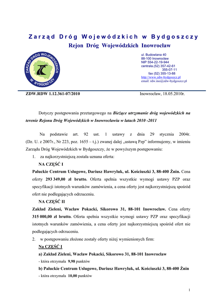 Zarząd Dróg Wojewódzkich w Bydgoszczy Rejon Dróg Wojewódzkich Inowrocław WOJE ÓG W DR KICH DZ ZARZĄD Ó ul. Budowlana 40 88-100 Inowrocław NIP 554-22-19-944 centrala.(52) 357-42-61 355-07-11 fax (52) 355-13-88 http://www.zdw-bydgoszcz.pl email: [email protected] Y W BY DGOSZ C Z Inowrocław, 18.05.2010r. ZDW.RDW 1.12.361-07/2010 Dotyczy postępowania przetargowego na BieŜące utrzymanie dróg wojewódzkich na terenie Rejonu Dróg Wojewódzkich w Inowrocławiu w latach 2010 -2011 Na podstawie art. 92 ust. 1 ustawy z dnia 29 stycznia 2004r. (Dz. U. z 2007r., Nr 223, poz. 1655 – t.j.) zwanej dalej „ustawą Pzp” informujemy, w imieniu Zarządu Dróg Wojewódzkich w Bydgoszczy, Ŝe w powyŜszym postępowaniu: 1. za najkorzystniejszą została uznana oferta: NA CZĘŚĆ I Pałuckie Centrum Usługowe, Dariusz Hawryluk, ul. Kościuszki 3, 88-400 śnin. Cena oferty 293 349,00 zł brutto. Oferta spełnia wszystkie wymogi ustawy PZP oraz specyfikacji istotnych warunków zamówienia, a cena oferty jest najkorzystniejszą spośród ofert nie podlegających odrzuceniu. NA CZĘŚĆ II Zakład Zieleni, Wacław Pokacki, Sikorowo 31, 88-101 Inowrocław. Cena oferty 315 000,00 zł brutto. Oferta spełnia wszystkie wymogi ustawy PZP oraz specyfikacji istotnych warunków zamówienia, a cena oferty jest najkorzystniejszą spośród ofert nie podlegających odrzuceniu. 2. w postępowaniu złoŜone zostały oferty niŜej wymienionych firm: Na CZĘŚĆ I a) Zakład Zieleni, Wacław Pokacki, Sikorowo 31, 88-101 Inowrocław - która otrzymała 9,98 punktów b) Pałuckie Centrum Usługowe, Dariusz Hawryluk, ul. Kościuszki 3, 88-400 śnin - która otrzymała 10,00 punktów 1 Na CZĘŚĆ II a) Zakład Zieleni Wacław Pokacki, Sikorowo 31, 88-101 Inowrocław - która otrzymała 10 punktów b) Pałuckie Centrum Usługowe, Dariusz Hawryluk, ul. Kościuszki 3, 88-400 śnin - która otrzymała 9,11 Punktów c) Firma Handlowo – Usługowa s.c. Ryszard i Maria Szydłowscy, ul. Piłsudskiego 48, 87-820 Kowal - która została odrzucona z postępowania na podstawie art. 89 ust 1 pkt. 4 „ustawy Pzp” 3. Łącznie wszystkim ofertom przyznano: Na CZĘŚĆ I: 19,98 punktów. Na CZĘŚĆ II: 19,11 punktów. 4. Z postępowania nie wykluczono Ŝadnego Wykonawcy. 5. W postępowaniu odrzucono na podstawie art. 89 ust. 1 pkt. 4 „ustawy Pzp” Firmę Handlowo – Usługową s.c. Ryszard i Maria Szydłowscy, ul. Piłsudskiego 48, 87-820 Kowal Komisja przetargowa w trakcie obrad w dniu 14.05.2010r. stwierdziła, iŜ treść ofert ww. wykonawcy jest niezgodna z treścią SIWZ. Zamawiający w dniu 30 kwietnia 2010r. dokonał zmiany treści SWIZ w zakresie sposobu rozliczania, płatności i odbioru wykonywanych usług, zmianie uległ takŜe formularz oferty i „ślepy” kosztorys ofertowy. Zmiana został umieszczona na stronie internetowej Zamawiającego oraz w siedzibie Zamawiającego w dniu 30.04.2010.r Wykonawca nie uwzględnił zmian wprowadzonych do SIWZ w swojej ofercie, w związku z powyŜszym treść oferty nie odpowiada treści SIWZ, taki stan faktyczny wypełnia dyspozycję przepisu art. 89 ust. 1 pkt. 4 „ustawy PZP”, w związku z czym oferta w/w wykonawcy została odrzucona. 6. Zamawiający zamierza podpisać umowy z wykonawcami po upływie 10 dni od dnia przesłania niniejszego zawiadomienia wykonawcom. Na czynności podjęte przez Zamawiającego w postępowaniu przysługują środki ochrony prawnej przewidziane w art. 179 – 183 „ustawy”. 2