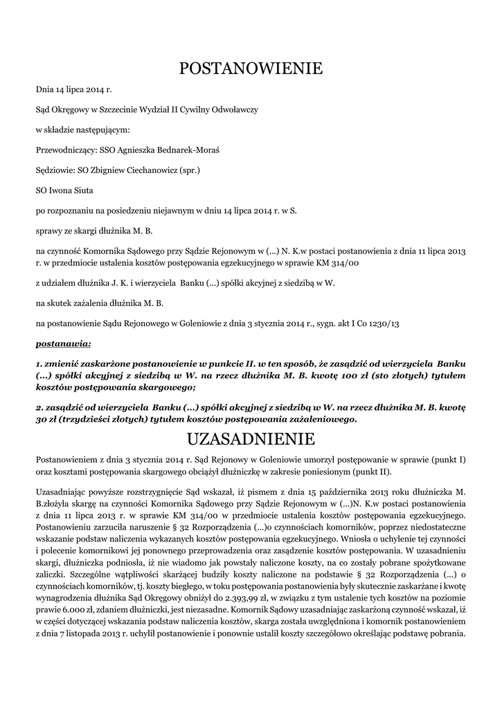 POSTANOWIENIE Dnia 14 lipca 2014 r. Sąd Okręgowy w Szczecinie Wydział II Cywilny Odwoławczy w składzie następującym: Przewodniczący: SSO Agnieszka Bednarek-Moraś Sędziowie: SO Zbigniew Ciechanowicz (spr.) SO Iwona Siuta po rozpoznaniu na posiedzeniu niejawnym w dniu 14 lipca 2014 r. w S. sprawy ze skargi dłużnika M. B. na czynność Komornika Sądowego przy Sądzie Rejonowym w (...) N. K.w postaci postanowienia z dnia 11 lipca 2013 r. w przedmiocie ustalenia kosztów postępowania egzekucyjnego w sprawie KM 314/00 z udziałem dłużnika J. K. i wierzyciela Banku (...) spółki akcyjnej z siedzibą w W. na skutek zażalenia dłużnika M. B. na postanowienie Sądu Rejonowego w Goleniowie z dnia 3 stycznia 2014 r., sygn. akt I Co 1230/13 postanawia: 1. zmienić zaskarżone postanowienie w punkcie II. w ten sposób, że zasądzić od wierzyciela Banku (...) spółki akcyjnej z siedzibą w W. na rzecz dłużnika M. B. kwotę 100 zł (sto złotych) tytułem kosztów postępowania skargowego; 2. zasądzić od wierzyciela Banku (...) spółki akcyjnej z siedzibą w W. na rzecz dłużnika M. B. kwotę 30 zł (trzydzieści złotych) tytułem kosztów postępowania zażaleniowego. UZASADNIENIE Postanowieniem z dnia 3 stycznia 2014 r. Sąd Rejonowy w Goleniowie umorzył postępowanie w sprawie (punkt I) oraz kosztami postępowania skargowego obciążył dłużniczkę w zakresie poniesionym (punkt II). Uzasadniając powyższe rozstrzygnięcie Sąd wskazał, iż pismem z dnia 15 października 2013 roku dłużniczka M. B.złożyła skargę na czynności Komornika Sądowego przy Sądzie Rejonowym w (...)N. K.w postaci postanowienia z dnia 11 lipca 2013 r. w sprawie KM 314/00 w przedmiocie ustalenia kosztów postępowania egzekucyjnego. Postanowieniu zarzuciła naruszenie § 32 Rozporządzenia (...)o czynnościach komorników, poprzez niedostateczne wskazanie podstaw naliczenia wykazanych kosztów postępowania egzekucyjnego. Wniosła o uchylenie tej czynności i polecenie komornikowi jej ponownego przeprowadzenia oraz zasądzenie kosztów postępowania. W uzasadnieniu skargi, dłużniczka podniosła, iż nie wiadomo jak powstały naliczone koszty, na co zostały pobrane spożytkowane zaliczki. Szczególne wątpliwości skarżącej budziły koszty naliczone na podstawie § 32 Rozporządzenia (...) o czynnościach komorników, tj. koszty biegłego, w toku postępowania postanowienia były skutecznie zaskarżane i kwotę wynagrodzenia dłużnika Sąd Okręgowy obniżył do 2.393,99 zł, w związku z tym ustalenie tych kosztów na poziomie prawie 6.000 zł, zdaniem dłużniczki, jest niezasadne. Komornik Sądowy uzasadniając zaskarżoną czynność wskazał, iż w części dotyczącej wskazania podstaw naliczenia kosztów, skarga została uwzględniona i komornik postanowieniem z dnia 7 listopada 2013 r. uchylił postanowienie i ponownie ustalił koszty szczegółowo określając podstawę pobrania. Odnosząc się do wysokości należności biegłych wskazał, że powołane przez skarżącą postanowienie o obniżeniu wynagrodzenia dotyczyło postępowania sądowego. W toku postępowania egzekucyjnego powstały natomiast wydatki gotówkowe stanowiące należność biegłego na sumę 5.940,76 zł. Mając na uwadze, że postanowieniem z dnia 7 listopada 2013 r. Komornik uchylił postanowienie z dnia 11 lipca 2013 roku i orzekł od nowa o kosztach postępowania w ocenie Sądu Rejonowego nie było podstaw do rozpatrywania skargi na postanowienie, które zostało uchylone. W tej sytuacji w ocenie Sądu stało się zbędnym wydawanie orzeczenia w przedmiocie rozpoznania skargi dłużnika na czynność Komornika, którego przedmiotem miała być racja bytu postanowienia które zostało uchylone. W związku z powyższym Sąd na podstawie przepisu art. 355 § 1 k.p.c. w zw. z art. 13 § 2 k.p.c. umorzył postępowanie wszczęte na skutek skargi na tą czynność Komornika. Sąd Rejonowy mając na względzie art. 108 k.p.c. w zw. z art. 13 § 2 k.p.c. orzekł o kosztach postępowania skargowego. Zażalenie na powyższe postanowienie złożyła dłużniczka M. B., zaskarżając je w części, tj. co do punktu II dodanego postanowieniem z dnia 20 lutego 2014 r. Skarżąca orzeczeniu temu zarzuciła naruszenie art. 98 § 1 w zw. z art. 13 § 2 k.p.c. Skarżąca wniosła o: zmianę tego rozstrzygnięcia poprzez orzeczenie, że kosztami postępowania skargowego obciąża się wierzyciela i z tego tytułu zasądza się od niego na rzecz dłużniczki kwotę 100 zł tytułem zwrotu kosztów postępowania skargowego; zasądzenie na jej rzecz od wierzyciela zwrotu kosztów postępowania zażaleniowego. Skarżąca podniosła, iż w postępowaniu ze skargi na czynność komornika obowiązuje zasada odpowiedzialności za wynik sprawy (art. 98 k.p.c.), zatem skoro jej skargę komornik uwzględnił, to kosztami postępowania skargowego powinien zostać obciążony wierzyciel. Skarżąca zaznaczyła, iż Sąd odwołuje się do tego, że wierzyciel nie miał wpływu na ustalenie opłat przez komornika, ale w jej ocenie argumentu tego nie można podzielić, gdyż komornik działa na zlecenie wierzyciela i w tym sensie wierzyciel ponosi procesową odpowiedzialność za jego działania względem dłużnika, komornik co do zasady nie jest bowiem stroną postępowania skargowego. Sąd Okręgowy zważył, co następuje: Zażalenie dłużniczki M. B. skutkowało rozstrzygnięciem o charakterze reformatoryjnym. Ustosunkowując się do zażalenia Sąd Okręgowy wskazuje, iż z przepisu art. 770 k.p.c. wynika zasada, że dłużnik powinien zwrócić wierzycielowi tylko koszty niezbędne do celowego przeprowadzenia egzekucji. W uchwale z dnia z dnia(...)(...) Sąd Najwyższy stwierdził, iż w sprawie ze skargi na czynności komornika o kosztach postępowania orzeka sąd na podstawie art. 770 k.p.c. stosując odpowiednio (art. 13 § 2 k.p.c.) w niezbędnym zakresie przepisy o zwrocie kosztów procesu (art. 98-110). Zgodnie z treśc