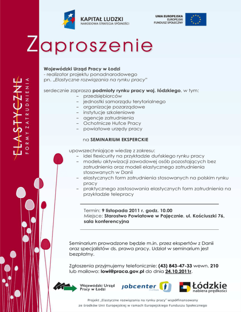 Wojewódzki Urząd Pracy w Łodzi - realizator projektu ponadnarodowego pn. „Elastyczne rozwiązania na rynku pracy” serdecznie zaprasza podmioty rynku pracy woj. łódzkiego, w tym: - przedsiębiorców - jednostki samorządu terytorialnego - organizacje pozarządowe - instytucje szkoleniowe - agencje zatrudnienia - Ochotnicze Hufce Pracy - powiatowe urzędy pracy na SEMINARIUM EKSPERCKIE upowszechniające wiedzę z zakresu: - idei flexicurity na przykładzie duńskiego rynku pracy - modelu aktywizacji zawodowej osób pozostających bez zatrudnienia oraz modeli elastycznego zatrudnienia stosowanych w Danii - elastycznych form zatrudnienia stosowanych na polskim rynku pracy - praktycznego zastosowania elastycznych form zatrudnienia na przykładzie telepracy Termin: 9 listopada 2011 r. godz. 10.00 Miejsce: Starostwo Powiatowe w Pajęcznie, ul. Kościuszki 76, sala konferencyjna Seminarium prowadzone będzie m.in. przez ekspertów z Danii oraz specjalistów ds. prawa pracy. Udział w seminarium jest bezpłatny. Zgłoszenia przyjmujemy telefonicznie: (43) 843-47-33 wewn. 210 lub mailowo: [email protected] do dnia 24.10.2011r. PAJĘCZNO 09.11.2011 r. 9 45 -10 00 Rejestracja uczestników 10 00 -10 15 Prezentacja projektu „Elastyczne rozwiązania na rynku pracy” 10 15 - 11 15 Duńskie rozwiązania na rynku pracy - Idea flexicurity w praktyce – eksperci z Danii: Hanne Marklund, Kaare Sand Isager, Thomas Lund Hansen (JobCenter Aarhus) 11 15 -12 15 12 15 -12 40 12 40 -13 15 Model aktywizacji zawodowej (Well-Box) oraz duńskie modele elastycznego zatrudnienia prezentacje uczestników wizyty studyjnej w Danii Lunch Elastyczne formy zatrudnienia na gruncie prawa pracy - Ewa Ludwiczak - specjalista ds. prawa pracy (WUP w Łodzi) 13 15 -13 50 Elastyczne formy zatrudnienia w praktyce (model telepracy) – Iwona Szostak (Politechnika Świętokrzyska Centrum Kształcenia Ustawicznego- realizator projektu EQUAL „Telepraca scala rodzinę”) 14 00 Zakończenie seminarium