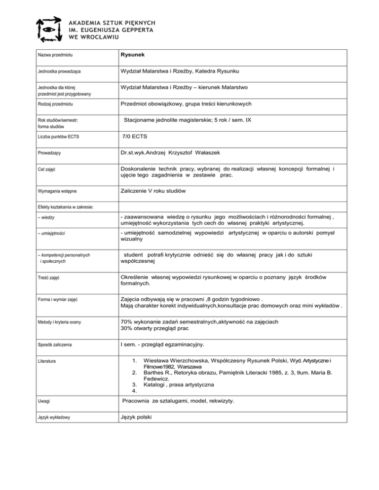 Nazwa przedmiotu Rysunek Jednostka prowadząca Wydział Malarstwa i Rzeźby, Katedra Rysunku Jednostka dla której przedmiot jest przygotowany Wydział Malarstwa i Rzeźby – kierunek Malarstwo Rodzaj przedmiotu Przedmiot obowiązkowy, grupa treści kierunkowych Rok studiów/semestr; forma studiów Liczba punktów ECTS Stacjonarne jednolite magisterskie; 5 rok / sem. IX 7/0 ECTS Prowadzący Dr.st.wyk.Andrzej Krzysztof Wałaszek Cel zajęć Doskonalenie technik pracy, wybranej do realizacji własnej koncepcji formalnej i ujęcie tego zagadnienia w zestawie prac. Wymagania wstępne Zaliczenie V roku studiów Efekty kształcenia w zakresie: – wiedzy - zaawansowana wiedzę o rysunku jego możliwościach i różnorodności formalnej , umiejętność wykorzystania tych cech do własnej praktyki artystycznej. – umiejętności - umiejętność samodzielnej wypowiedzi artystycznej w oparciu o autorski pomysł wizualny – kompetencji personalnych i społecznych student potrafi krytycznie odnieść się do własnej pracy jak i do sztuki współczesnej Treść zajęć Określenie własnej wypowiedzi rysunkowej w oparciu o poznany język środków formalnych. Forma i wymiar zajęć Zajęcia odbywają się w pracowni ,8 godzin tygodniowo . Mają charakter korekt indywidualnych,konsultacje prac domowych oraz mini wykładów . Metody i kryteria oceny 70% wykonanie zadań semestralnych,aktywność na zajęciach 30% otwarty przegląd prac Sposób zaliczenia I sem. - przegląd egzaminacyjny. Literatura 1. 2. 3. 4. Uwagi Język wykładowy Wiesława Wierzchowska, Współczesny Rysunek Polski, Wyd. Artystyczne i Filmowe1982, Warszawa Barthes R., Retoryka obrazu, Pamiętnik Literacki 1985, z. 3, tłum. Maria B. Fedewicz. Katalogi , prasa artystyczna Pracownia ze sztalugami, model, rekwizyty. Język polski