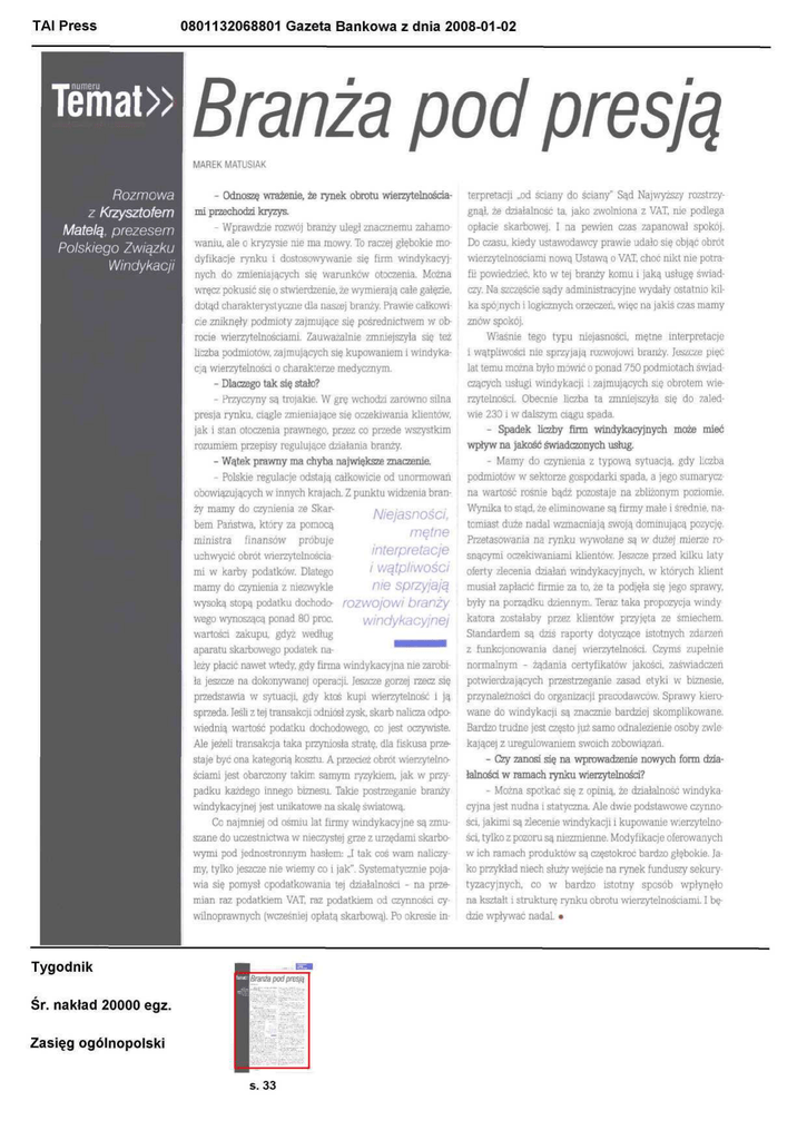TAI Press 0801132068801 Gazeta Bankowa z dnia 2008-01-02 Temat» ^•numeru • w k. Branża pod presją MAREK MATUSIAK Rozmowa z Krzysztofem Matelą, prezesem Polskiego Związku Windykacji - Odnoszę wrażenie, że rynek obrotu wierzytelnościami pizechodzi kryzys. - Wprawdzie rozwój branży uległ znacznemu zahamowaniu, ale o kryzysie nie ma mowy. To raczej głębokie modyfikacje rynku i dostosowywanie się firm windykacyjnych do zmieniających się warunków otoczenia. Można wręcz pokusić się o stwierdzenie, że wymierają cale gałęzie, dotąd charakterystyczne dla naszej branży. Prawie całkowicie zniknęły podmioty zajmujące się pośrednictwem w obrocie wierzytelnościami. Zauważalnie zmniejszyła się też liczba podmiotów, zajmujących się kupowaniem i windykacją wierzytelności o charakterze medycznym. - Dlaczego tak się stało? - Przyczyny są trojakie. W grę wchodzi zarówno silna presja rynku, ciągle zmieniające się oczekiwania klientów, jak i stan otoczenia prawnego, przez co przede wszystkim rozumiem przepisy regulujące działania branży. - Wątek prawny ma chyba największe znaczenie. - Polskie regulacje odstają całkowicie od unormowań obowiązujących w innych krajach. Z punktu widzenia branży mamy do czynienia ze SkarNiejasności, bem Państwa, który za pomocą mętne ministra finansów próbuje interpretacje uchwycić obrót wierzytelnościai wątpliwości mi w karby podatków. Dlatego nie sprzyjają mamy do czynienia z niezwykle wysoką stopą podatku dochodo- rOZWOJOWI branży wego wynoszącą ponad 80 proc. windykacyjnej wartości zakupu, gdyż według aparatu skarbowego podatek należy płacić nawet wtedy, gdy firma windykacyjna nie zarobiła jeszcze na dokonywanej operacji. Jeszcze gorzej rzecz się przedstawia w sytuacji, gdy ktoś kupi wierzytelność l ją sprzeda. Jeśli z tej transakcji odniósł zysk, skarb nalicza odpowiednią wartość podatku dochodowego, co jest oczywiste. Ale jeżeli transakcja taka przyniosła stratę, dla fiskusa przestaje być ona kategorią kosztu. A przecież obrót wierzytelnościami jest obarczony takim samym ryzykiem, jak w przypadku każdego innego biznesu. Takie postrzeganie branży windykacyjnej jest unikatowe na skalę światową. Cc najmniej od ośmiu lat firmy windykacyjne są zmuszane do uczestnictwa w nieczystej grze z urzędami skarbowymi pod jednostronnym hasłem: „I tak coś wam naliczymy, tylko jeszcze nie wiemy co i jak". Systematycznie pojawia się pomysł opodatkowania tej działalności - na przemian raz podatkiem VAT, raz podatkiem od czynności cywilnoprawnych (wcześniej opłatą skarbową). Po okresie in- Tygodnik Śr. nakład 20000 egz. Zasięg ogólnopolski s. 33 terpretacji „od ściany do ściany" Sąd Najwyższy rozstrzygnął, że działalność ta, jako zwolniona z VAT, nie podlega opłacie skarbowej. I na pewien czas zapanował spokój. Do czasu, kiedy ustawodawcy prawie udało się objąć obrót wierzytelnościami nową Ustawą o VAT, choć nikt nie potrafił powiedzieć, kto w tej branży komu i jaką usługę świadczy. Na szczęście sądy administracyjne wydały ostatnio kilka spójnych i logicznych orzeczeń, więc na jakiś czas mamy znów spokój. Właśnie tego typu niejasności, mętne interpretacje i wątpliwości nie sprzyjają rozwojowi branży. Jeszcze pięć lat temu można było mówić o ponad 750 podmiotach świadczących usługi windykacji i zajmujących się obrotem wierzytelności. Obecnie liczba ta zmniejszyła się do zaledwie 230 i w dalszym ciągu spada. - Spadek liczby firm windykacyjnych może mieć wpływ na jakość świadczonych usług. - Mamy do czynienia z typową sytuacją, gdy liczba podmiotów w sektorze gospodarki spada, a jego sumaryczna wartość rośnie bądź pozostaje na zbliżonym poziomie. Wynika to stąd, że eliminowane są firmy małe i średnie, natomiast duże nadal wzmacniają swoją dominującą pozycję. Przetasowania na rynku wywołane są w dużej mierze rosnącymi oczekiwaniami klientów. Jeszcze przed kilku laty oferty zlecenia działań windykacyjnych, w których klient musiał zapłacić firmie za to, że ta podjęła się jego sprawy, były na porządku dziennym. Teraz taka propozycja windykatora zostałaby przez klientów przyjęta ze śmiechem. Standardem są dziś raporty dotyczące istotnych zdarzeń z funkcjonowania danej wierzytelności. Czymś zupełnie normalnym - żądania certyfikatów jakości, zaświadczeń potwierdzających przestrzeganie zasad etyki w biznesie, przynależności do organizacji pracodawców. Sprawy kierowane do windykacji są znacznie bardziej skomplikowane. Bardzo trudne jest często już samo odnalezienie osoby zwlekającej z uregulowaniem swoich zobowiązań. - Czy zanosi się na wprowadzenie nowych form działalności w ramach rynku wierzytelności? - Można spotkać się z opinią, że działalność windykacyjna jest nudna i statyczna. Ale dwie podstawowe czynności, jakimi są zlecenie windykacji i kupowanie wierzytelności, tylko z pozoru są niezmienne. Modyfikacje oferowanych w ich ramach produktów są częstokroć bardzo głębokie. Jako przykład niech służy wejście na rynek funduszy sekurytyzacyjnych, co w bardzo istotny sposób wpłynęło na kształt i strukturę rynku obrotu wierzytelnościami. I będzie wpływać nadal. •